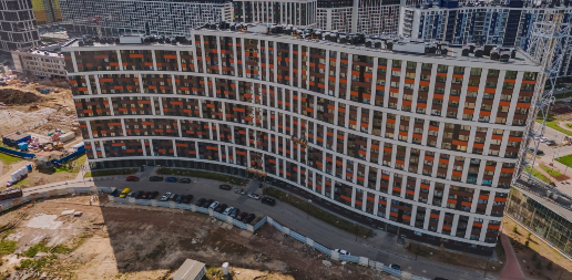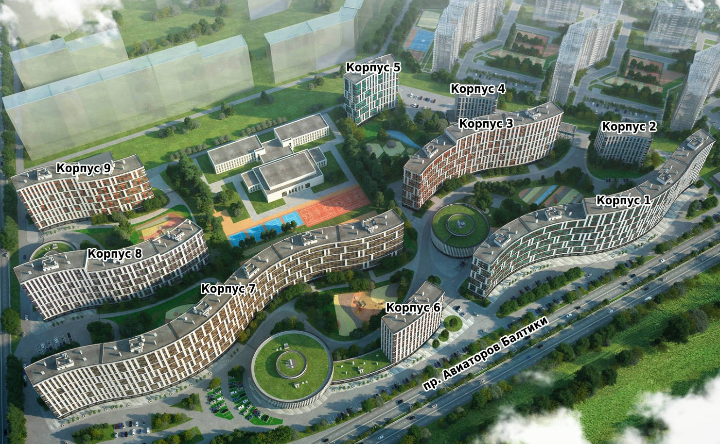 Территория жилого комплекса включает игровые и спортивные площадки, прогулочные зоны, детский сад и школу. На первых этажах находятся коммерческие помещения. Для владельцев автомобилей предусмотрены многоуровневые наземные паркинги.