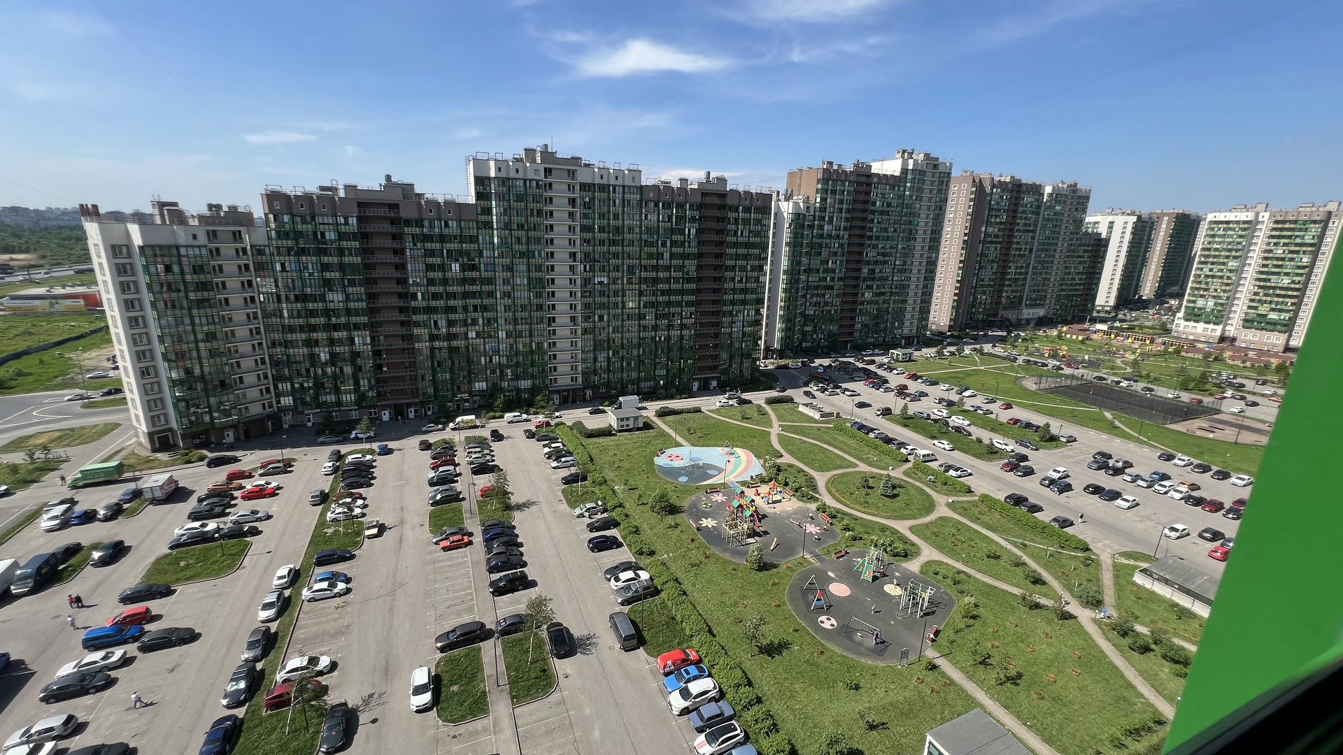 Развитая инфраструктура - рядом много всевозможных магазинов, новый ТРК, несколько школ и дет.садов, медцентров. Быстрый выезд на КАД.