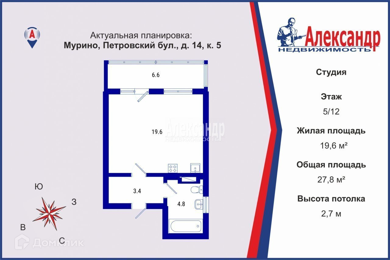 Квартира студия, 27.8 м2, этаж 5 / 12, на продажу в Мурино, Петровский бульвар, 14к5