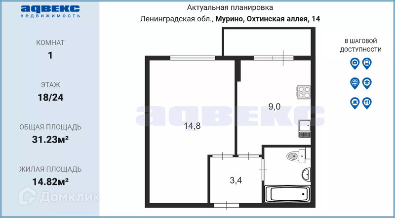 1-комнатная квартира, 31.23 м2, этаж 18 / 24, на продажу в Мурино, Охтинская аллея, 14
