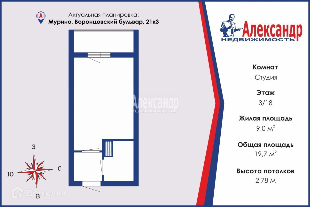 Общая площадь 19.7 м2