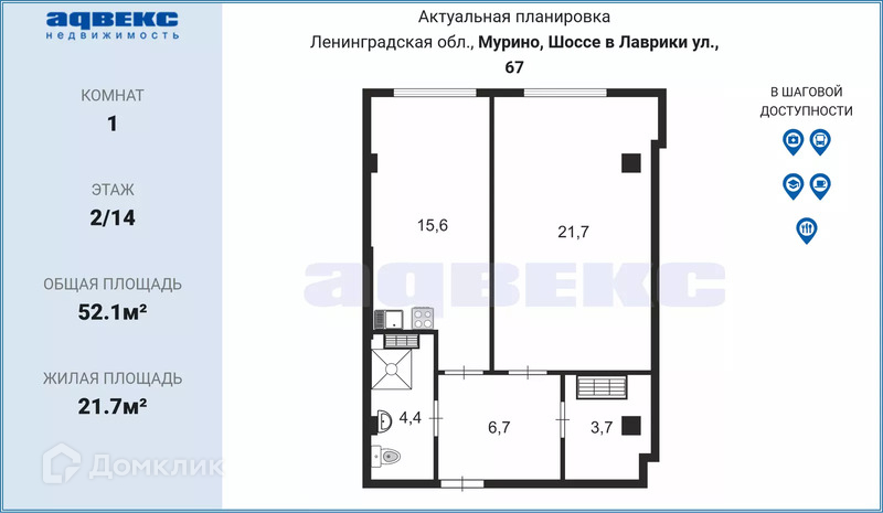 1-комнатная квартира, 52.1 м2, этаж 2 / 14, на продажу в Мурино, улица Шоссе в Лаврики, 67