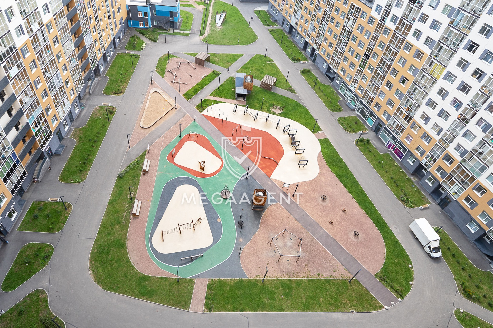 Закрытый двор, с красивой детской площадкой. Подземный и гостевой паркинг. Рядом есть детский сад, поликлиника и всевозможные магазины.