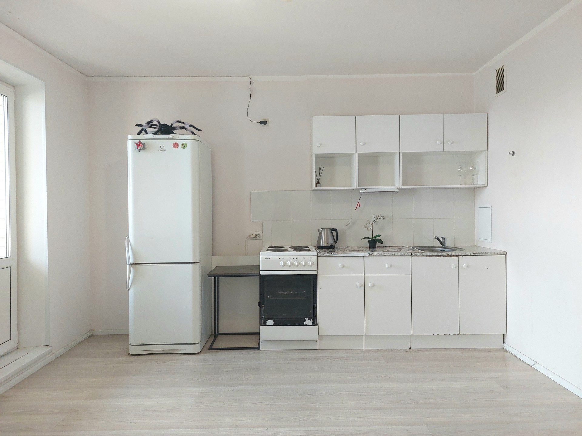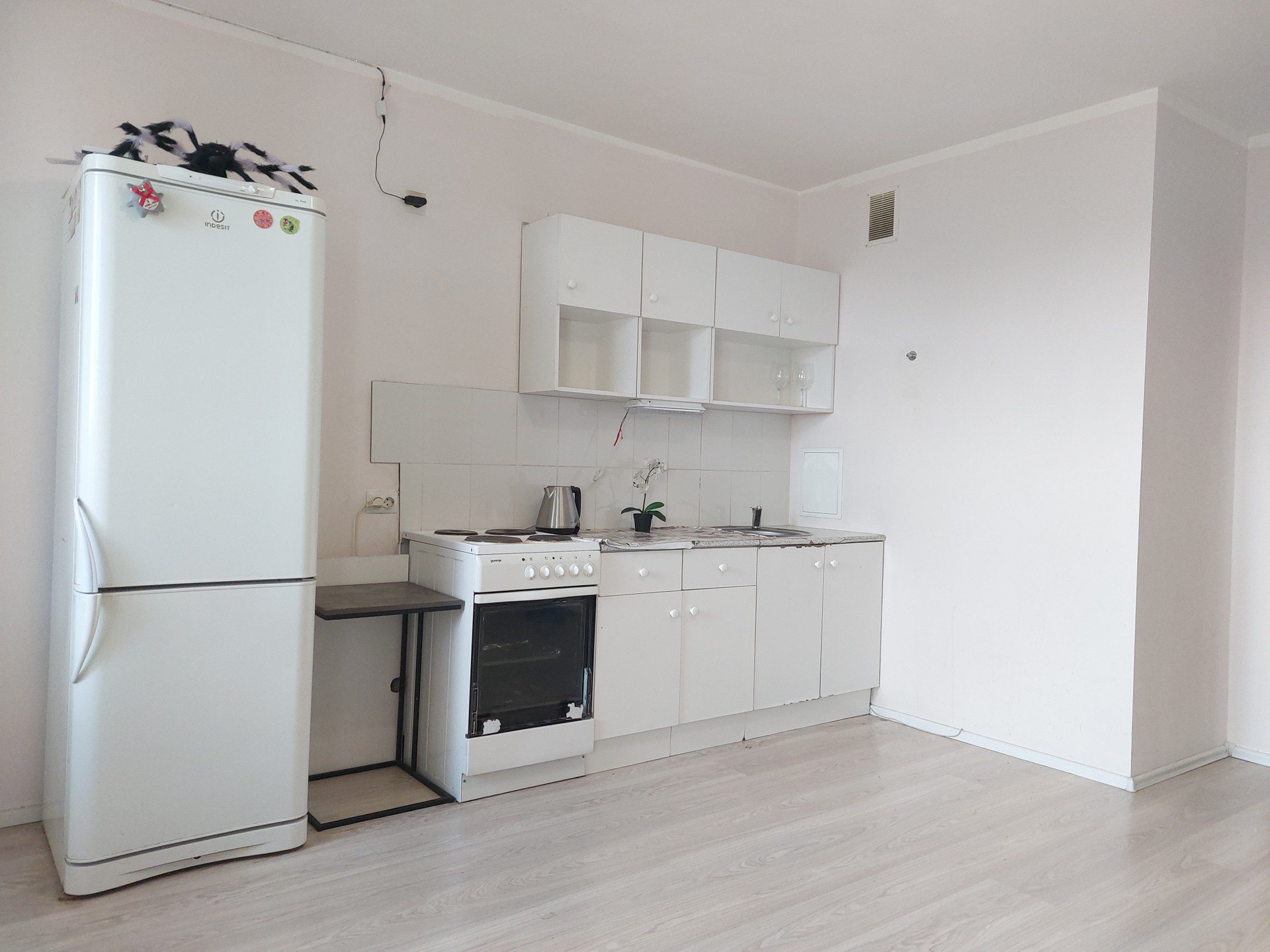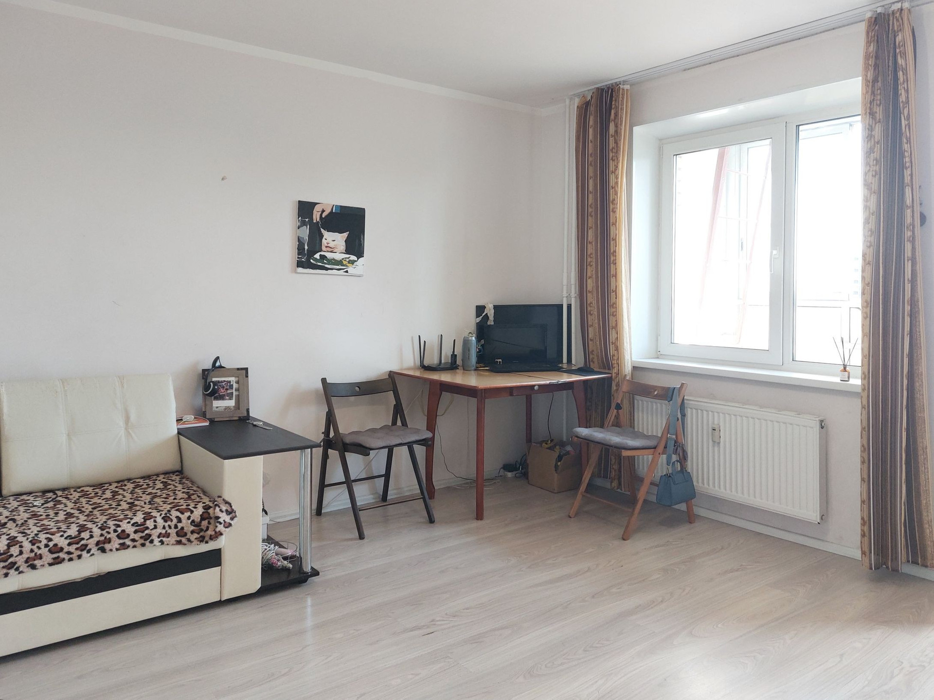 Огромная студия, площадь 29.0 плюс большая лоджия 5.6 кв.м., всего получается 34.6, как нормальная однокомнатная квартира. Состояние хорошее, можно въезжать и жить. Мебель и техника остаются покупателю.