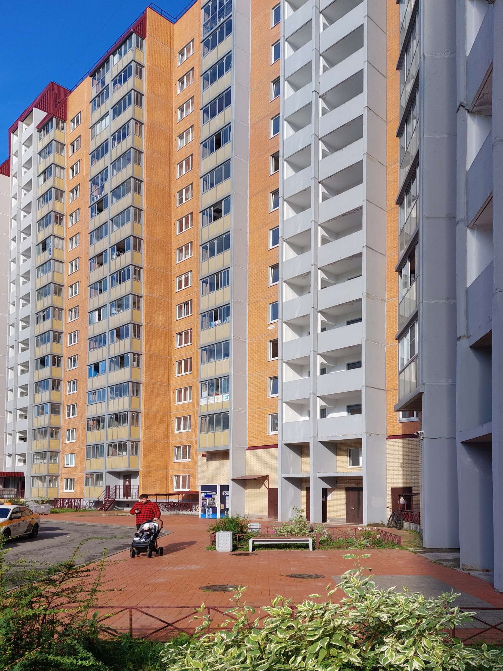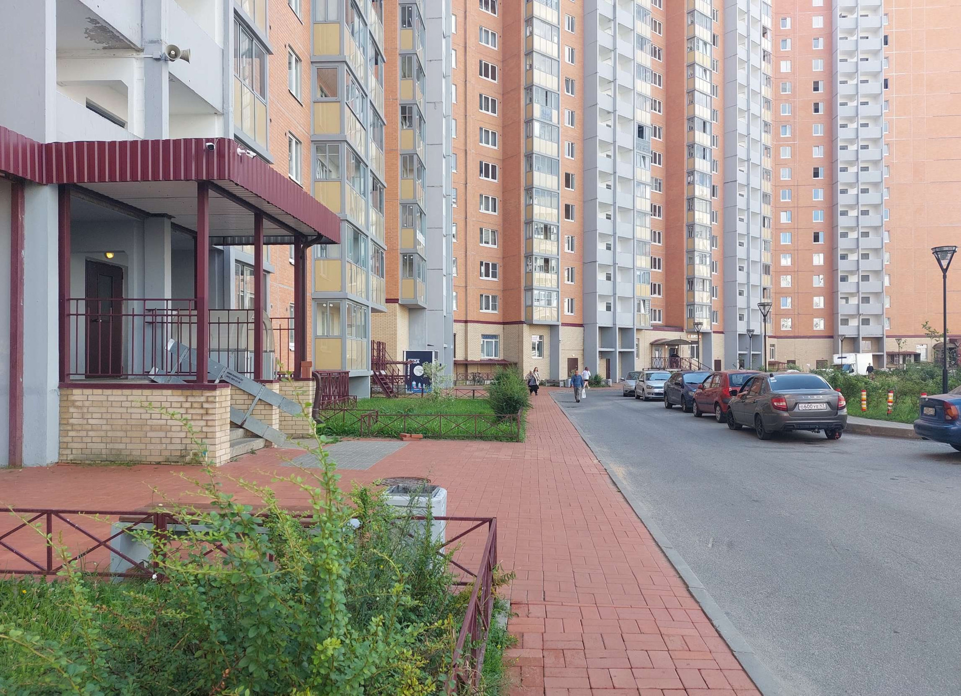 Дом по Муринским меркам небольшой, всего 16 этажей. Во дворе, как положено, зона отдыха с детскими и спортивными площадками. Вокруг дома всегда достаточно парковочных мест.