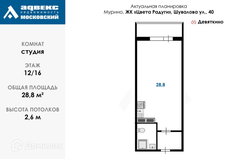 Квартира студия, 28.8 м2, этаж 12 / 16, на продажу в Мурино, улица Шувалова, 40