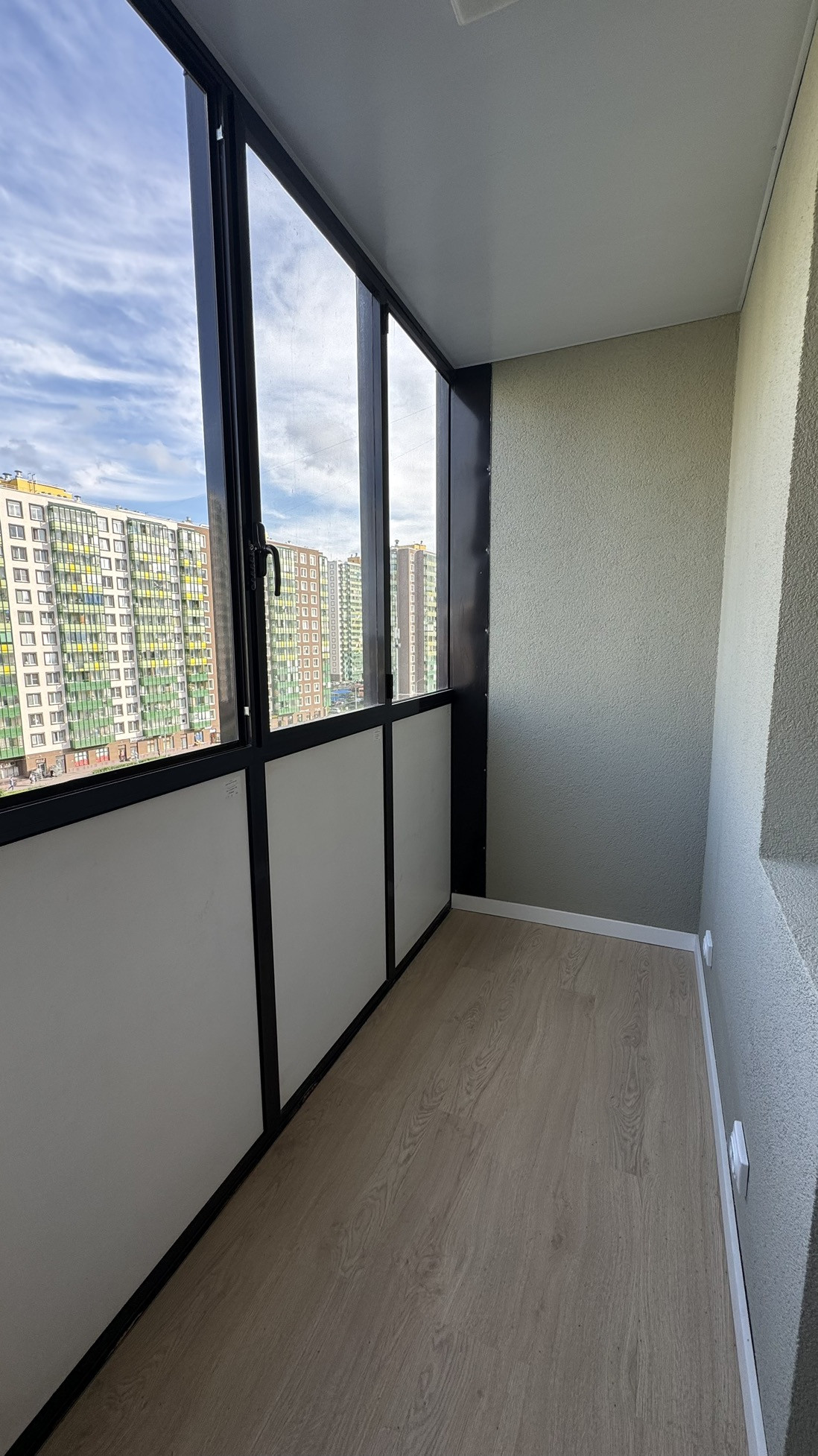 Балконы отремонтирован таким образом, чтобы в дальнейшем сделать в нём ещё одну комнату-кабинет. Проведено электричество, постелен ламинат, утеплён пол и потолок.