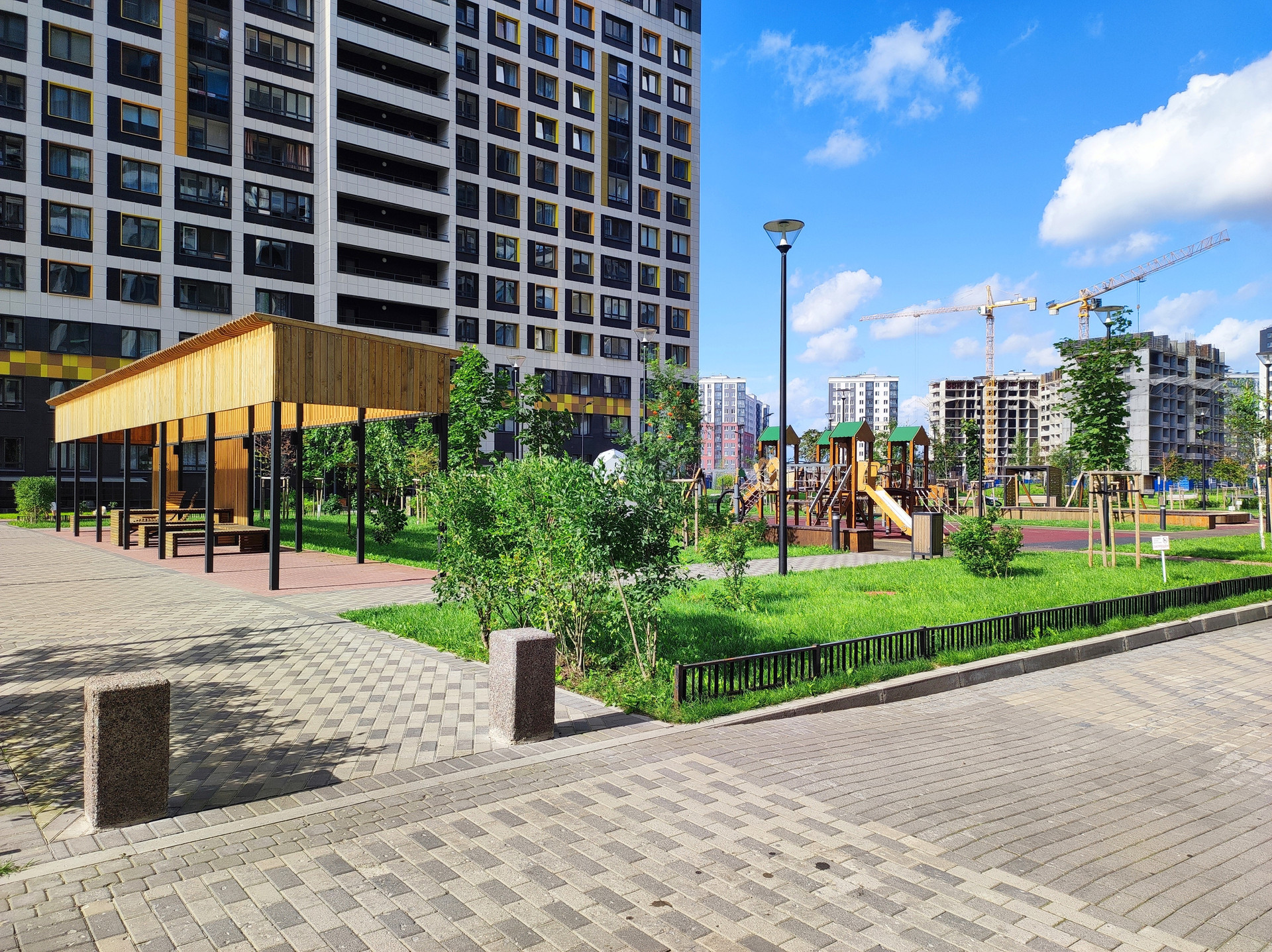 Большой закрытый двор под круглосуточным видеонаблюдением. Детские и спортивные площадки, высажены кустарники и деревья. Благоустройство комплекса одно из лучших в Мурино!