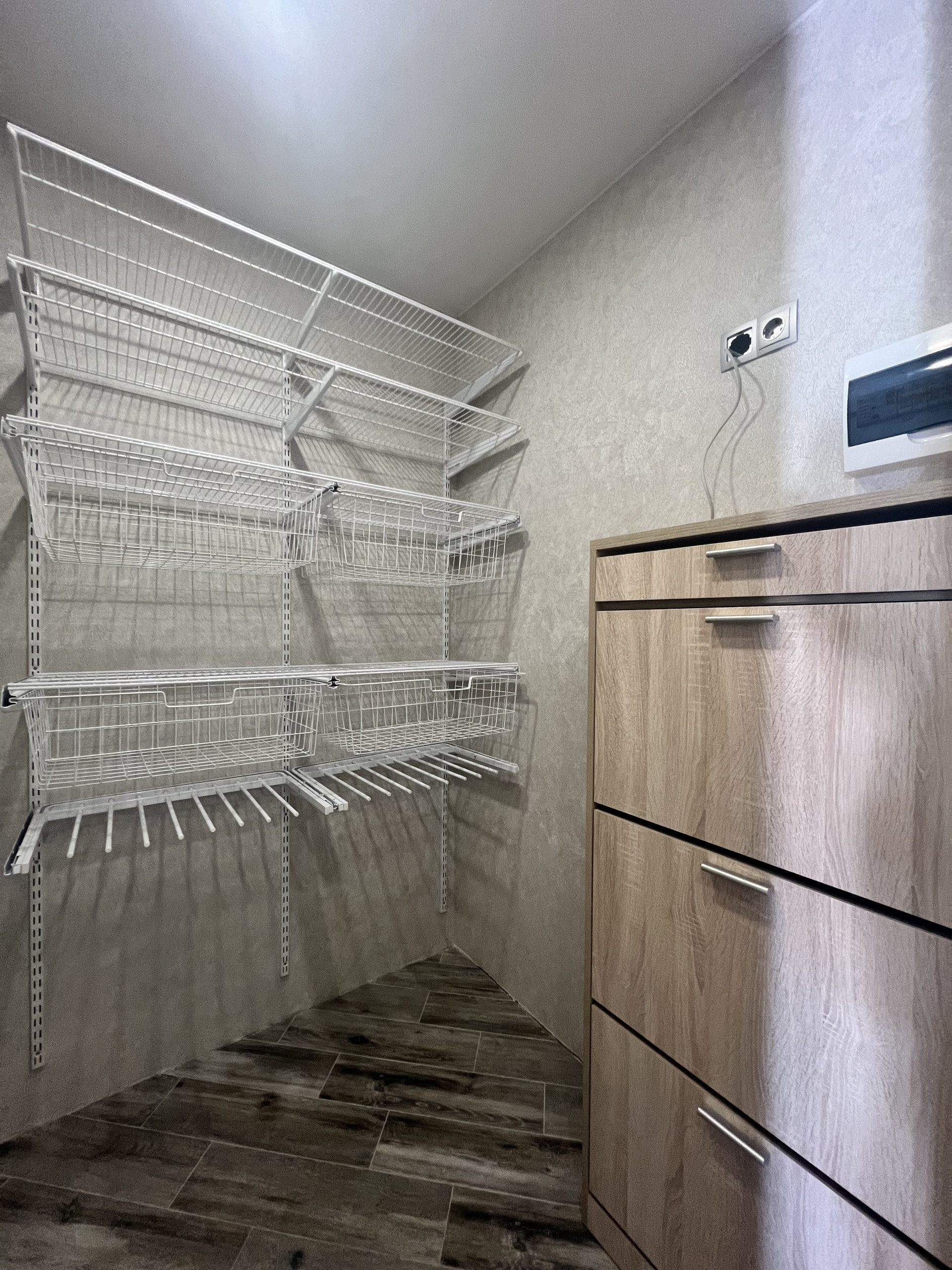 Натяжные потолки, напольное покрытие керамогранит (теплый пол по всей квартире), установлена современная душевая кабина. Оборудована гардеробная с наполнением.