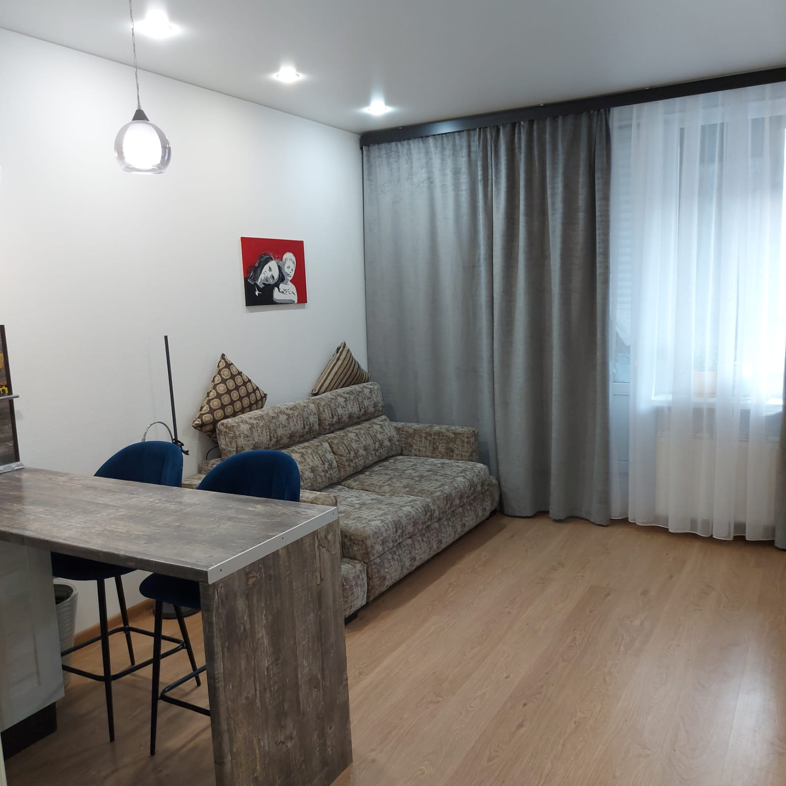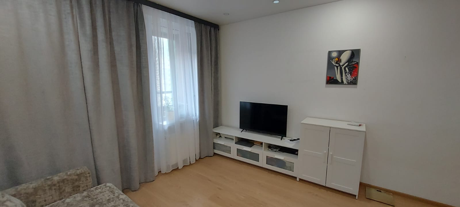 Kухня-гоcтиная 18 кв.м. и застекленная лоджия ориентированы на восток (солнце утром). Санузел совмещенный, ванна новая. В стоимость квартиры входит мебель и бытовая техника.