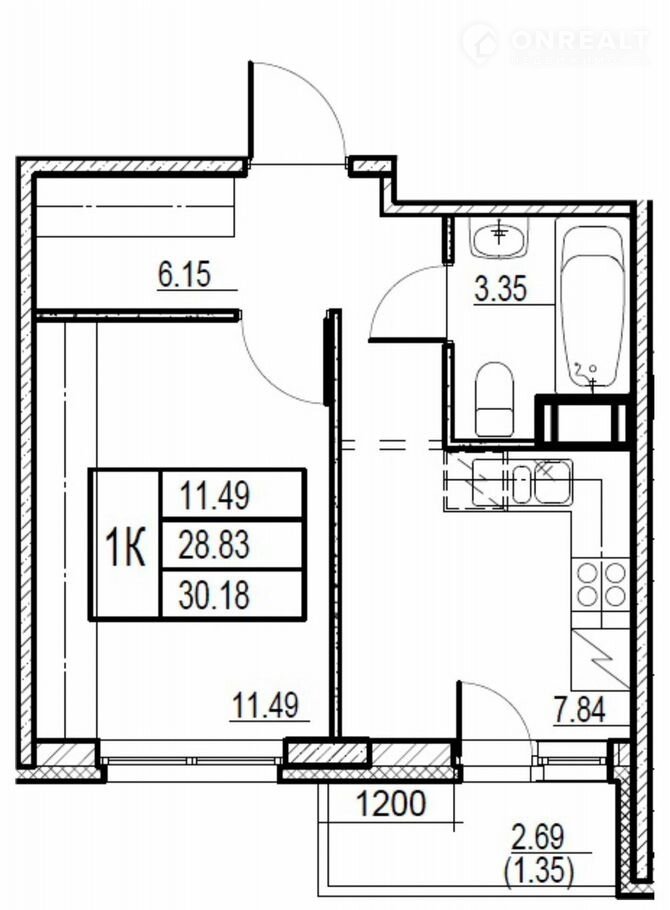 Удобная, классическая, функциональная планировка, компактная кухня 7,84 м², просторная прихожая с гардеробной зоной 6,15 м². Общая площадь квартиры - 29,6 м², высота потолка 3 м.