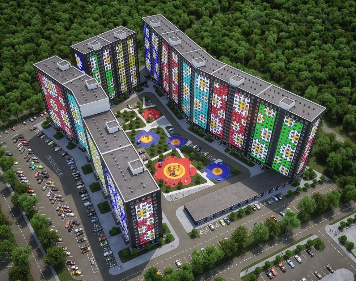 Здание состоит из 4 секций высотностью 18 этажей
