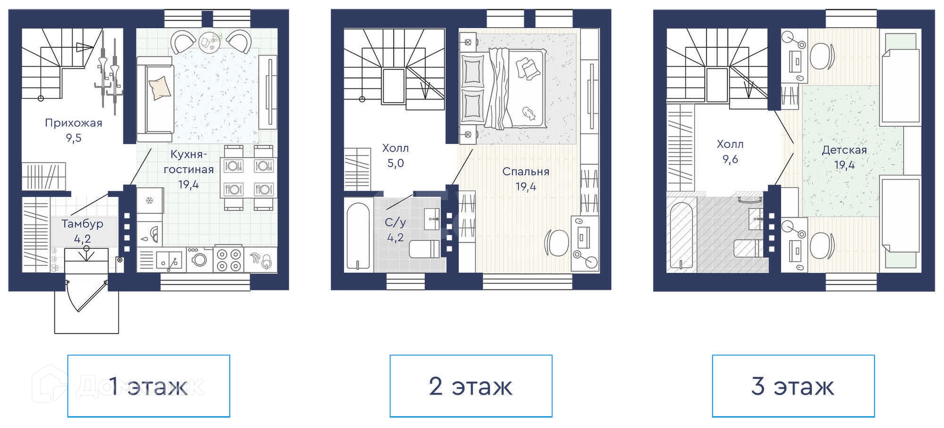 Площадь дома: 90,6 м²Этажность: 3 этажаКоличество спален: 2Год постройки: 2023