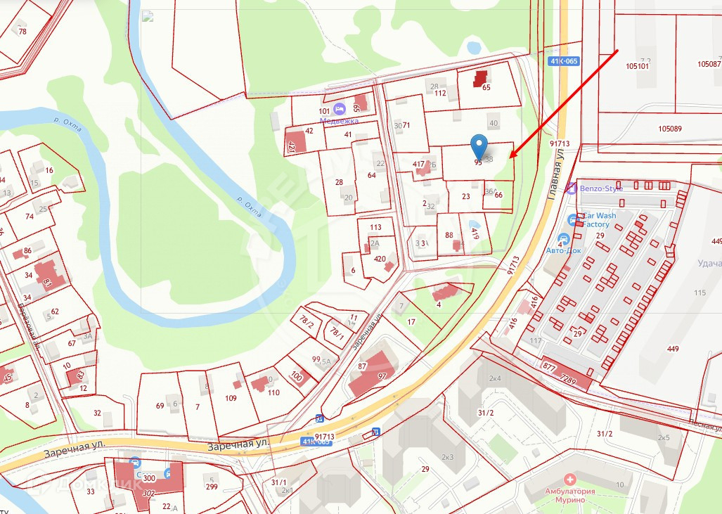 Участок правильной квадратной формы. Одной стороной граничит с ул. Главная пос. Мурино, которая является основной магистралью поселка Мурино в активно развивающемся районе.