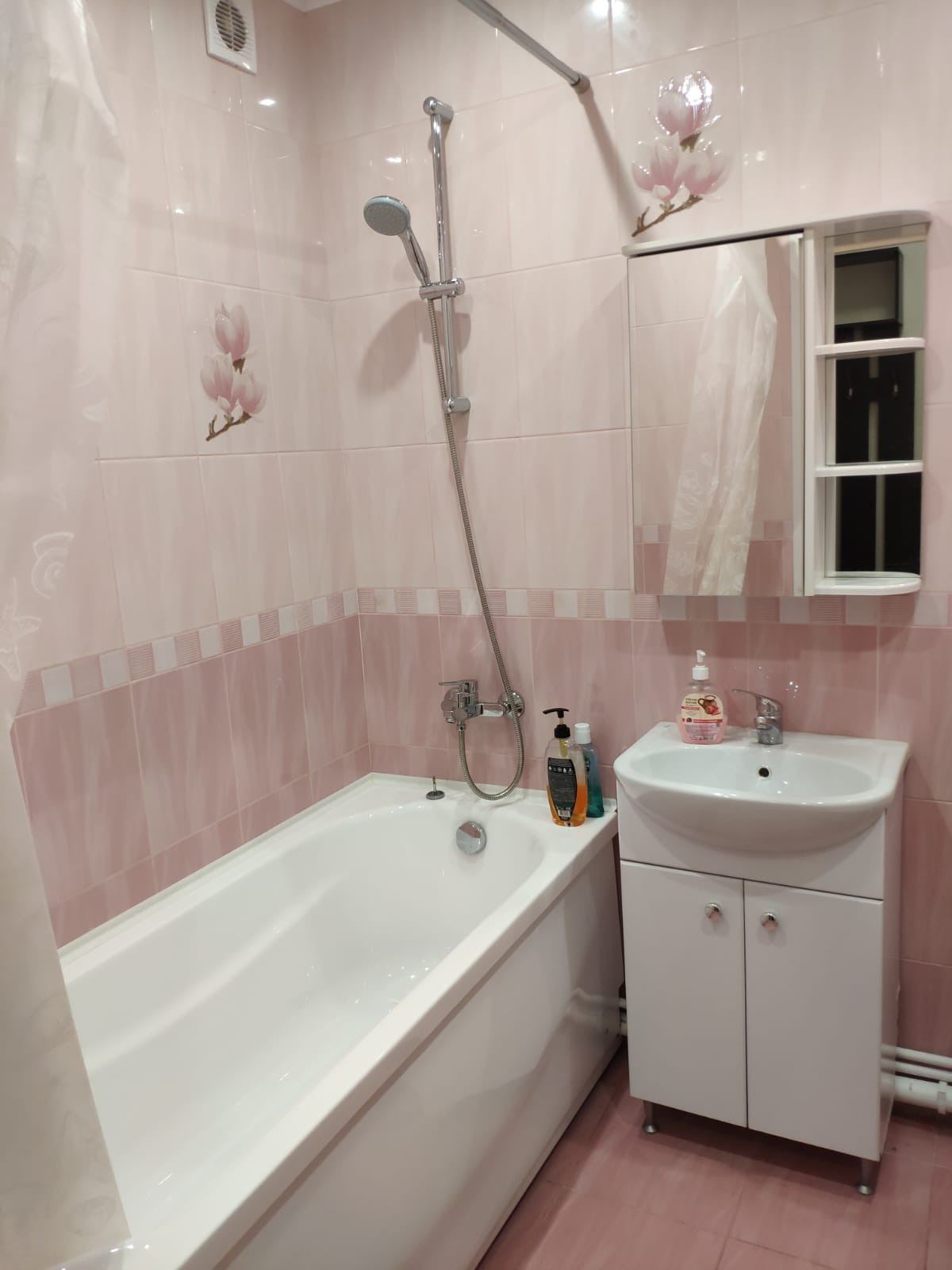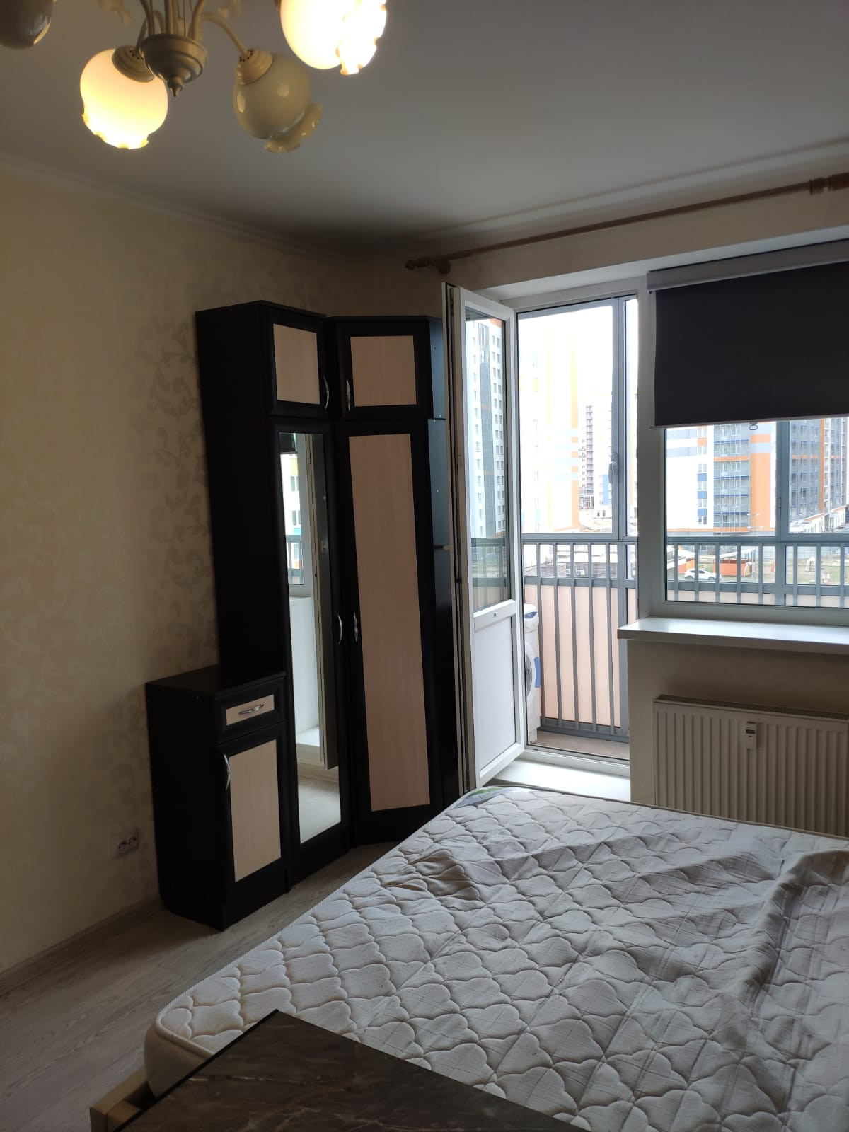 Есть все необходимое: большая крепкая двуспальная кровать, большая новая кухня, просторный балкон (+5-го этажа не так ветренно), ванная, на лоджии лежит линолеум и сделан потолок, как в ванной, чайник, микроволновка, сушилка, утюг, гладильная доска.