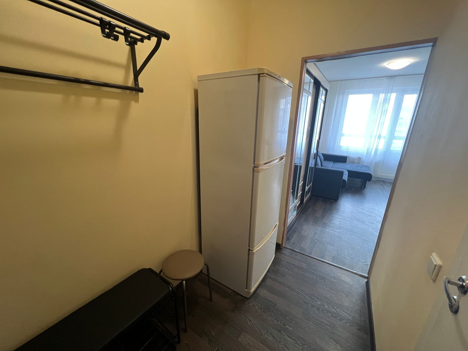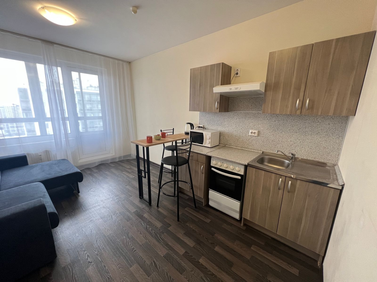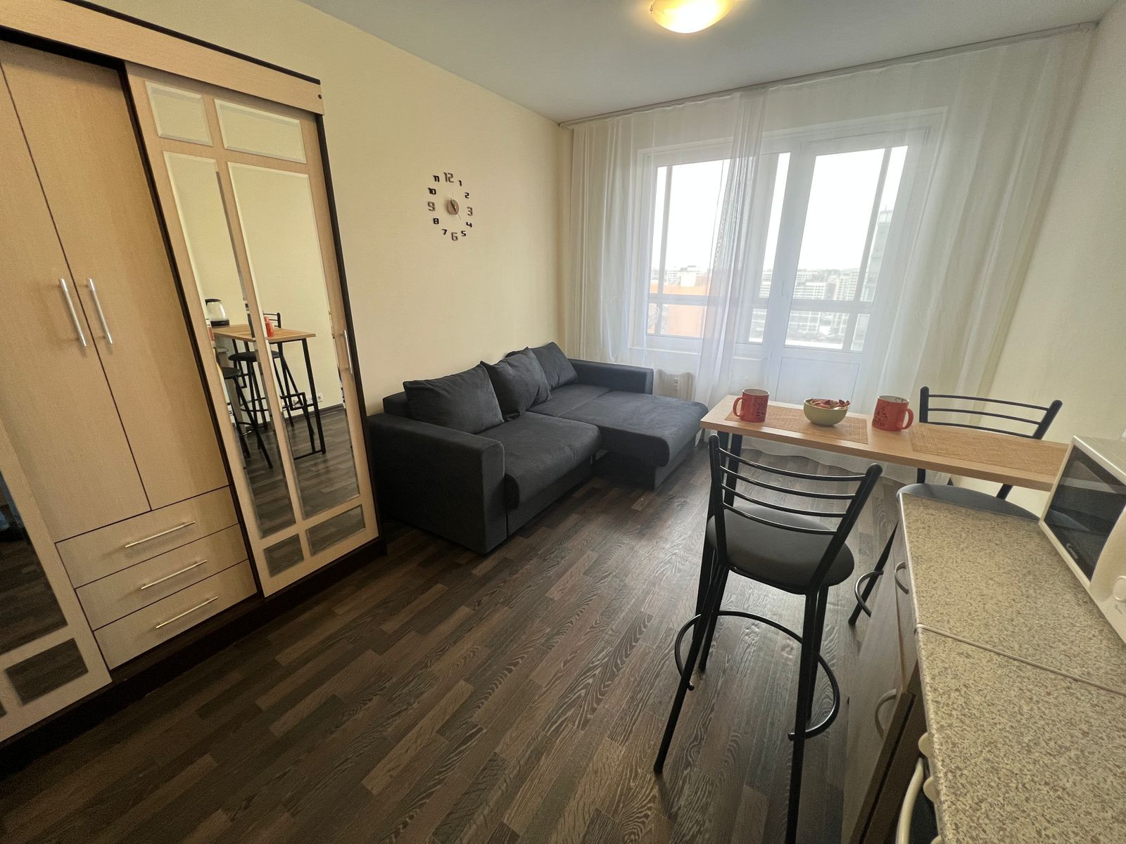 Квартира светлая, балкон с панорамным остеклением. Можно поставить столик и стулья и наслаждаться кофе по утрам. Есть кухонный гарнитур, плита, холодильник, шкаф, стиральная машина, микроволновка, раскладной диван, утюг, гладильная доска, посуда, чайник, столовые приборы.