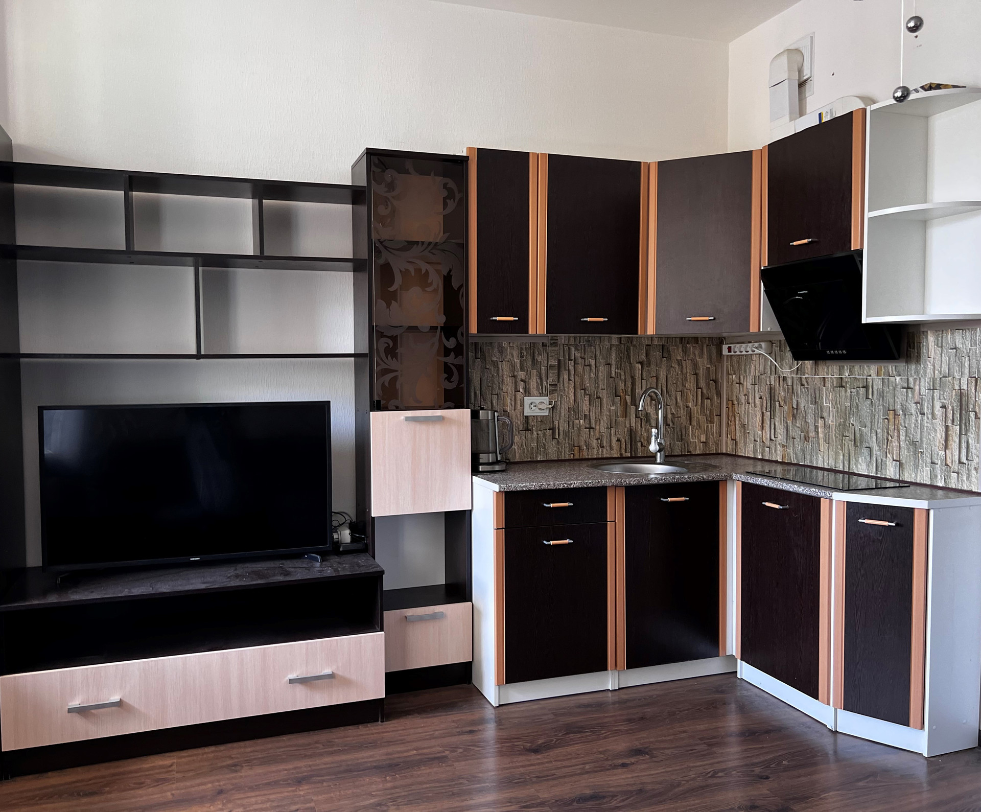 Есть все необходимое для жизни: комфортный двухспальный угловой диван, кухонный гарнитур, два вместительных шкафа , стенка. Из бытовой техники хороший телевизор , плита, вытяжка, микроволновая печь, чайник, холодильник, стиральная машина.