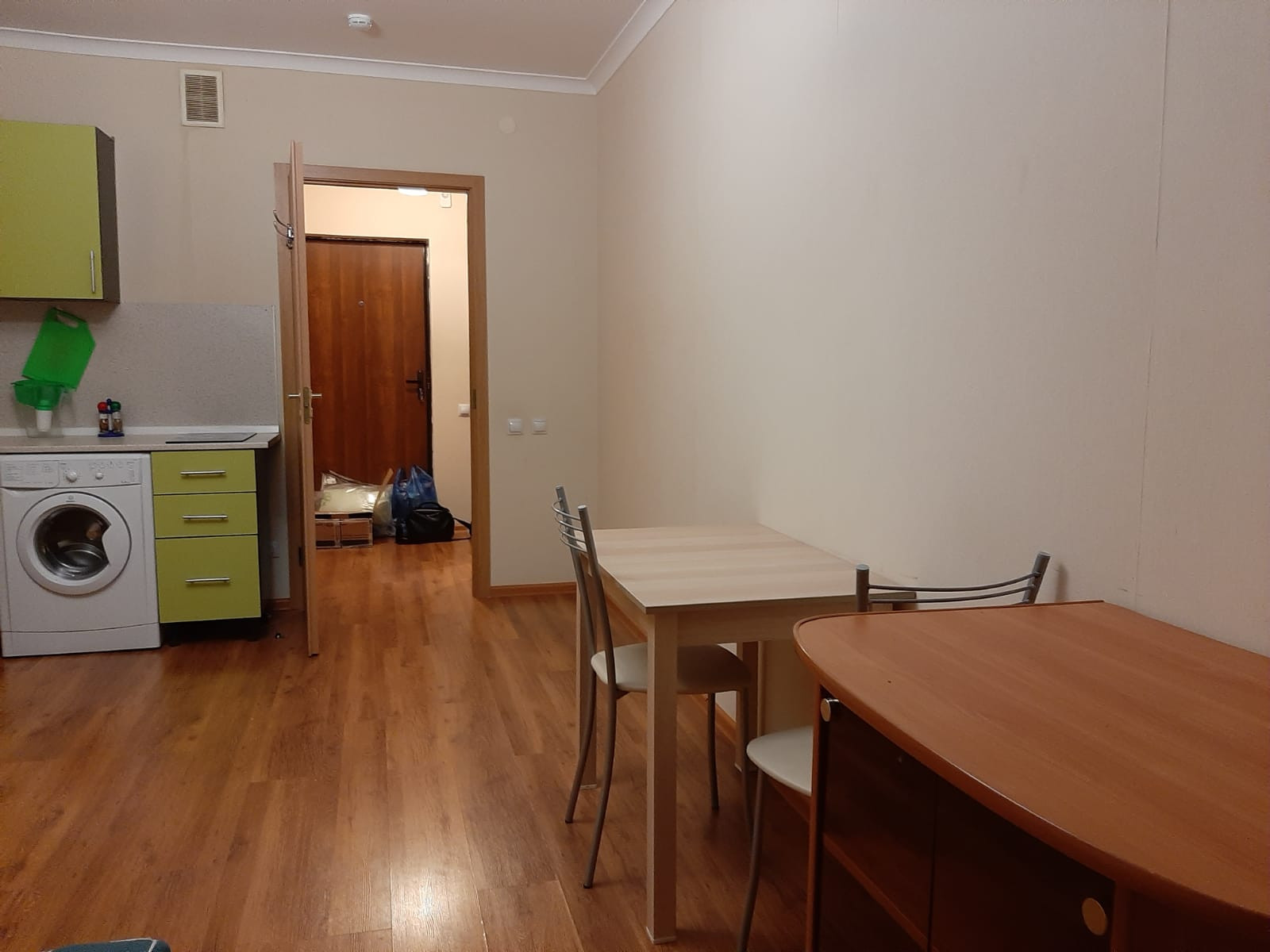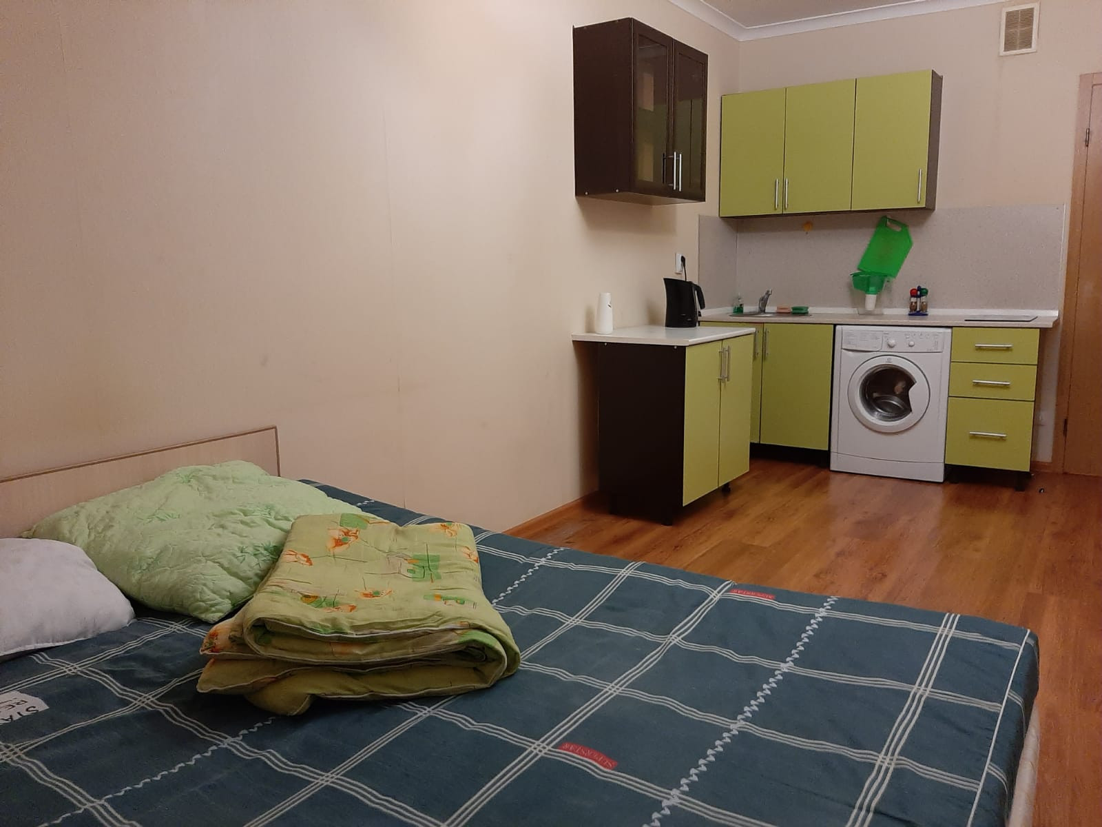 Собственник. Без комиссии.  Сдам отличную студию  28 метров + 3 метра застекленная лоджия. Новый дом . ЖК Форвард.  16 минут пешком - станция метро Девяткино.  Вся необходимая современная мебель. Просторная 2-х спальная кровать. В коридоре встроенный шкаф-купе.  Стильная встроенная кухня. Стол. Стулья .  Тумба под ТВ.   Вся бытовая техника.  2-х камерный холодильник. Стиральная машина-автомат. Пылесос. Электрический чайник.  Посуда. Одеяла. Подушки.  + КУ. + счетчики. Залог 100 %, но можно в 2 этапа.   Без животных.  И только длительный срок . В квартире не курят.