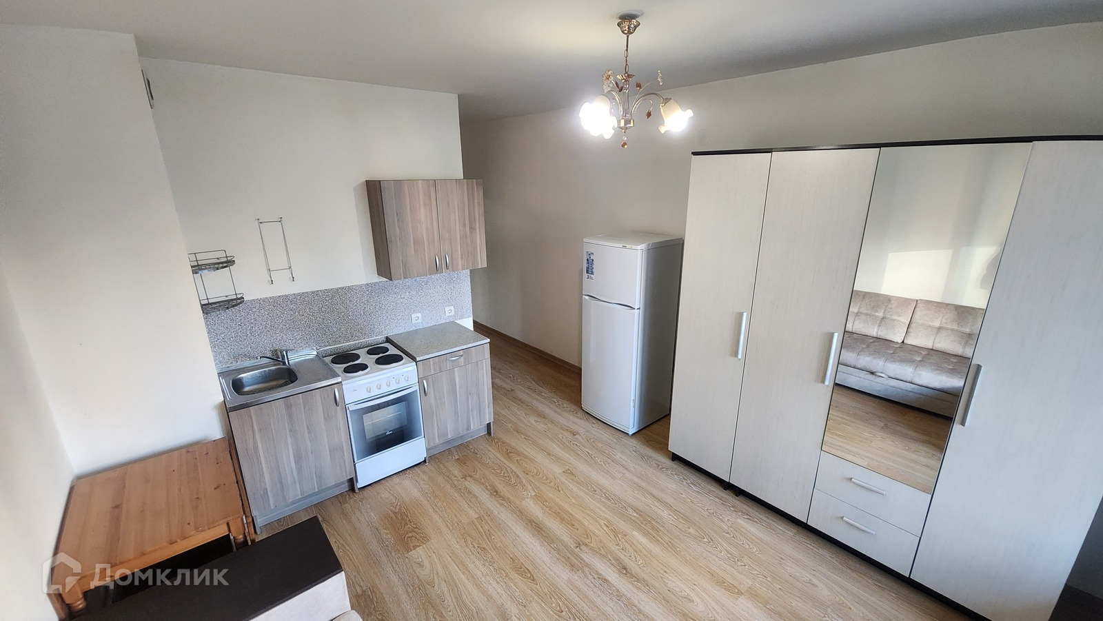 В квартире есть необходимая мебель (раскладной диван, шкафы в комнате, прихожей и кухонной зоне, стол и табуретки) и техника (стиральная машина, холодильник, электрическая плита).