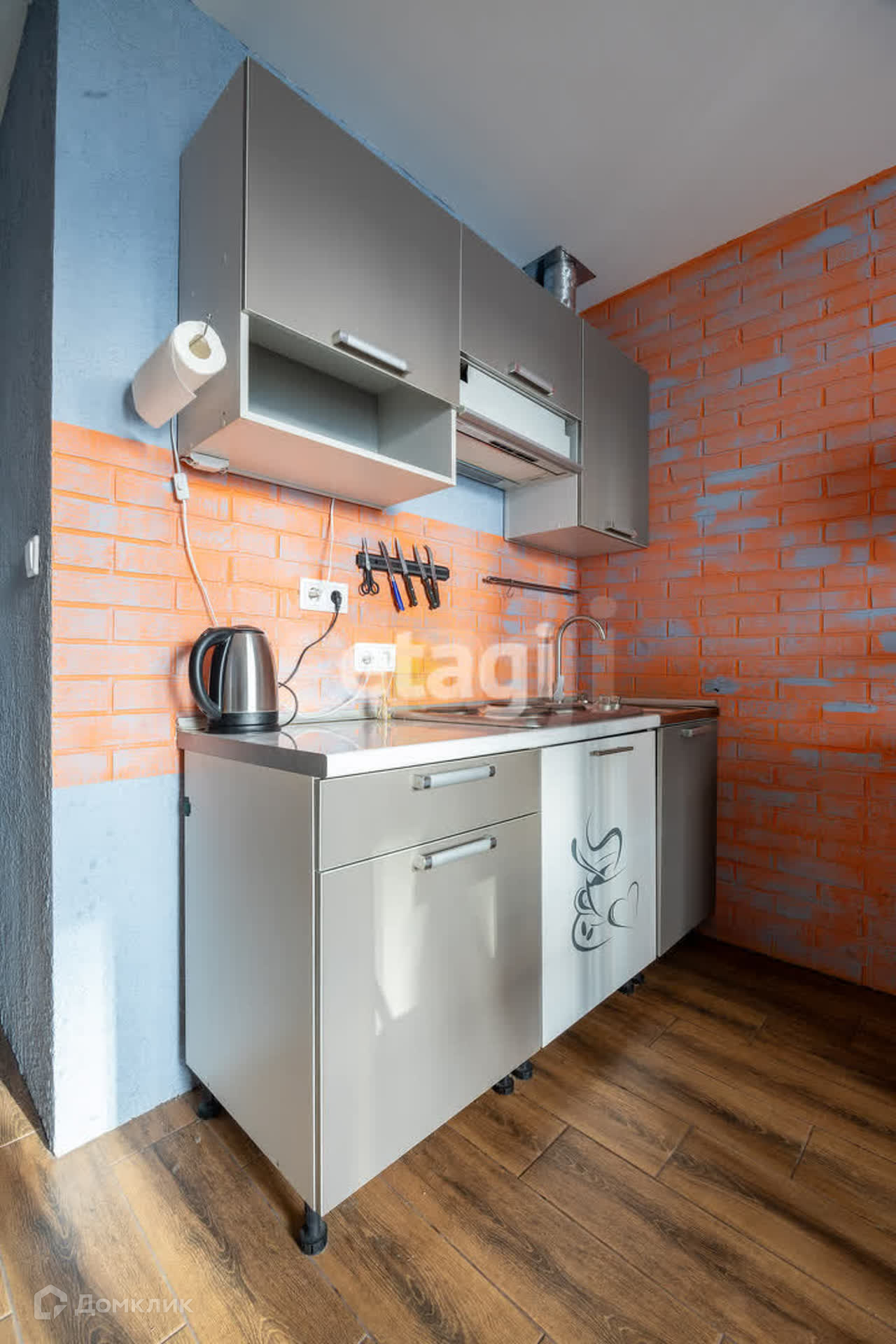 -бытовая техника: электрическая плита, электрический чайник, холодильник с морозильной камерой, микроволновая печь, телевизор, стиральная машина.
