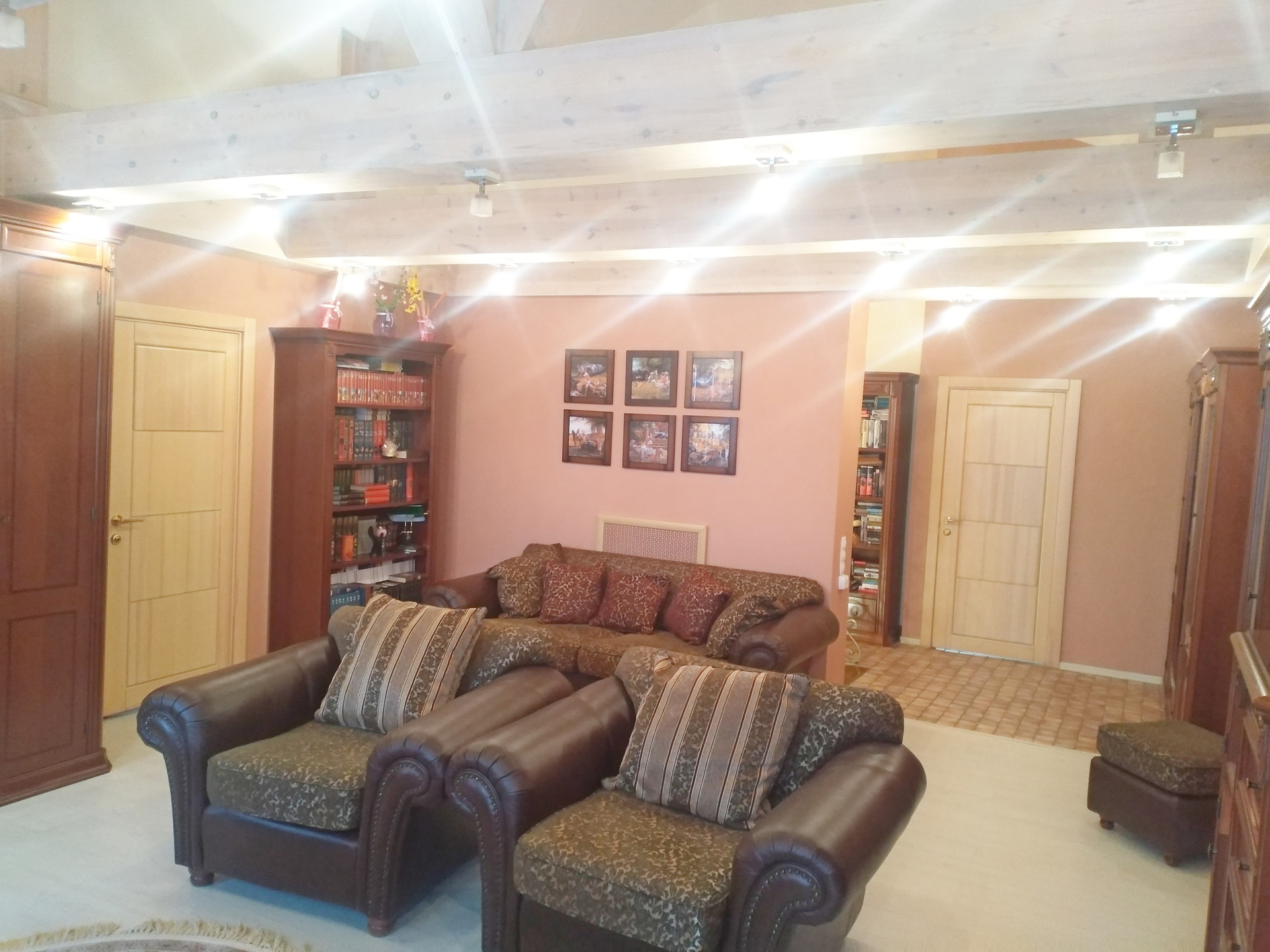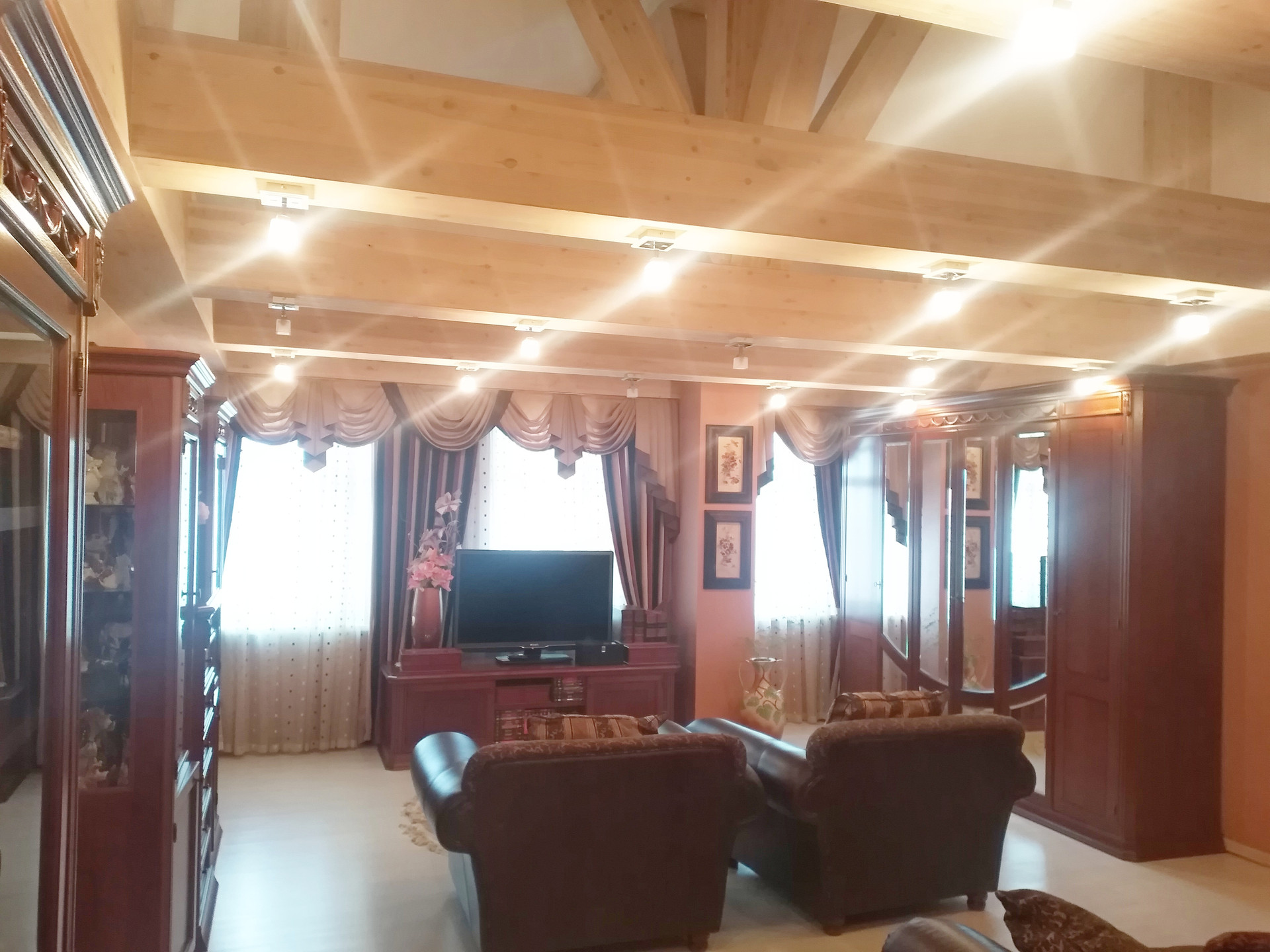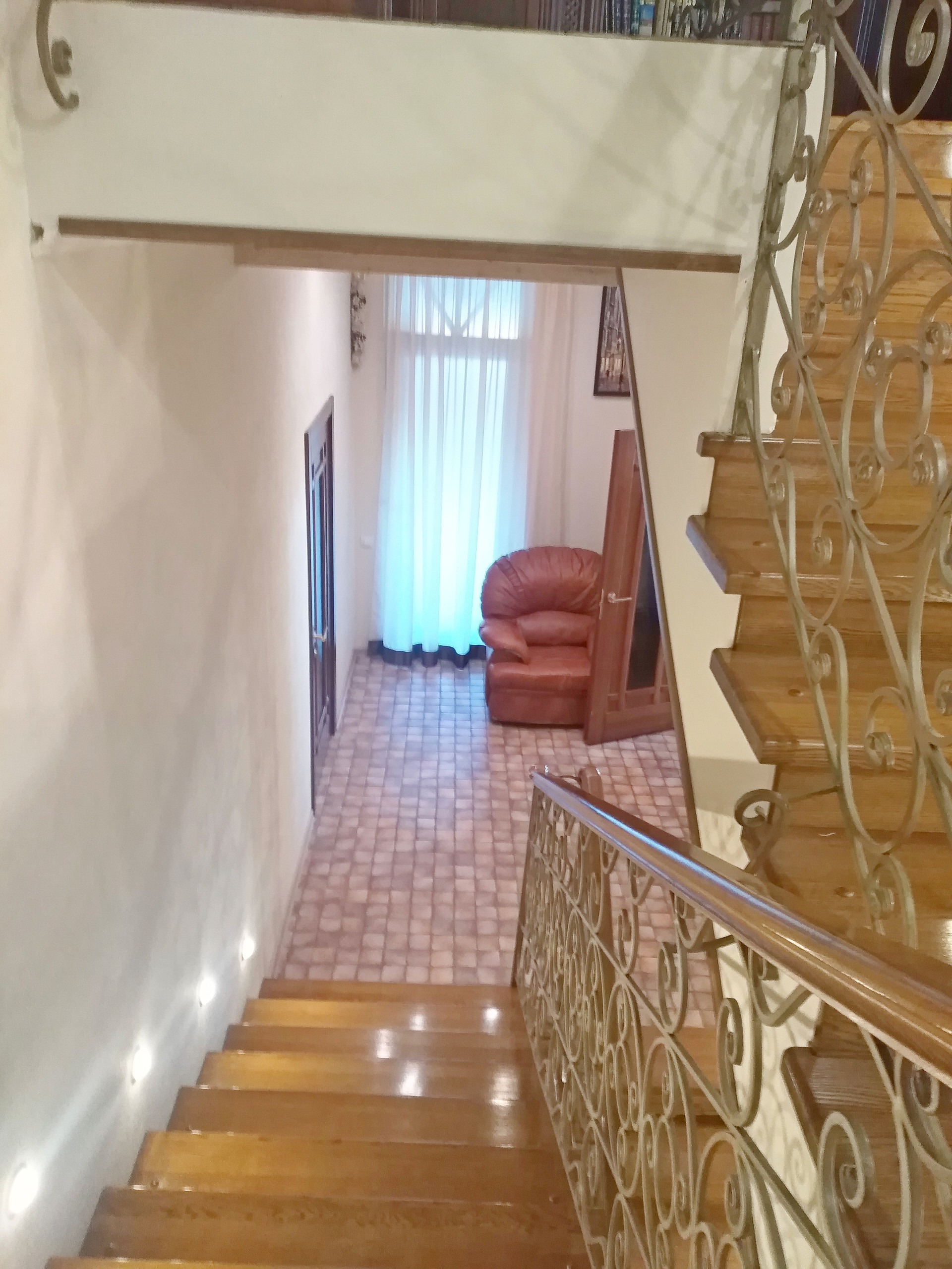 Планировка дома: семь комнат от 8 кв.м. до 39 кв.м., 2 с/у, сауна с комнатой отдыха 20 кв.м., кухня-столовая 36 кв.м., бойлерная, гардеробная и т.д.. Прекрасная открытая терраса на два этажа 117 кв.м. + зона отдыха облагорожена деревянным настилом переходящим в террасу. Высота потолков в помещениях от 2,8 м. до 4,3 м.. Для внутренней отделки использовались качественные, импортные материалы. Стоянка и вход к дому выложен тротуарной плиткой, забор на каменной ленте, кованные металлические ворота на автоматике.