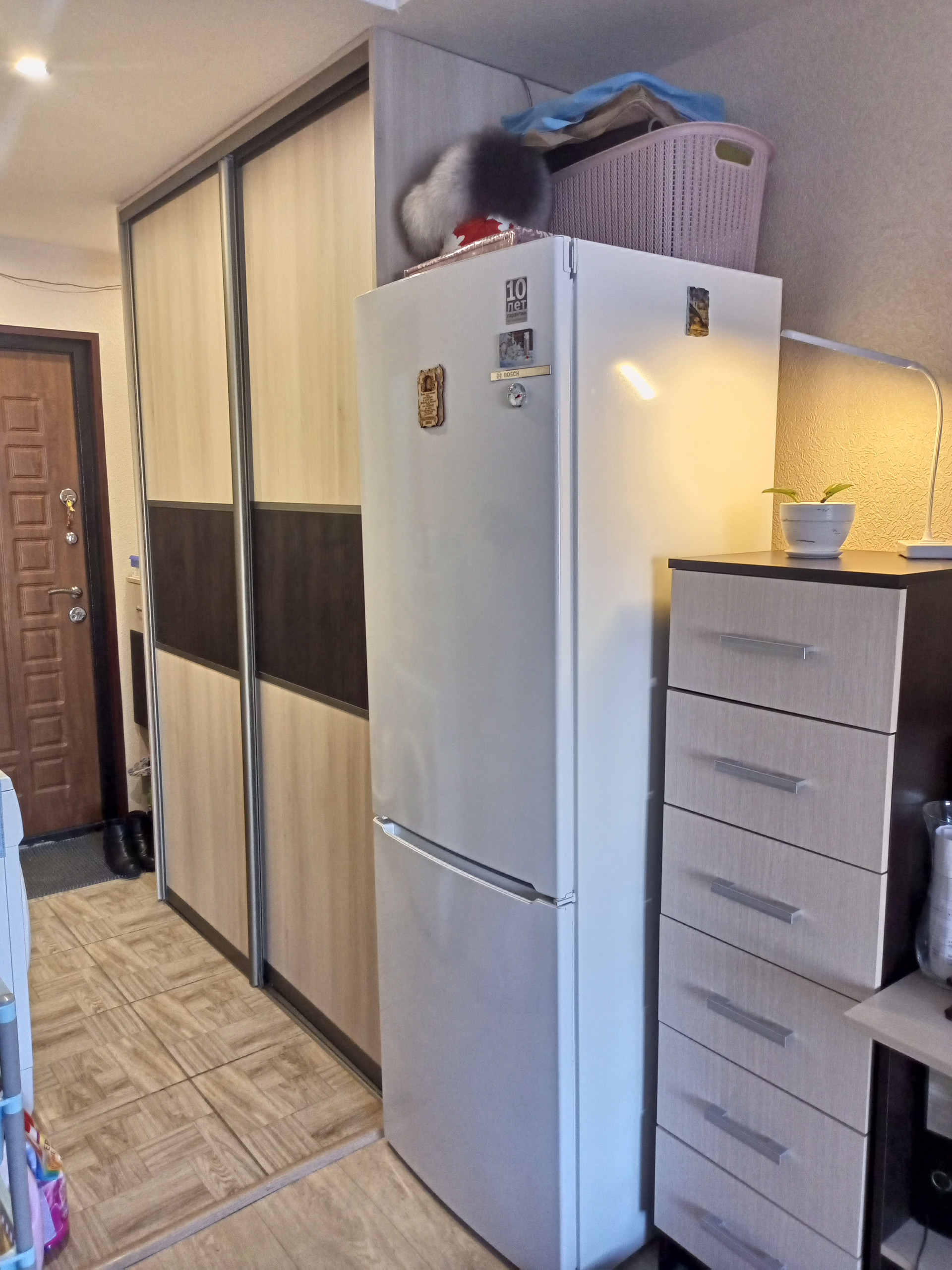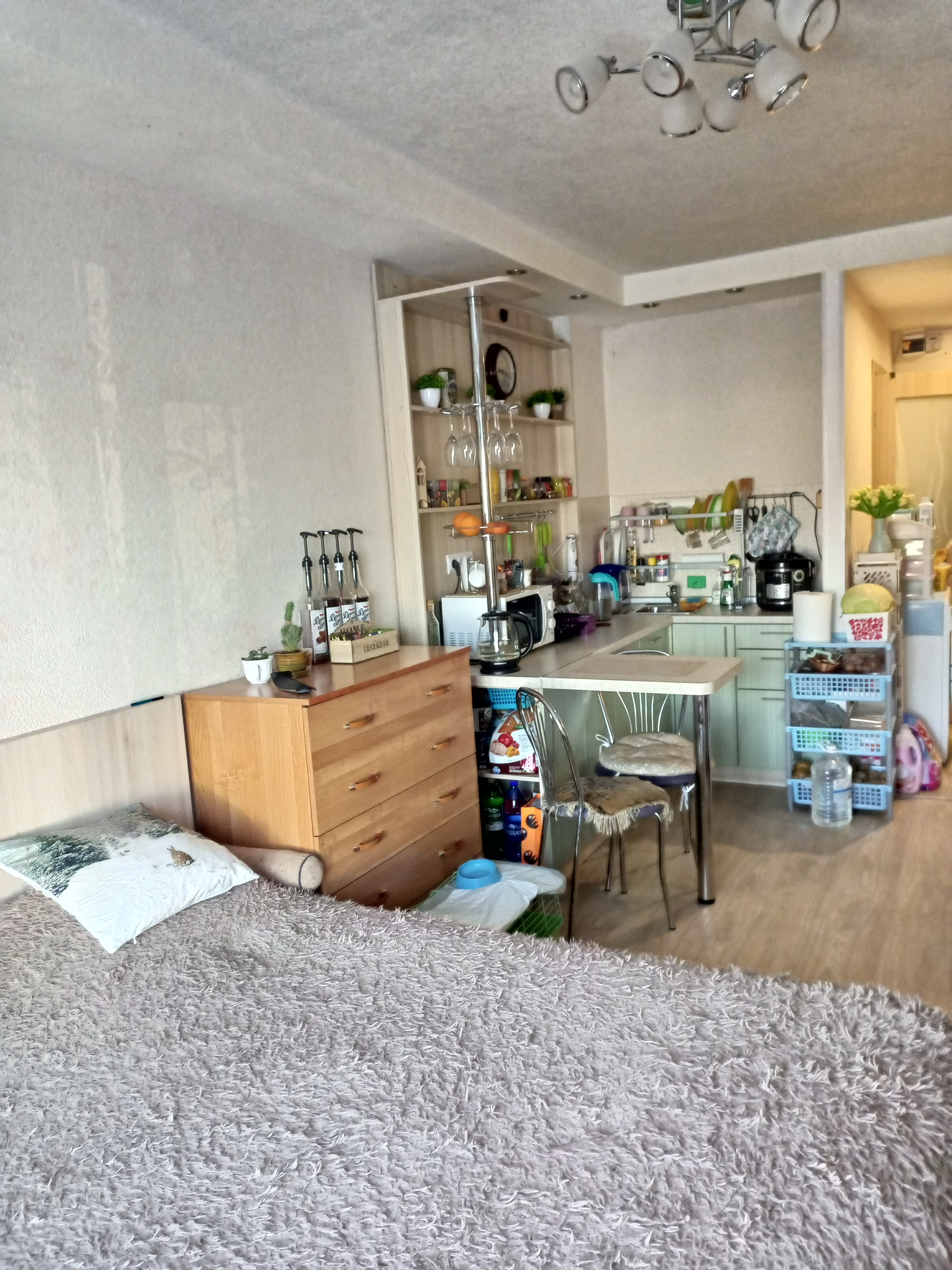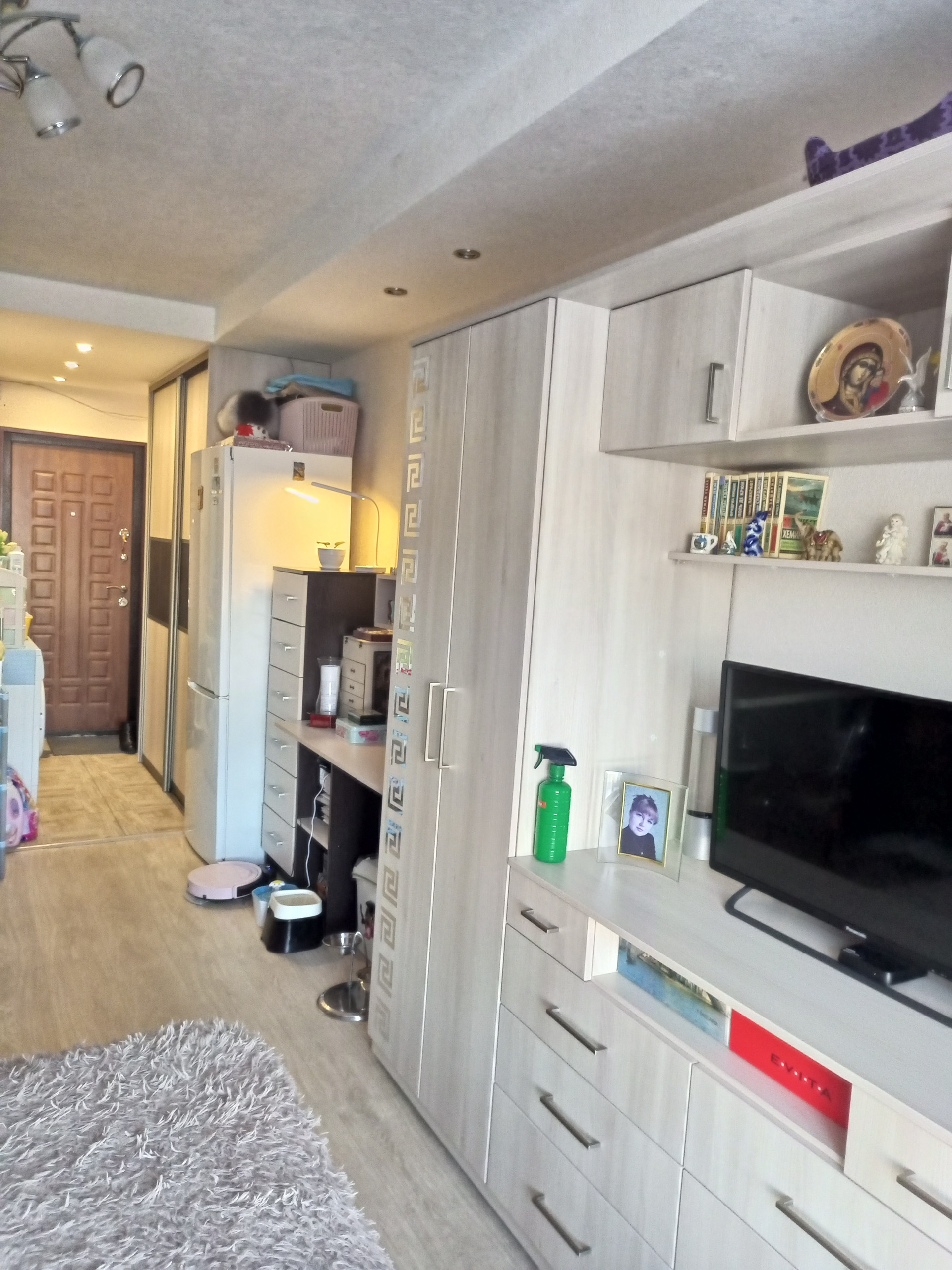 Комната в отличном состоянии. Сделан хороший ремонт. Заменено все: окно, двери, электрика, трубы. В санузле вся сантехника новая. Полы линолеум. Встроенная кухня и шкаф-купе  изготовлены на заказ - остаются.