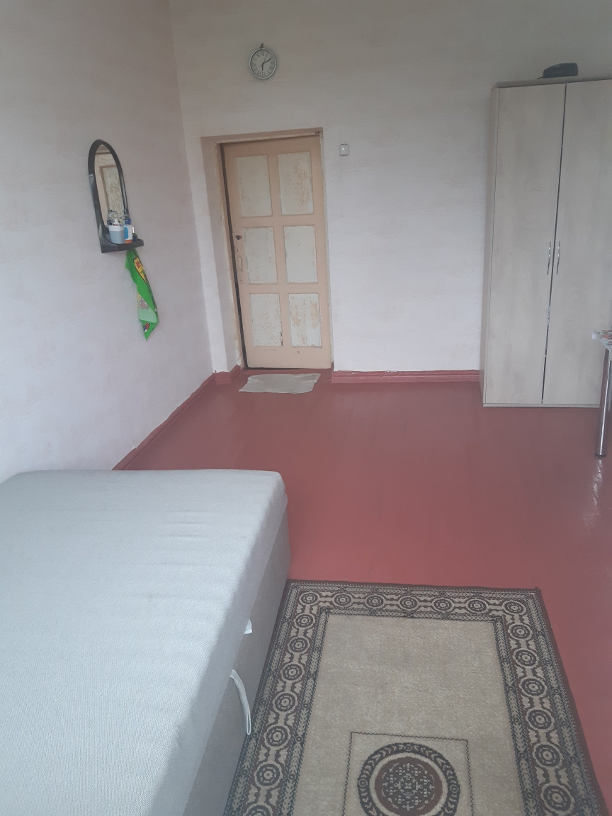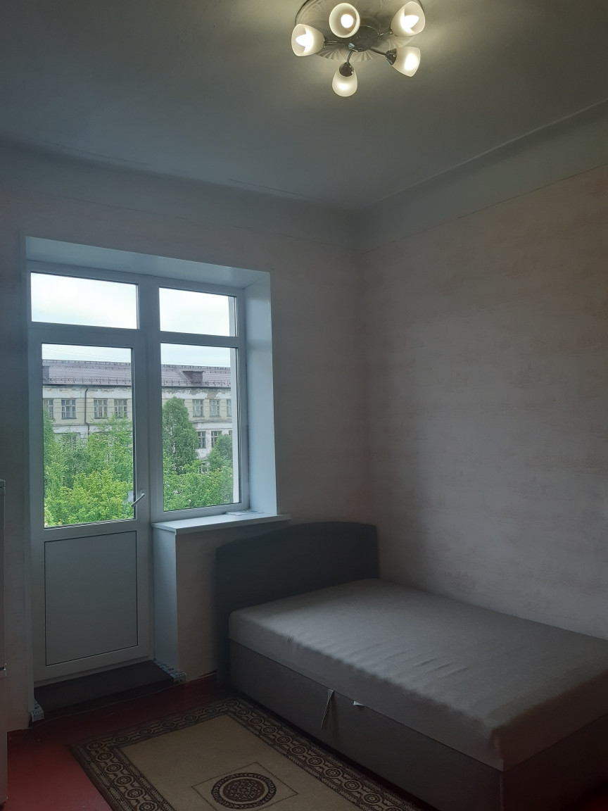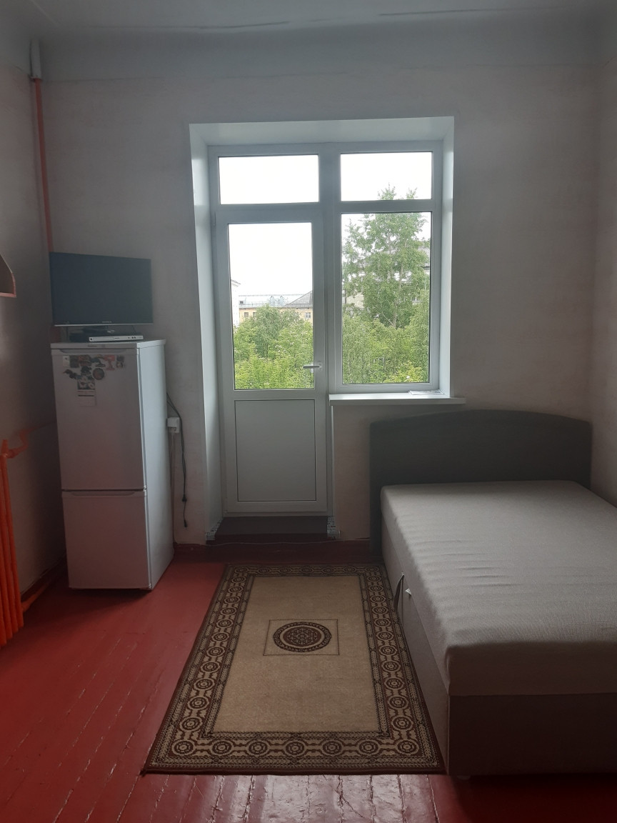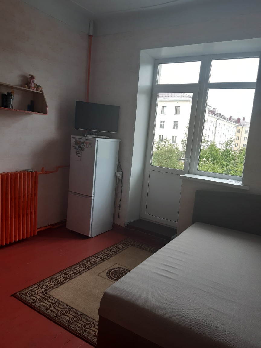 В комнате сделан косметический ремонт, замена оконного блока на балкон. Одна комната - муниципальная, и вторая комната тоже будет продаваться . Места общего пользования требуют ремонта. В комнате есть балкон. Вид из окна на Челюскинцев.   Торг уместен.