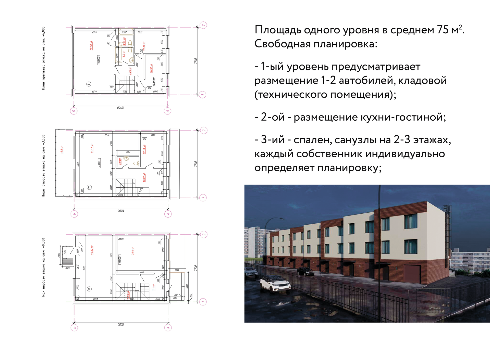 Первый уровень предусматривает размещение 1-2 автомашин, кладовой (технического помещения) и с/у.