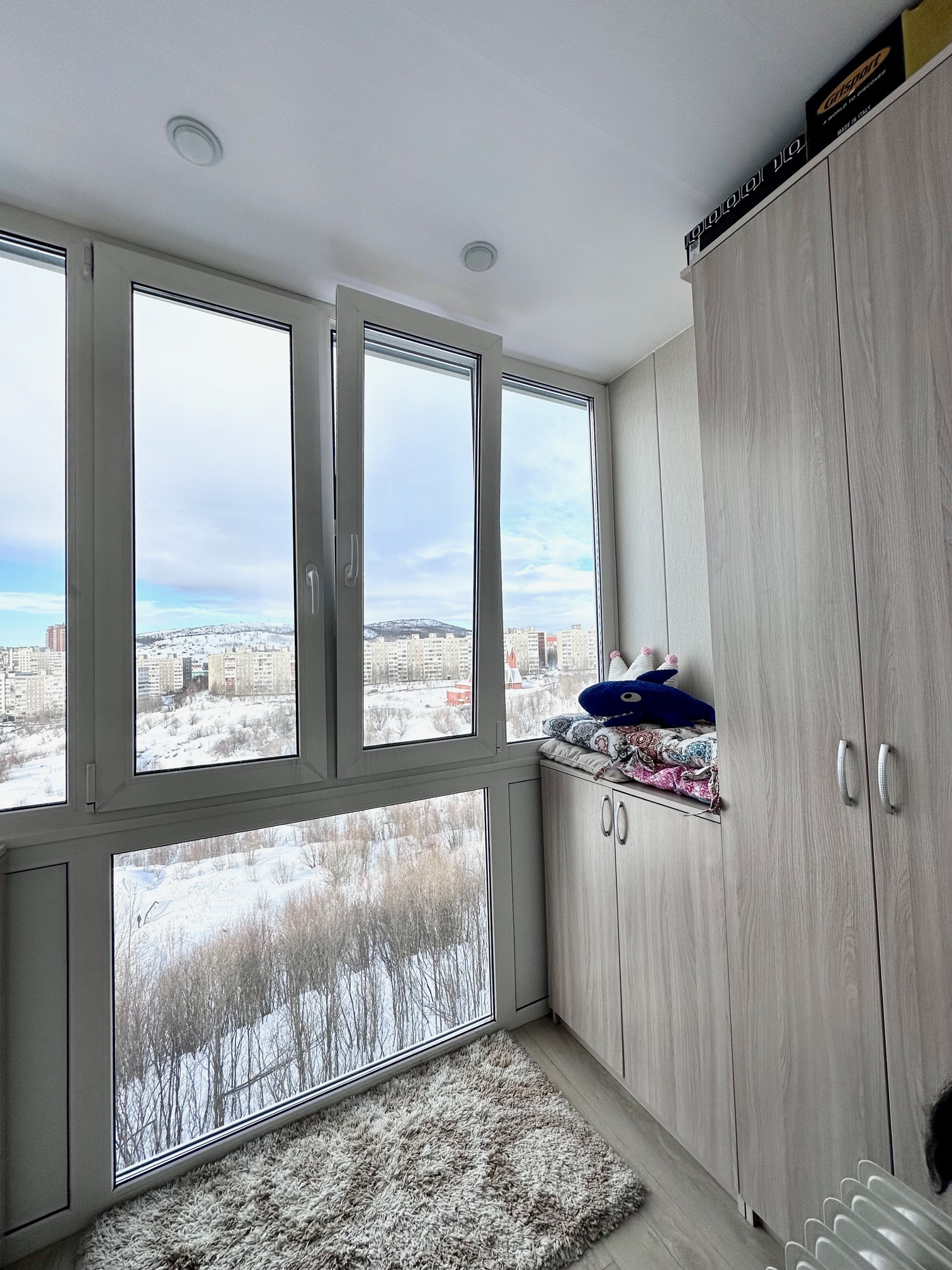 * Лоджия - полностью застеклена стеклопакетами, сделано панорамные окна, сделан свет, встроены шкафы