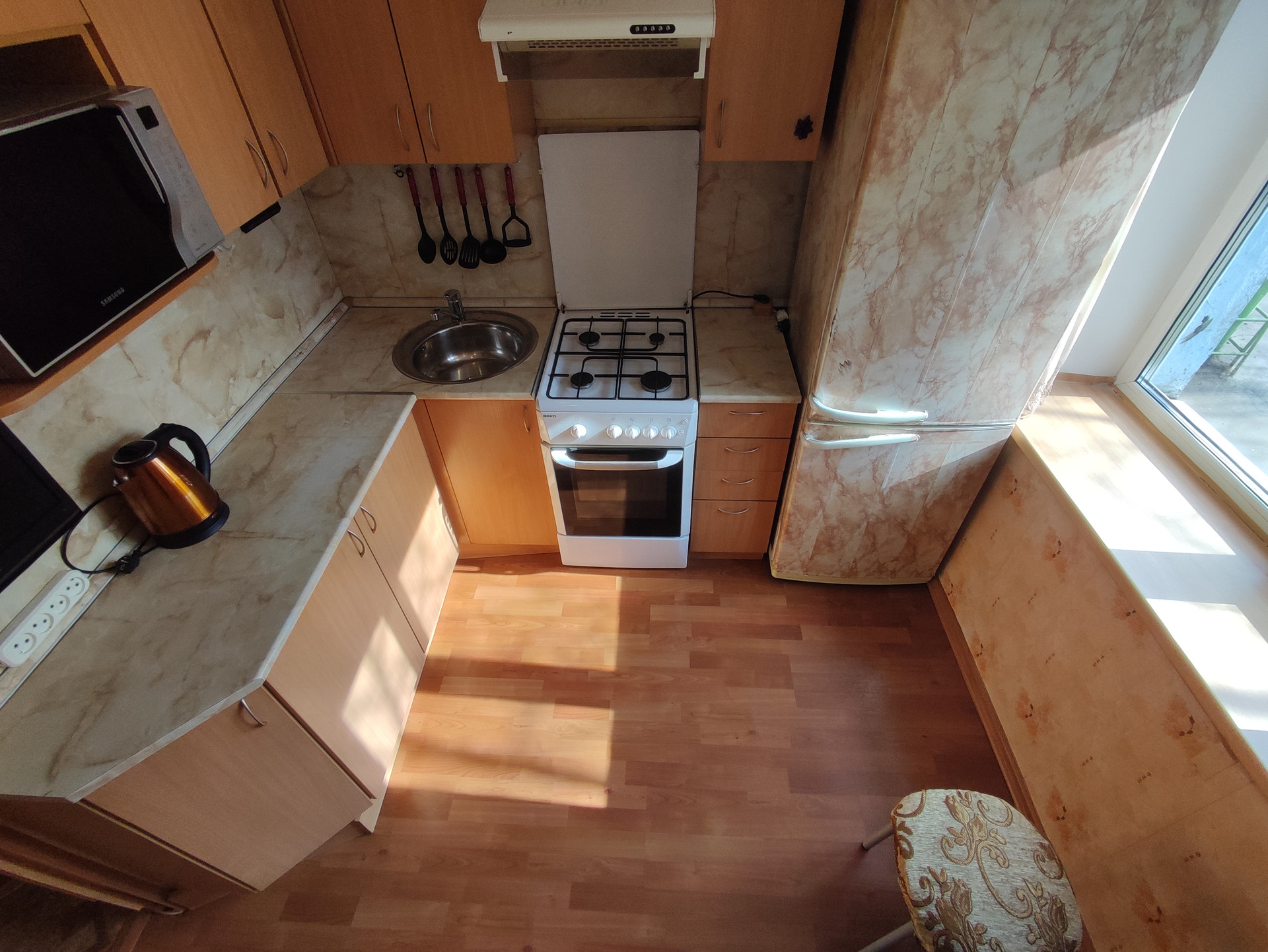 Кухня удобная и компактная. Обеспечена всей необходимой техникой и мебелью. Отличная газовая плита, вытяжка, телевизор, микроволновка, холодильник и обеденный стол. В такой кухне очень приятно находиться и готовить.