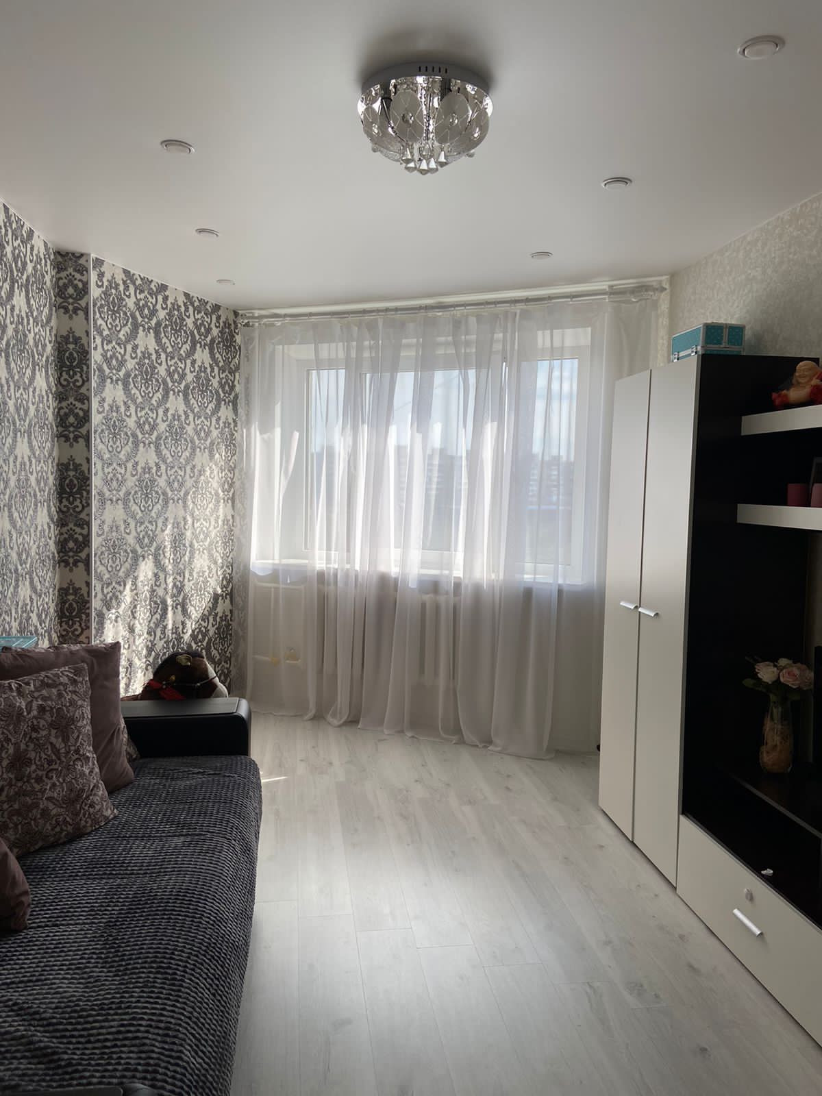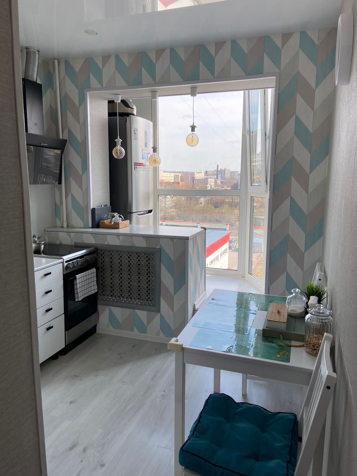 На кухне сделана панорама, открывающая вид на город ,в квартире сделан евроремонт с использованием качественных материалов в 2020 году.