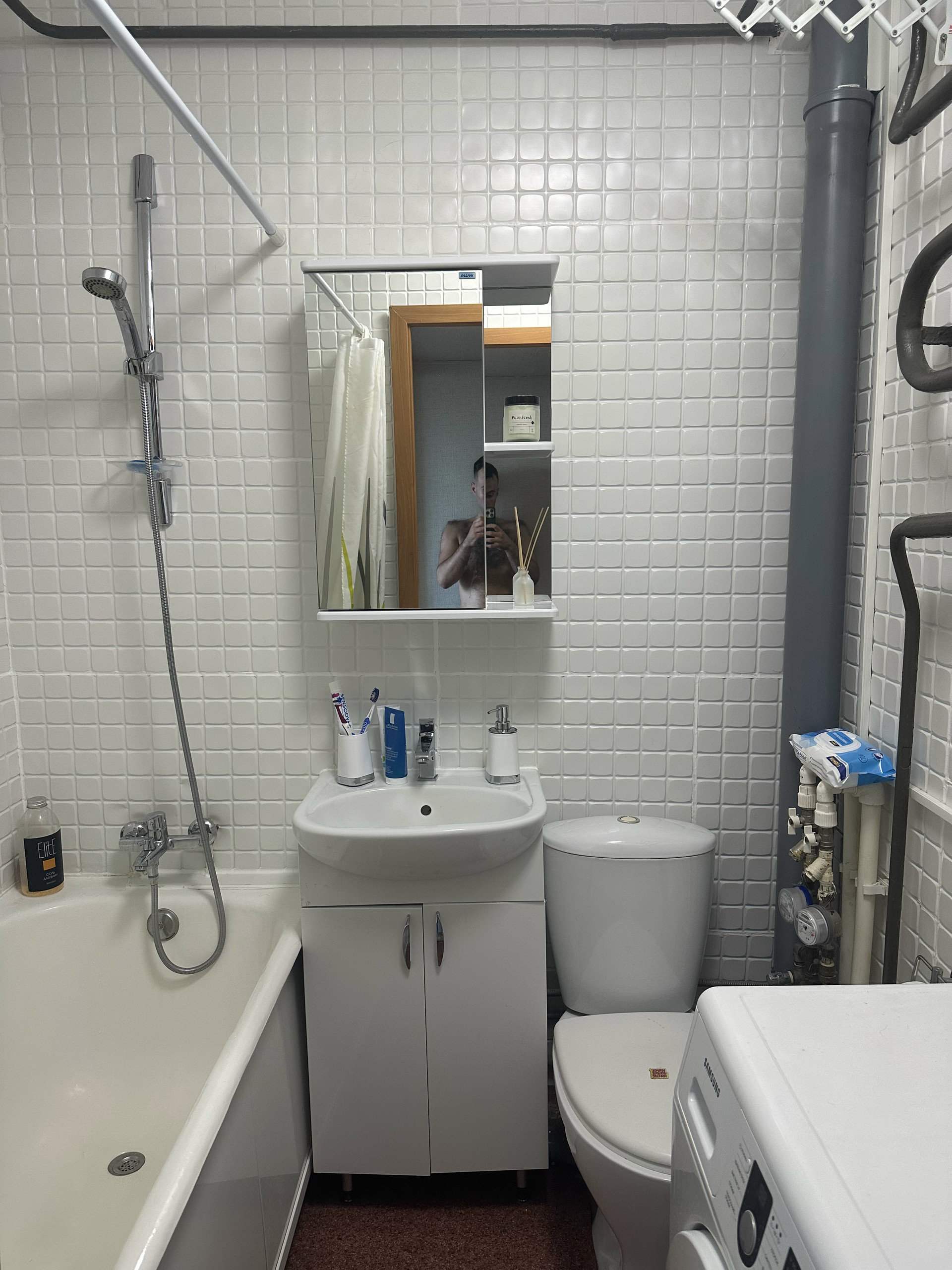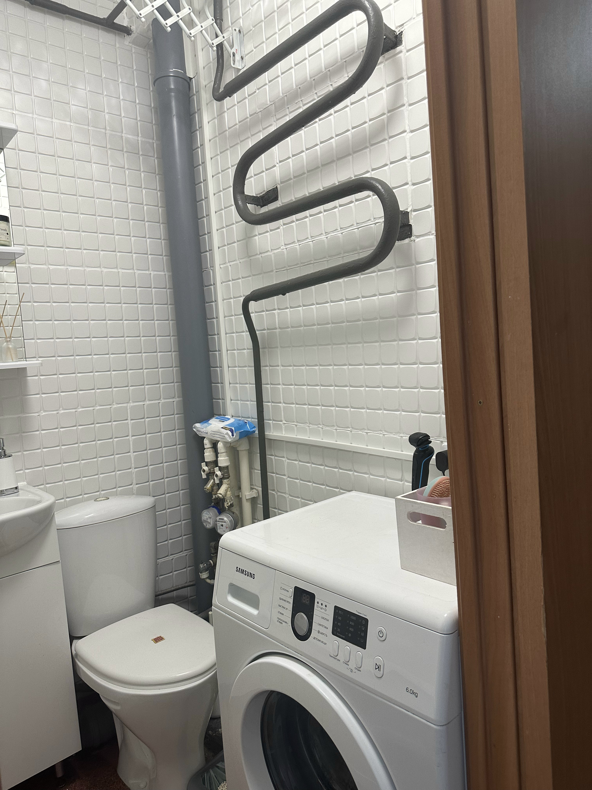 Совмещенный санузел, заменен стояк водоснабжения, поверенные счетчики в 2021 году, остается стиральная машинка Samsung. Косметический ремонт был сделан в 2022 году.