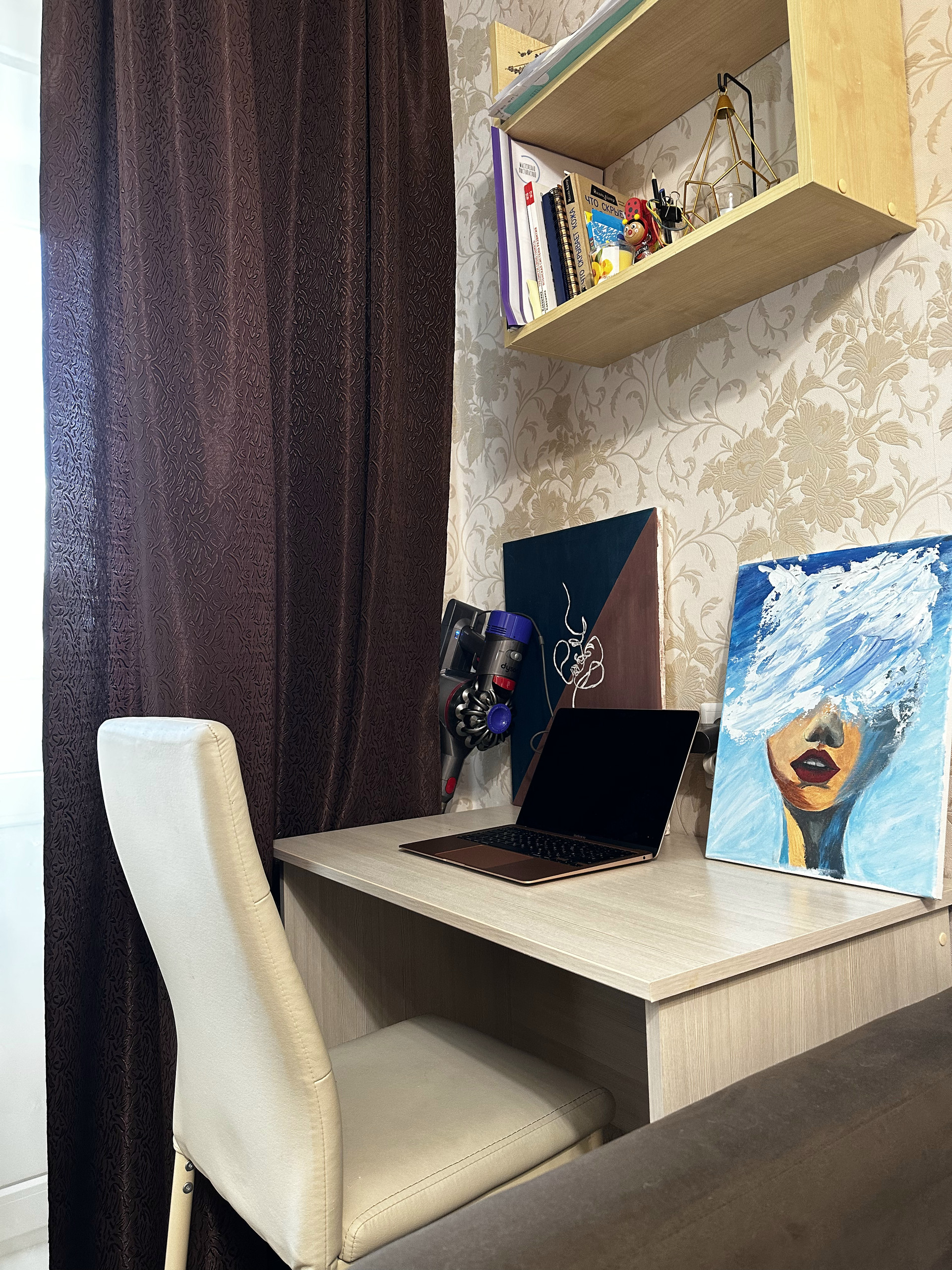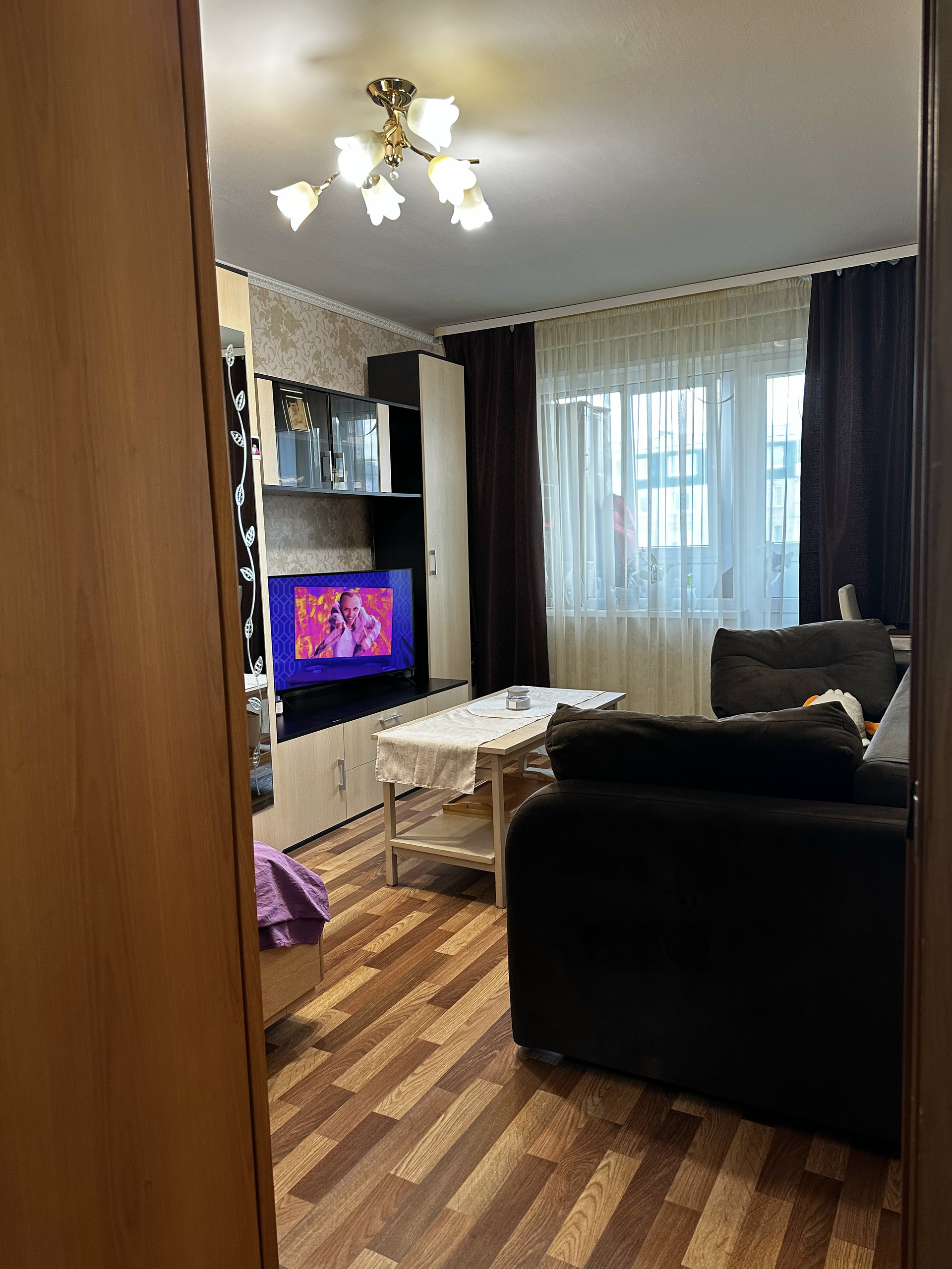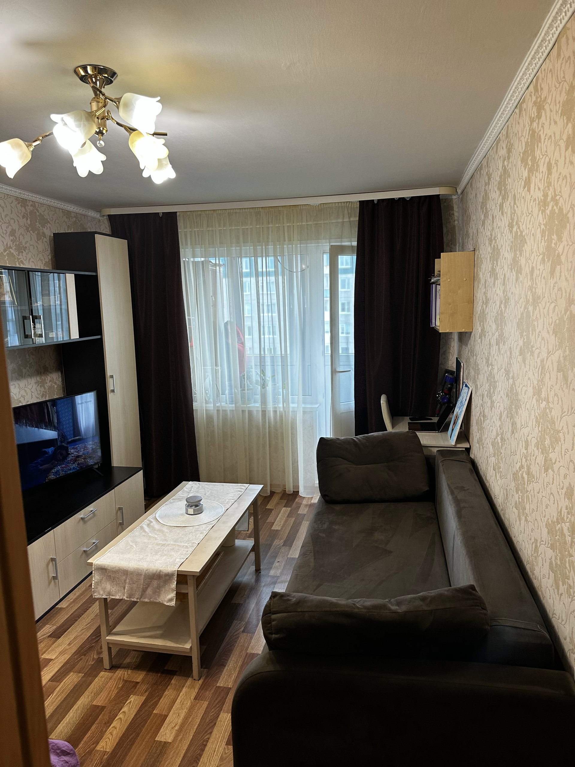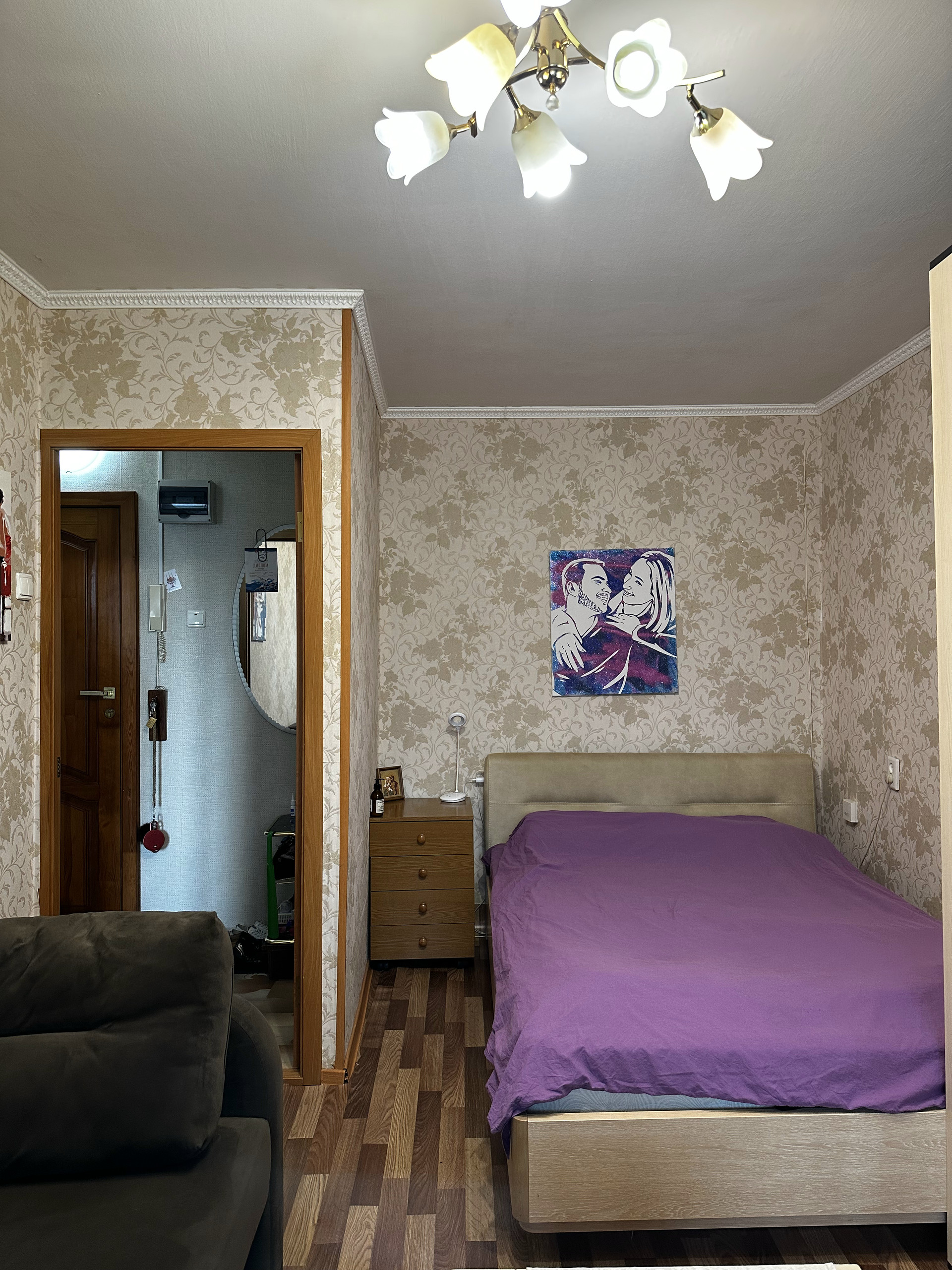 Комната с нишей, остается кровать с ортопедическим матрасом фирмы Lazurit, диван, стенка со шкафом, письменный стол и стул.