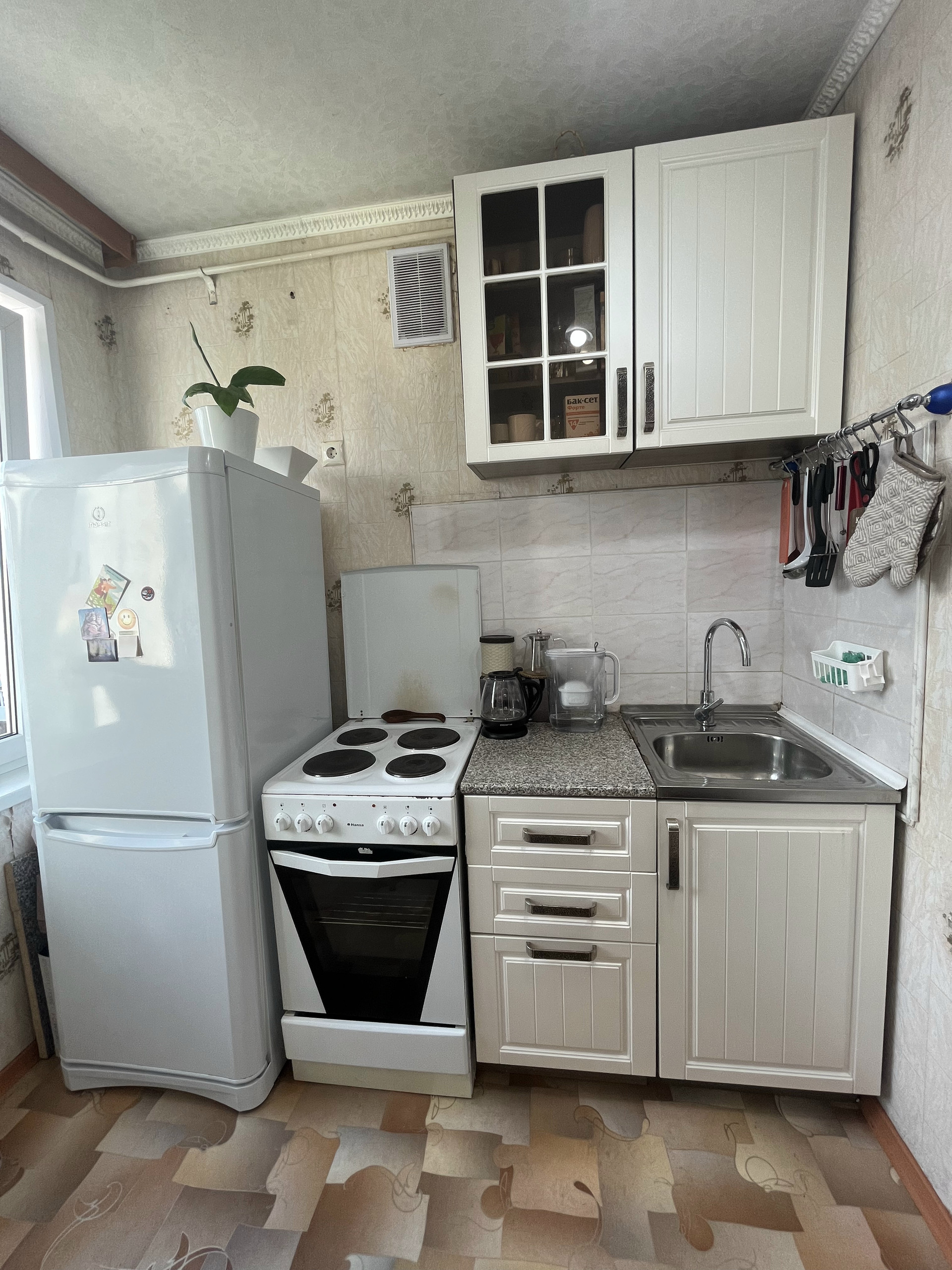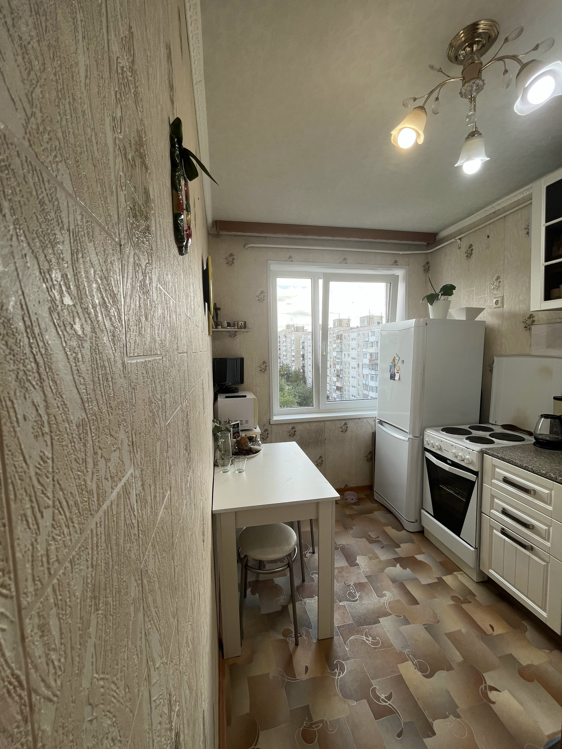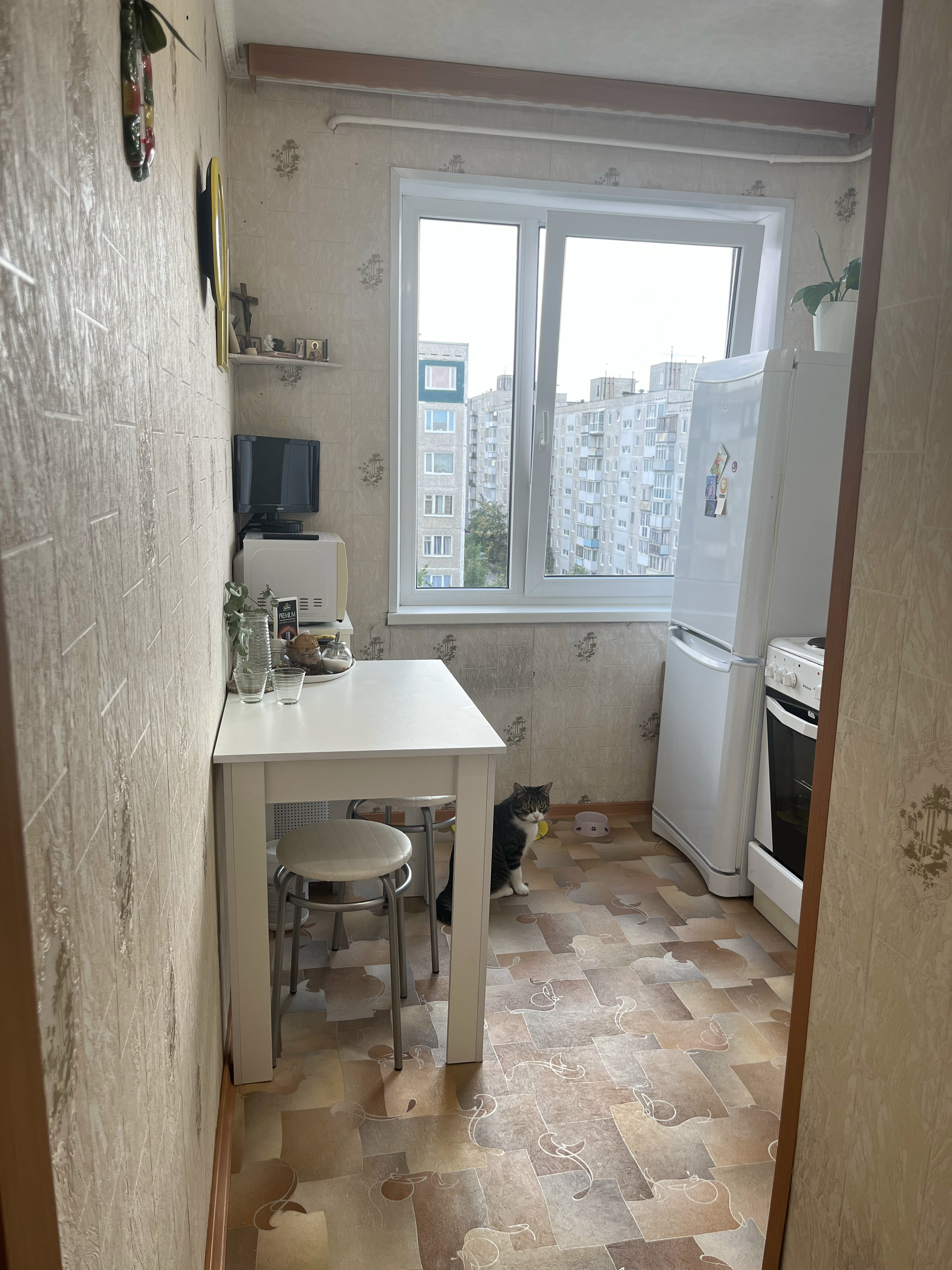 На кухне остается кухонный гарнитур, холодильник Indesit, плита, стол и стулья, этажерка, микроволновая печь, телевизор.