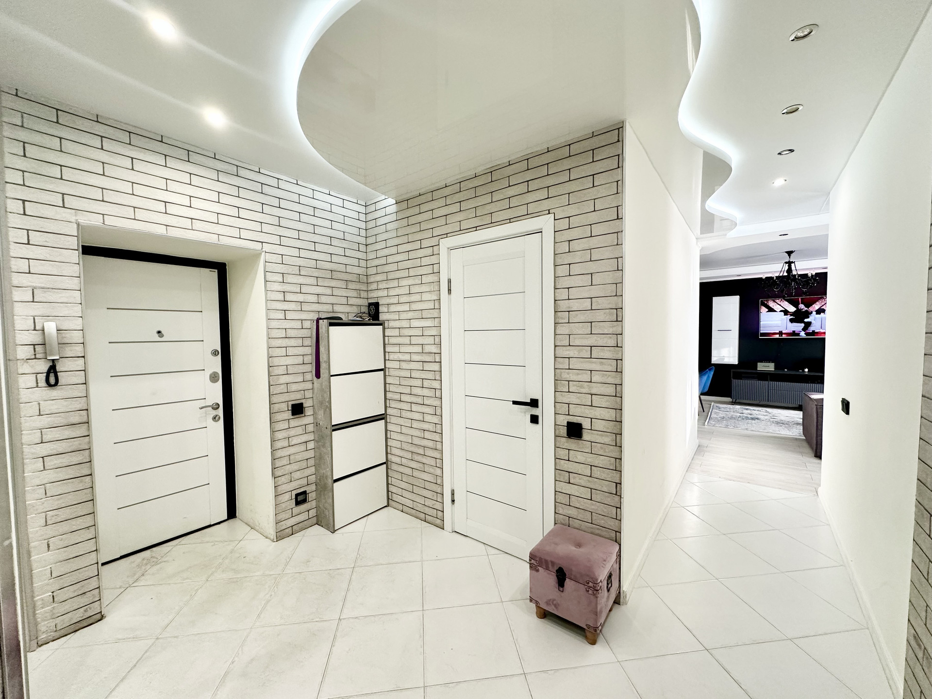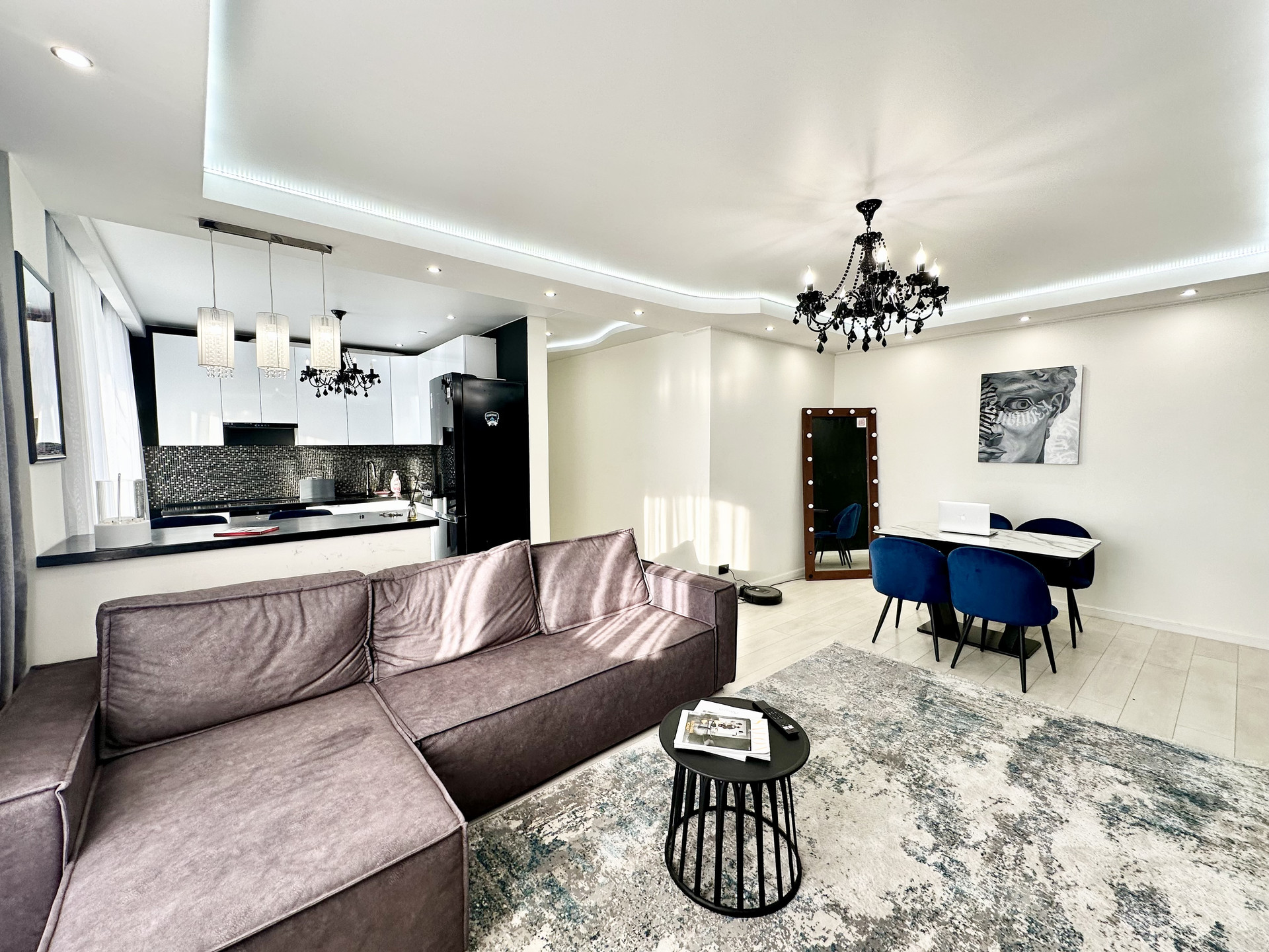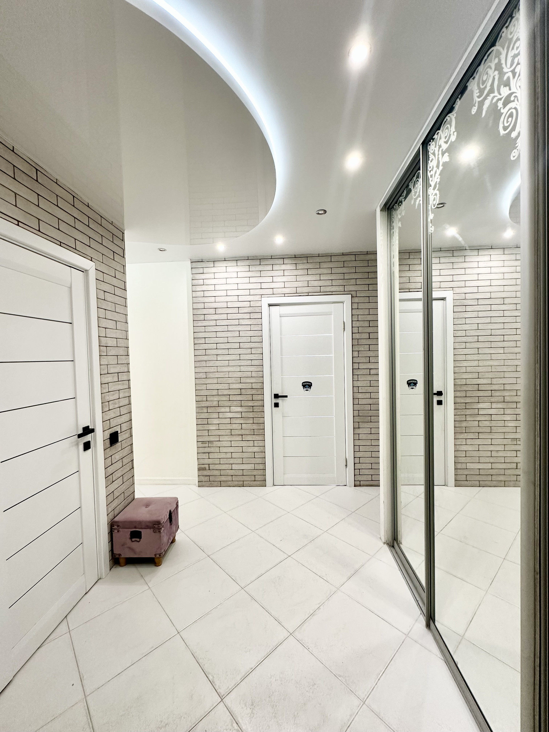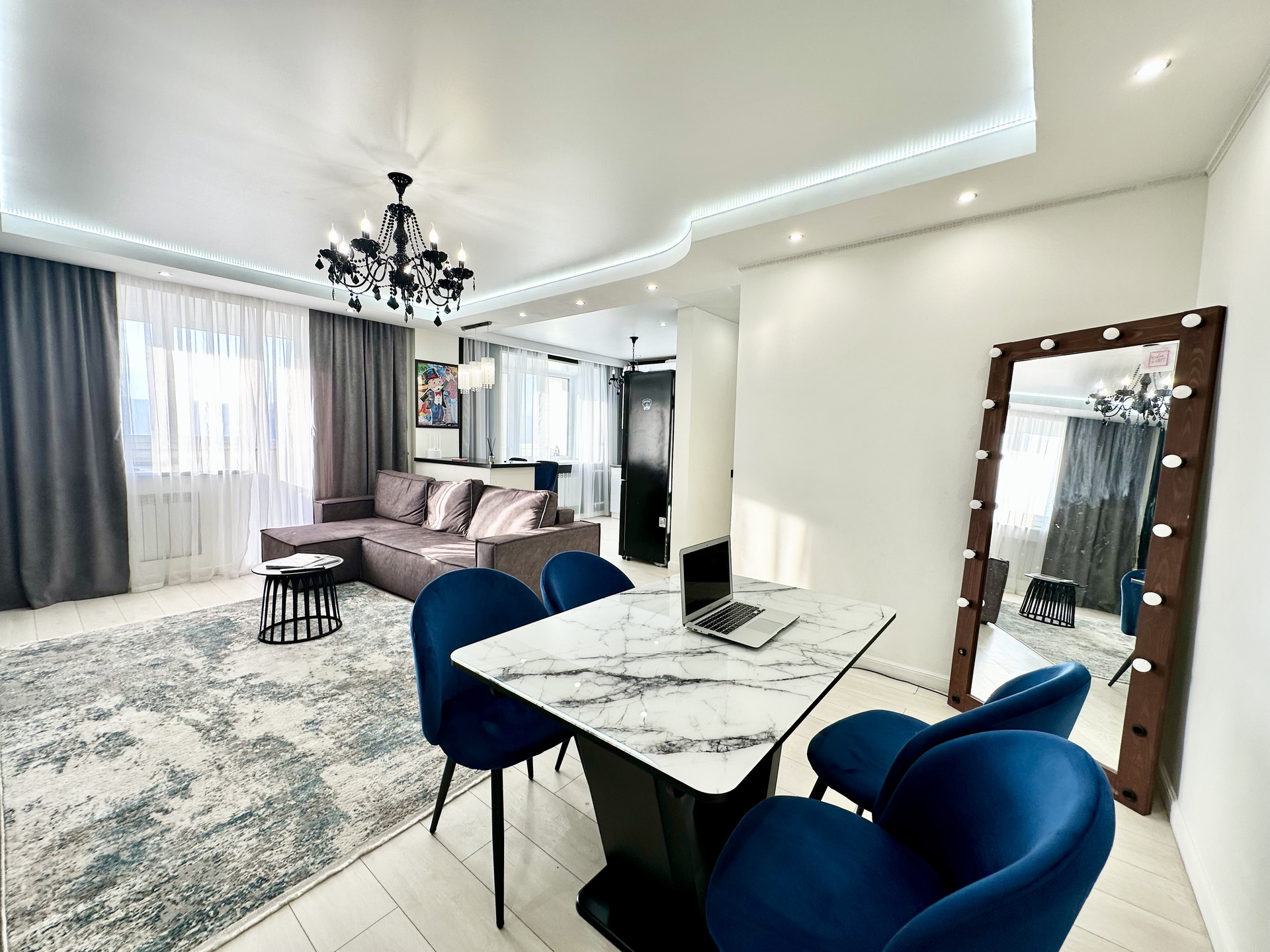 * Потолки в квартире подвесные и натяжные с зональным освещением.