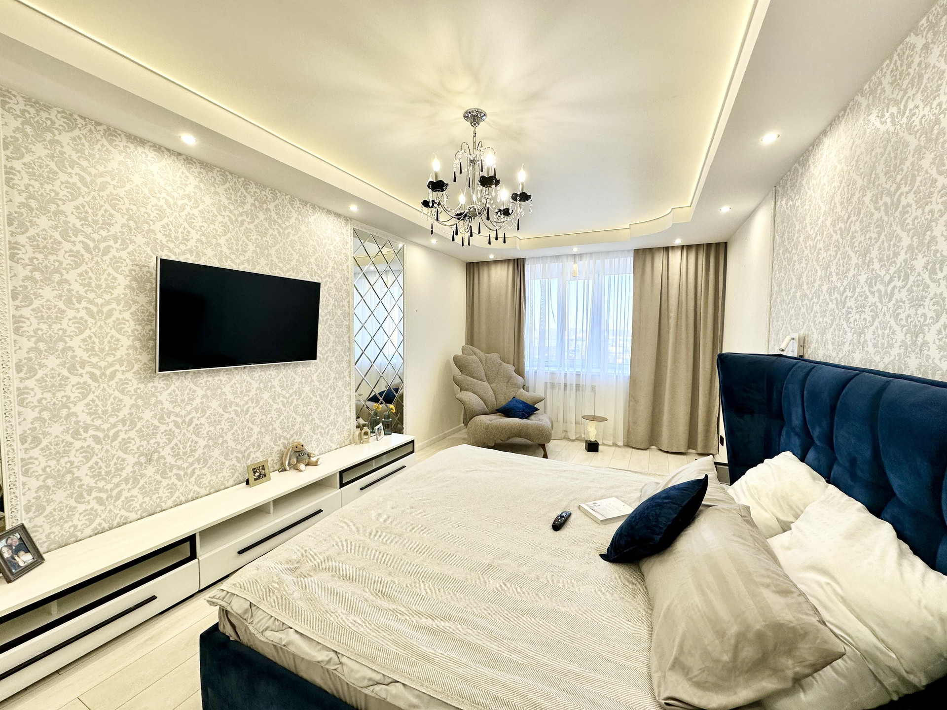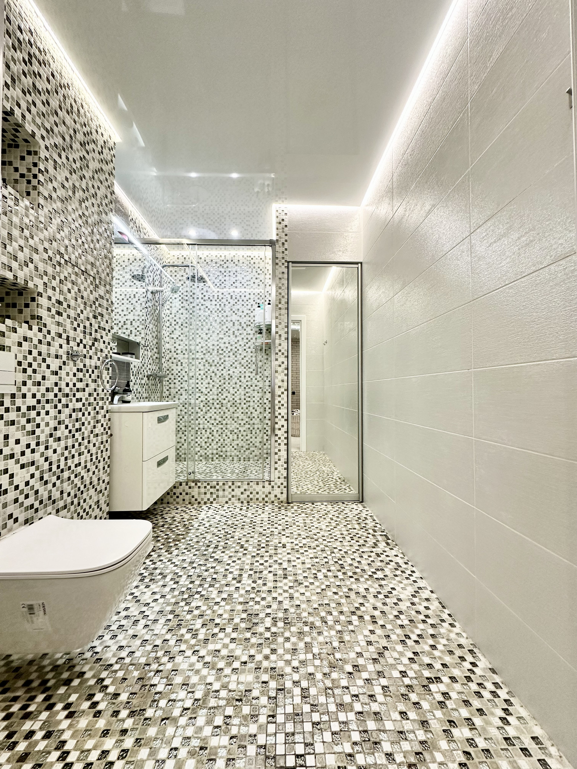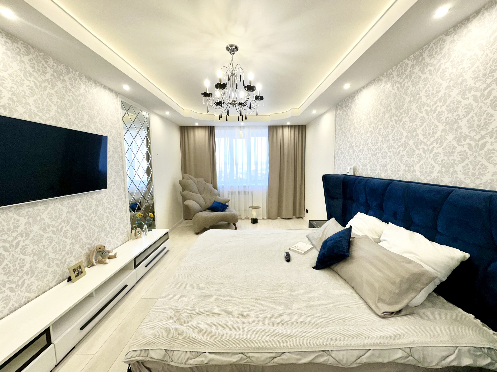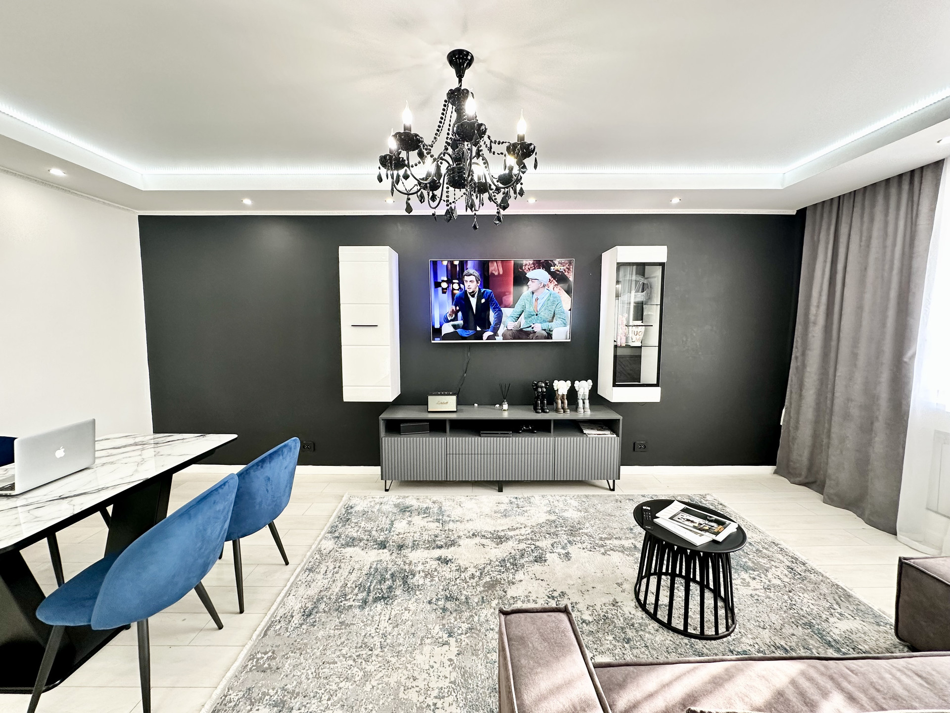 * Потолки в квартире подвесные и натяжные с зональным освещением.