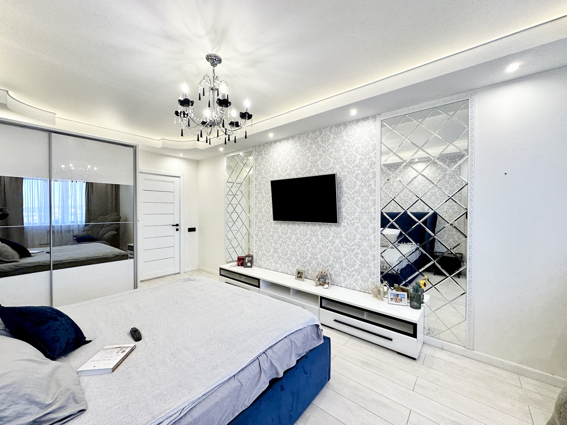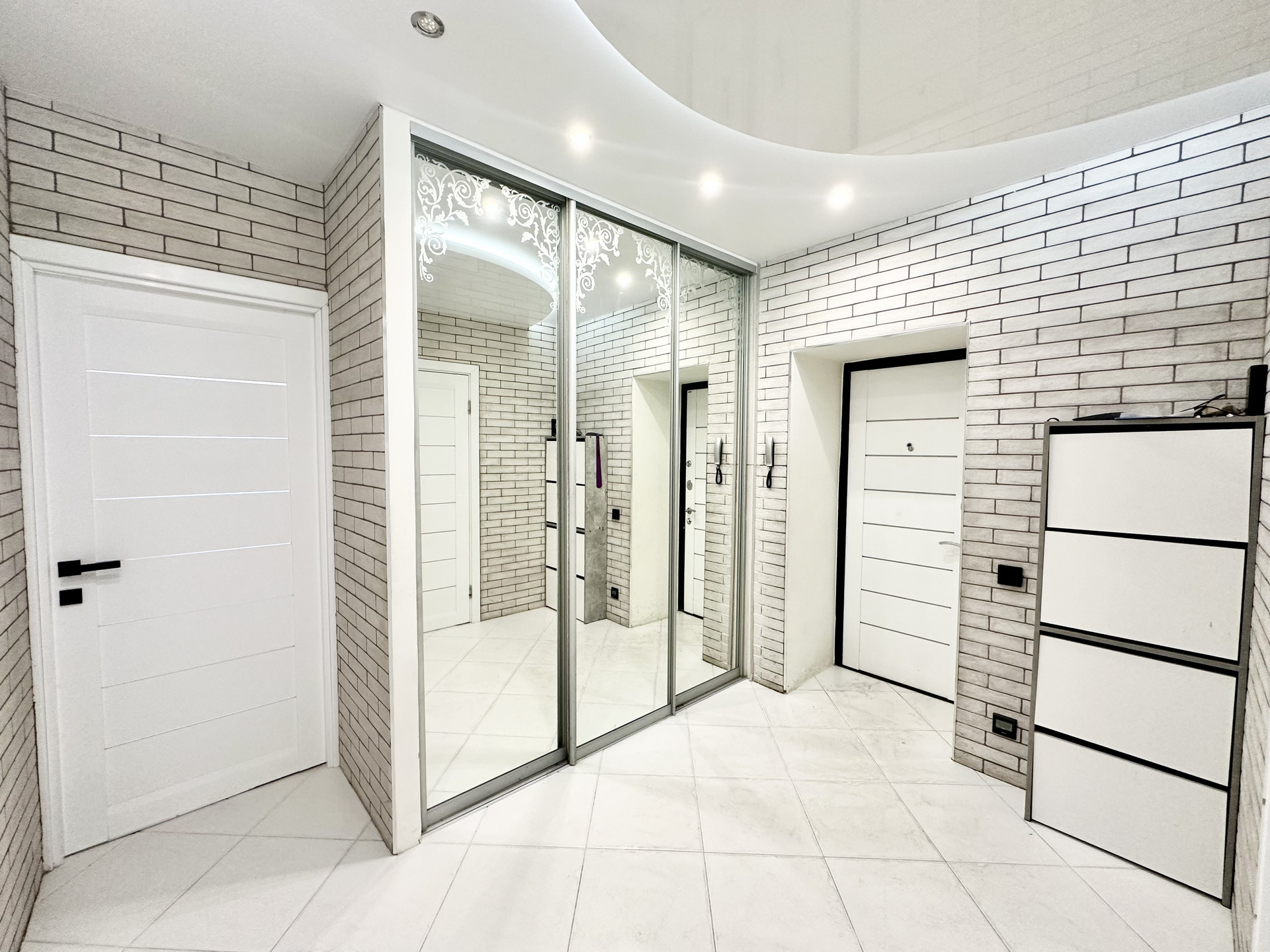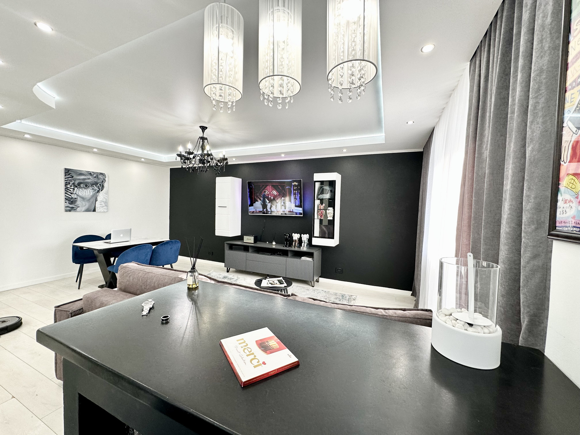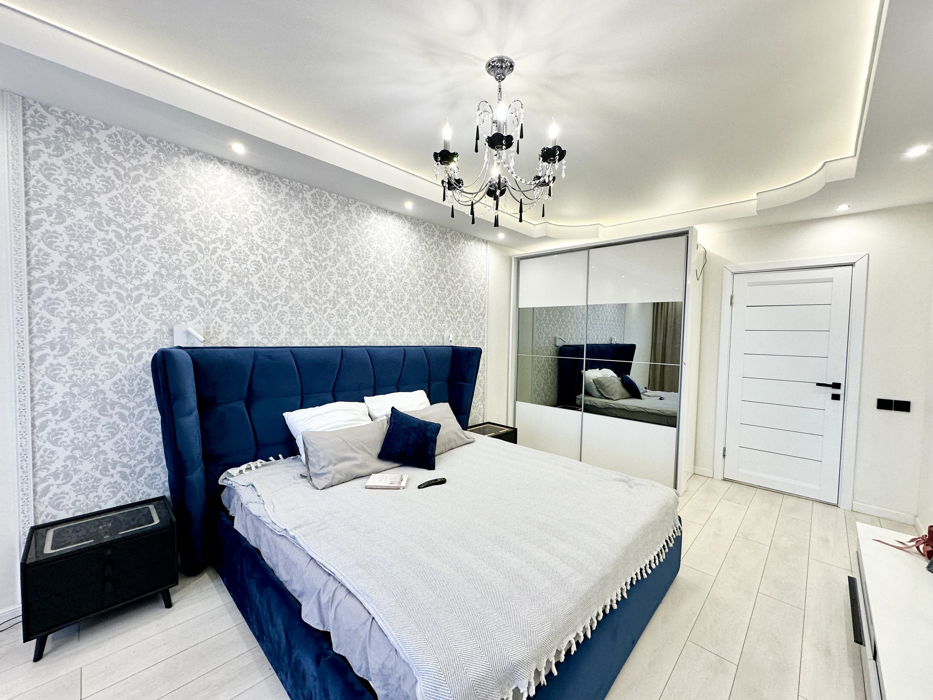 * Потолки в квартире подвесные и натяжные с зональным освещением.