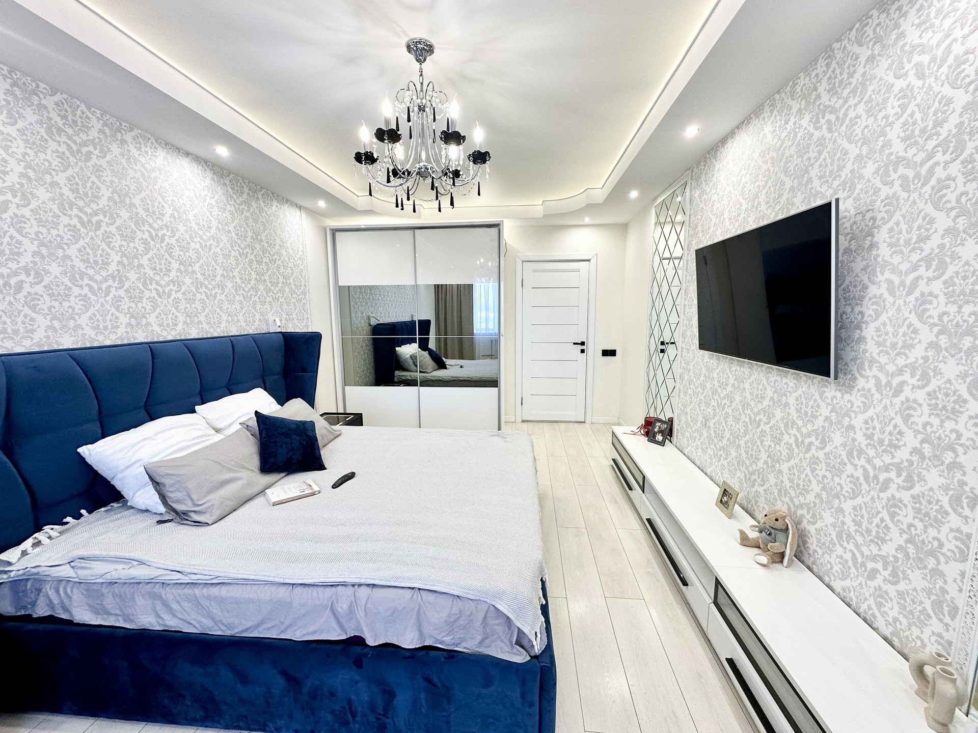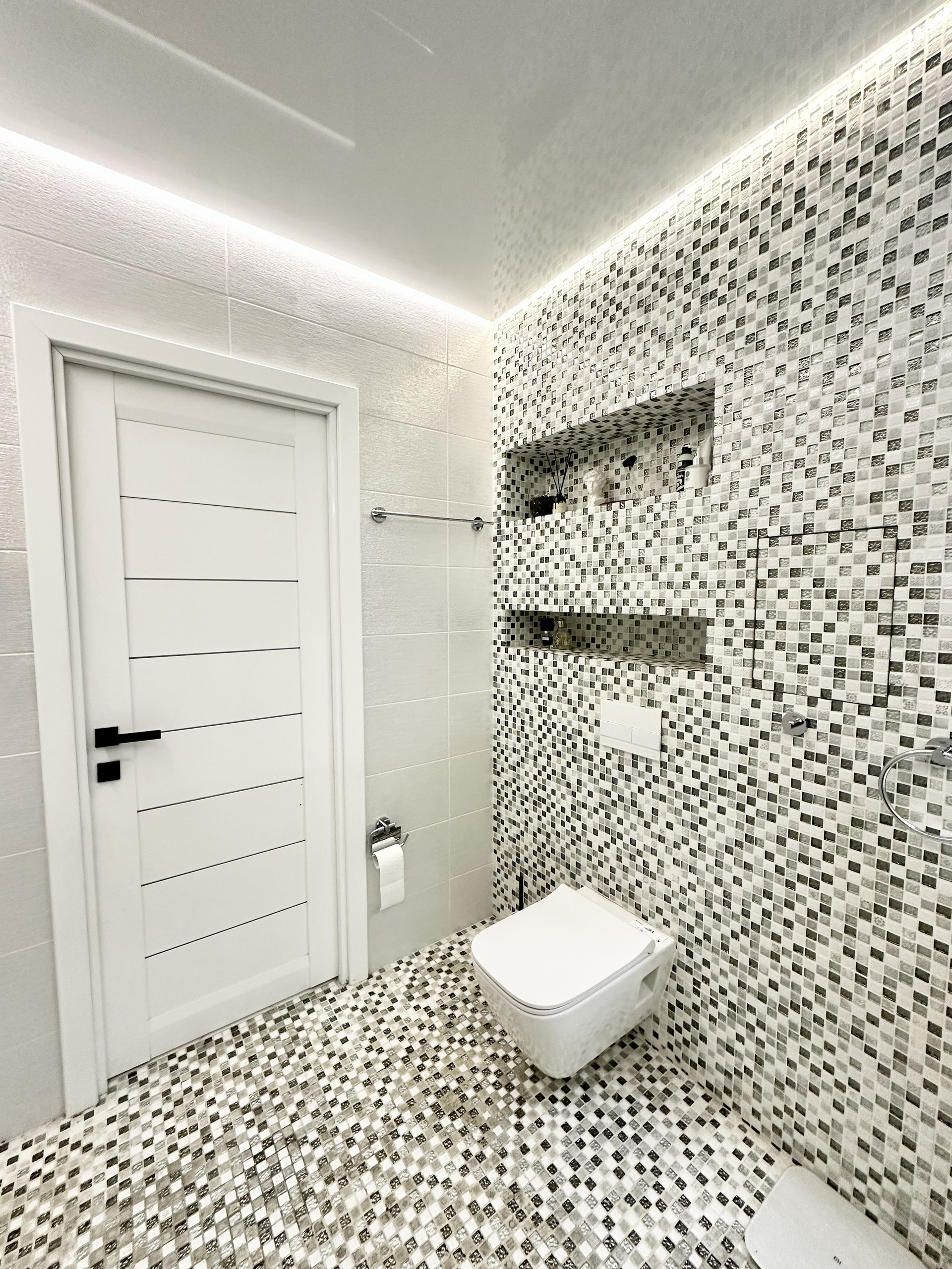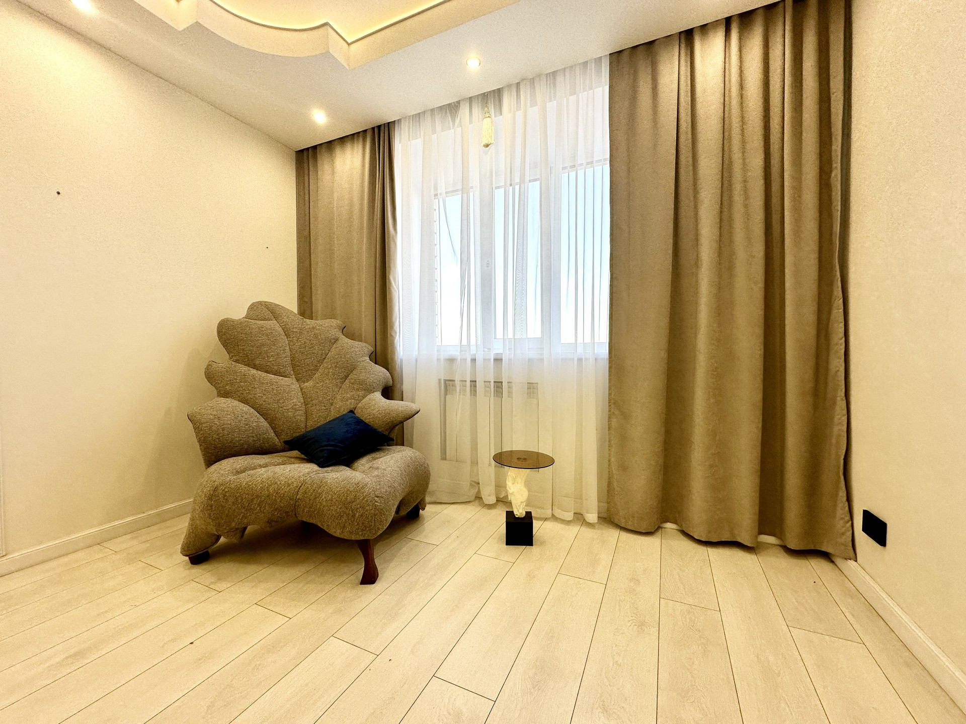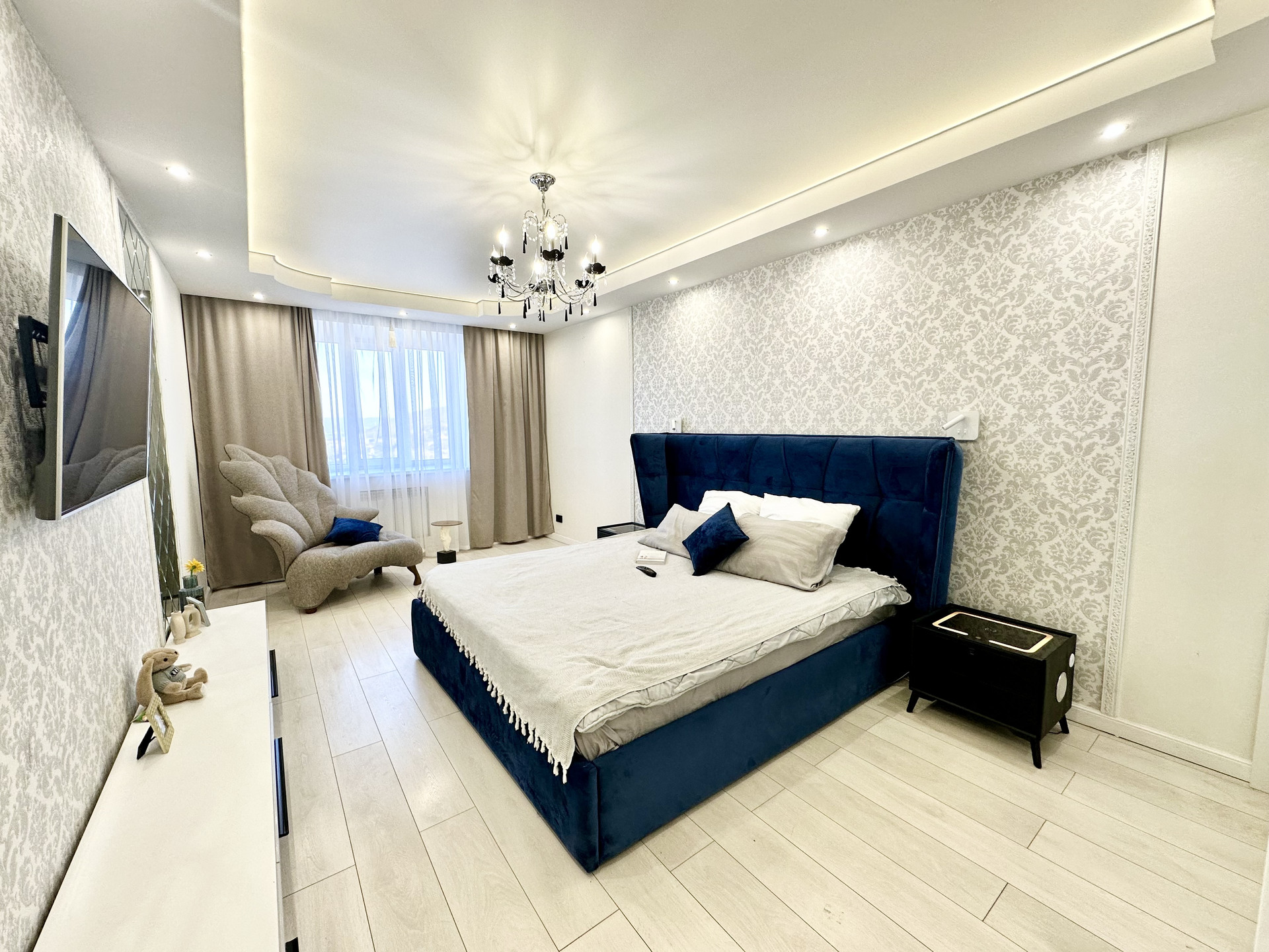 * Потолки в квартире подвесные и натяжные с зональным освещением.