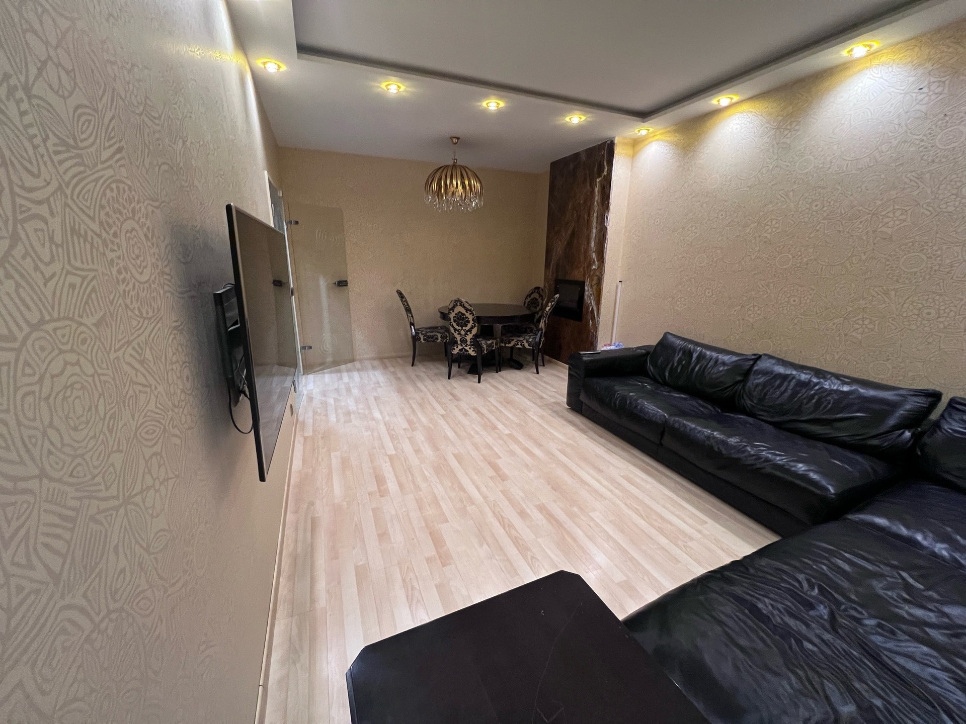 Гостинная комната просторная, есть зона столовой, большой диван, телевизор.