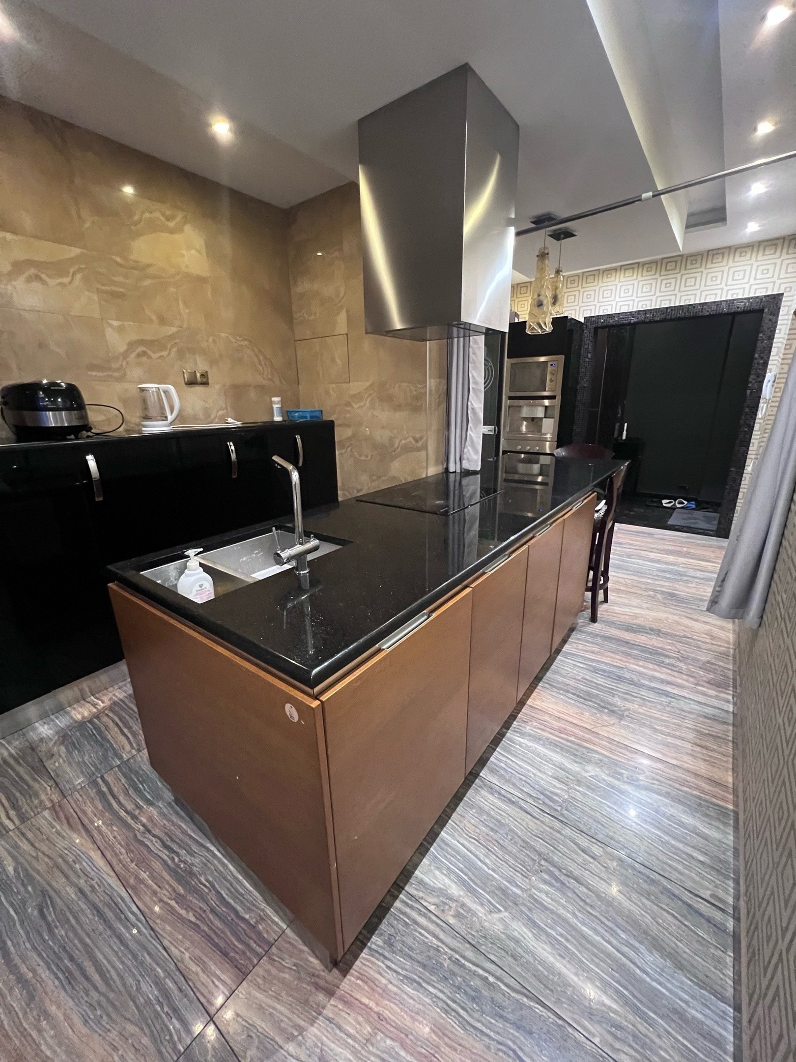 Кухня большая - мечта хозяйки, есть все необходимое: посудомоечная машинка, встроенный холодильник, духовка, микроволновая печь. кофемашина, варочная панель.