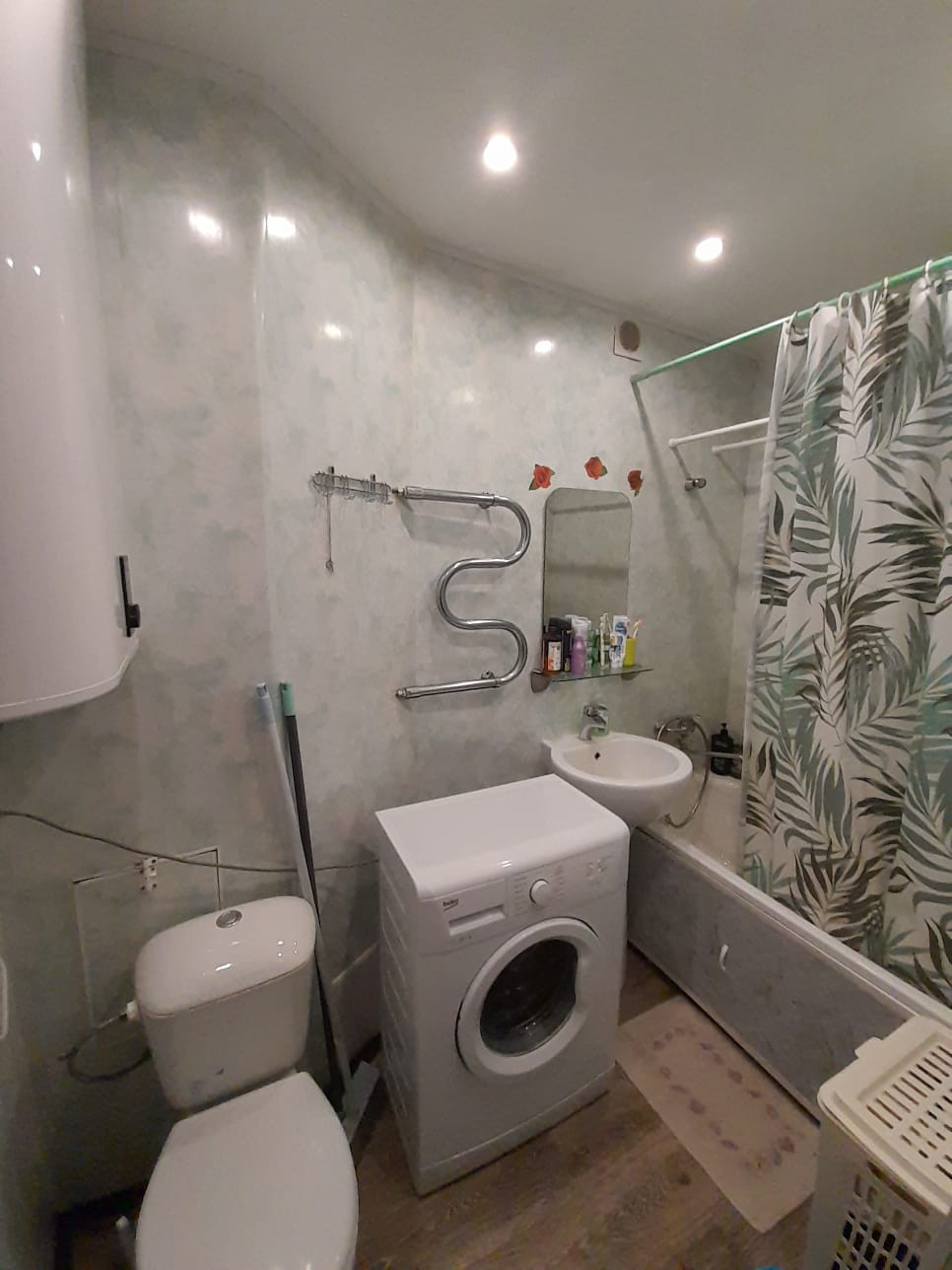 Санузел совмещён. Заменены эл. проводка, счётчики, трубы водоснабжения заменены на медные. Планируется замена стояков за счёт ТСЖ. Оставляем водонагреватель и стиральную машину.