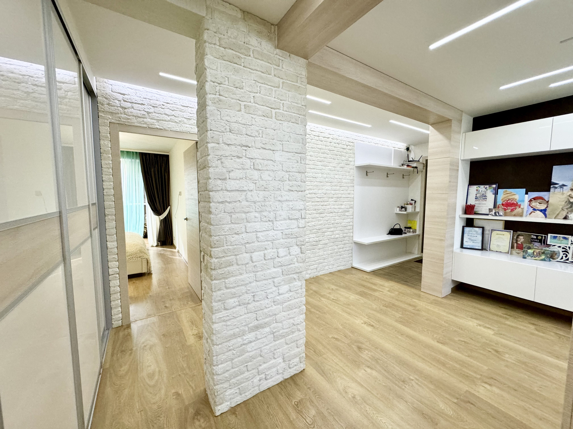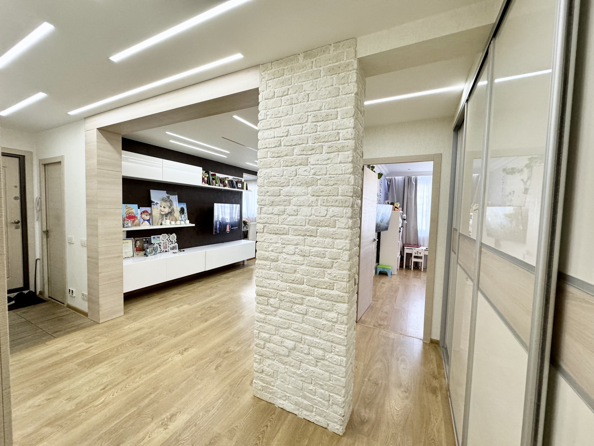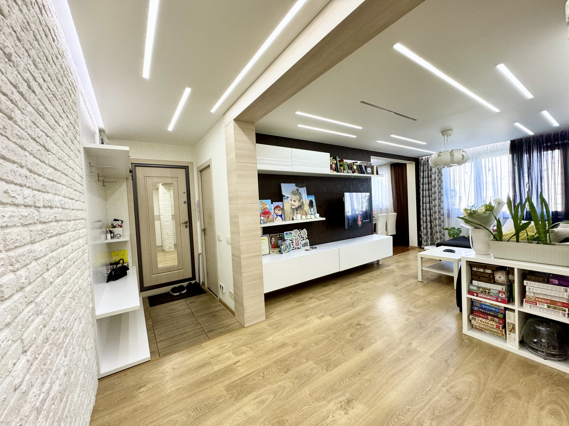 * По всей квартире натяжные и подвесные потоллки с точечным и зональным освещением.