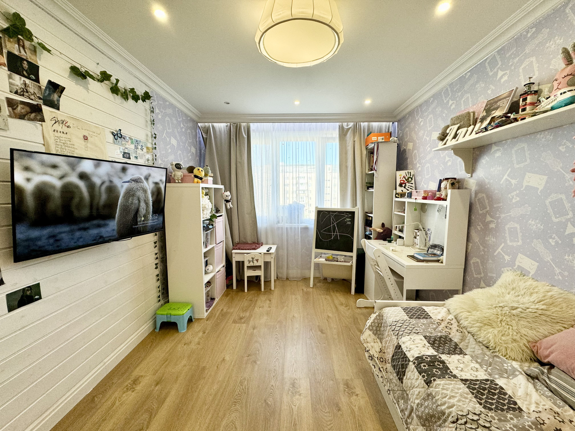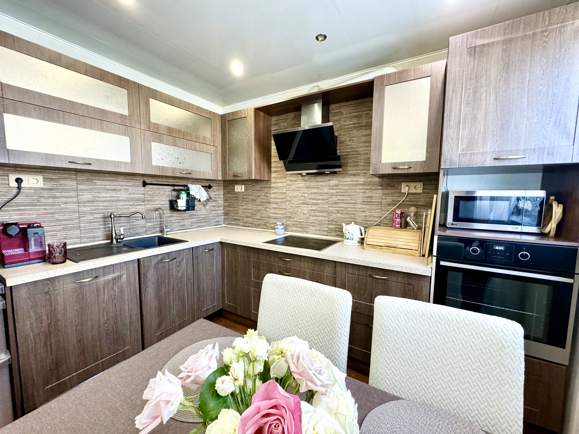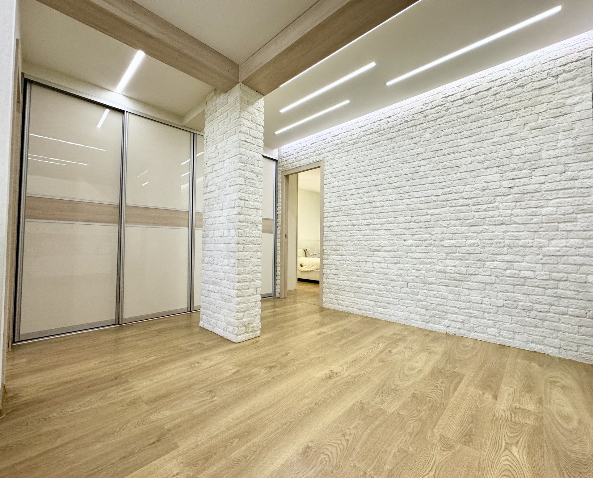 * По всей квартире натяжные и подвесные потоллки с точечным и зональным освещением.