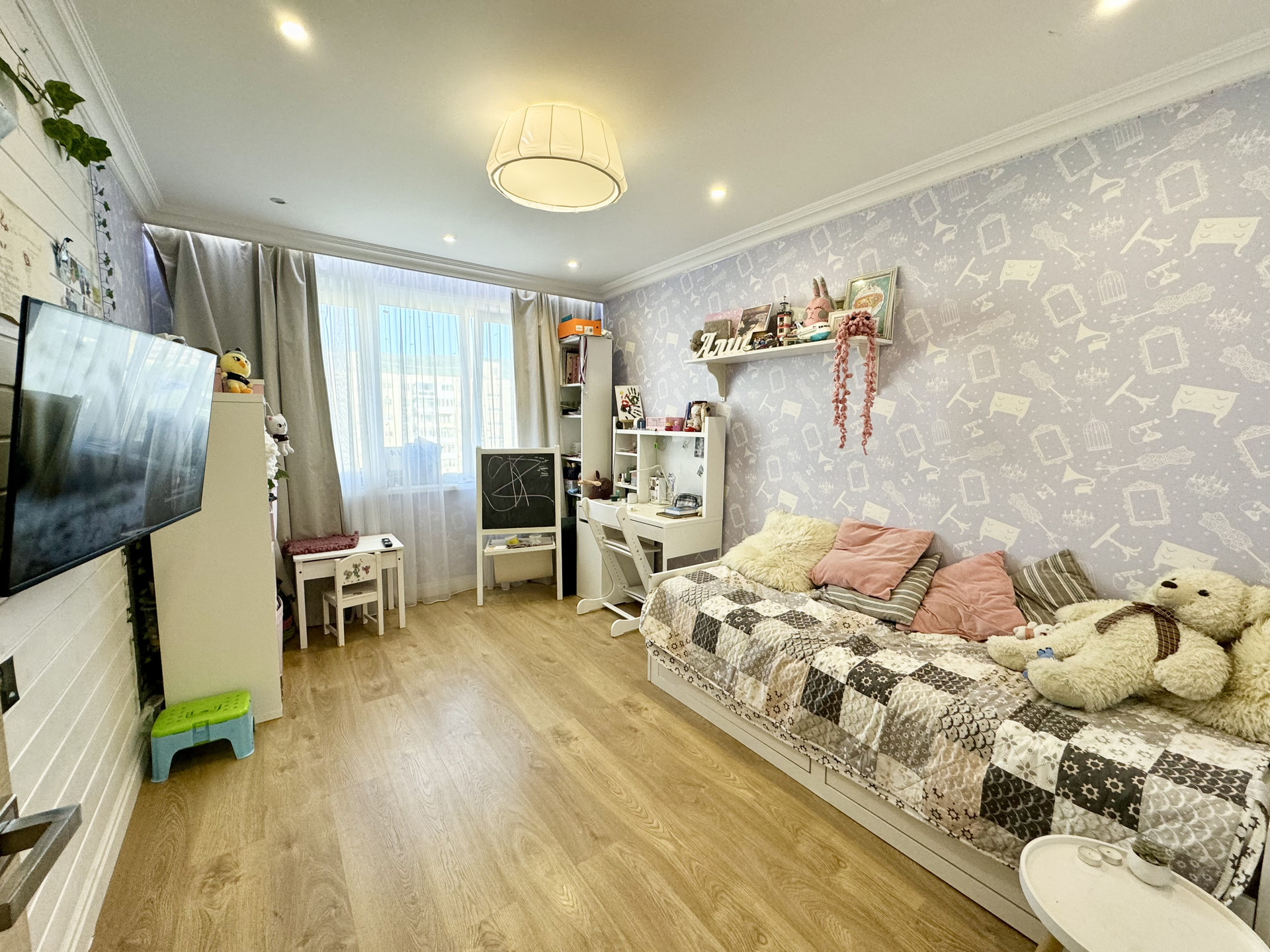 * В квартире сделана перепланировка (ПЕРЕПЛАНИРОВКА УЗАКОНЕНА):две комнаты изолированные на разные стороны, одна комната совмещена с кухней, сделана большая гардеробная, санузел совмещенный и увеличенный, лоджия совмещена с комнатой.
