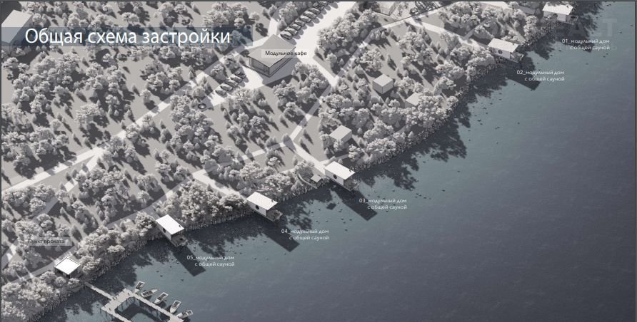 - Пять современных модульных домиков с саунными зонами, расположенных прямо на берегу озера;