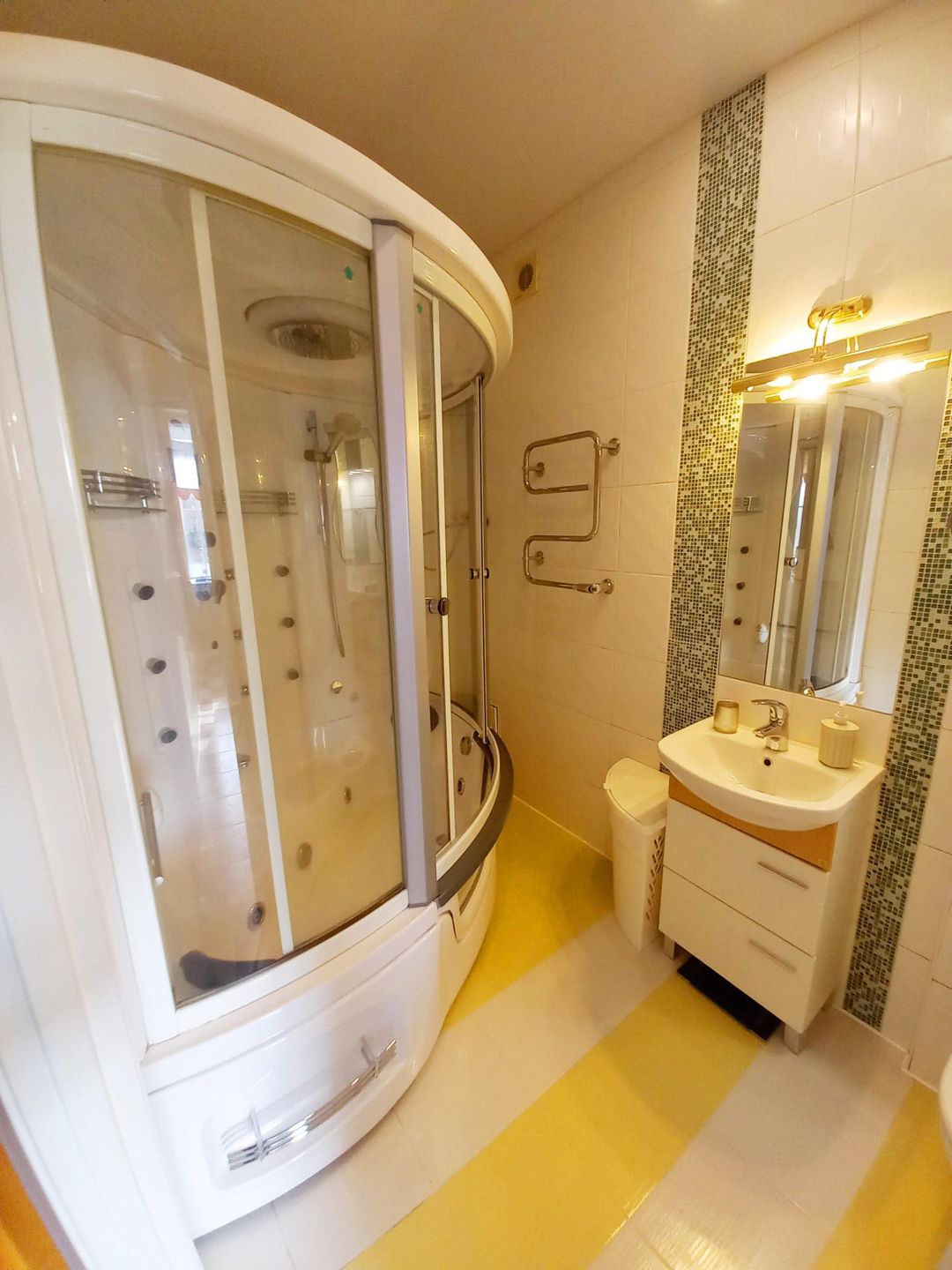 Удобный совмещенный с/у с классной душевой кабиной-ванной и местом для хранения средств для уборки.