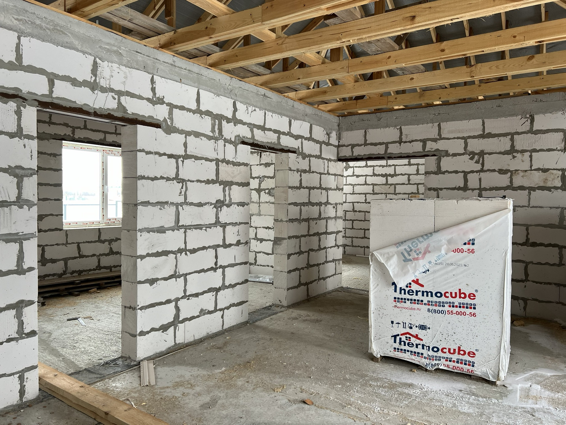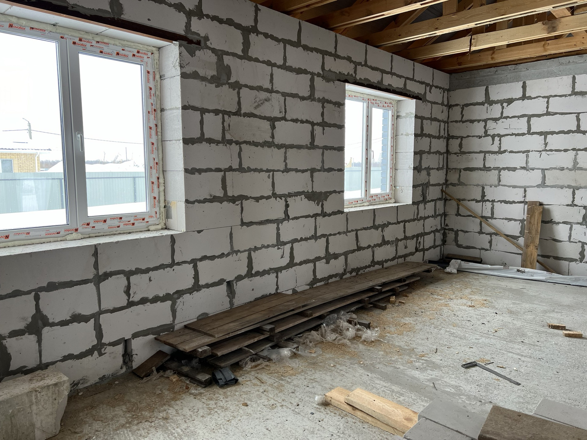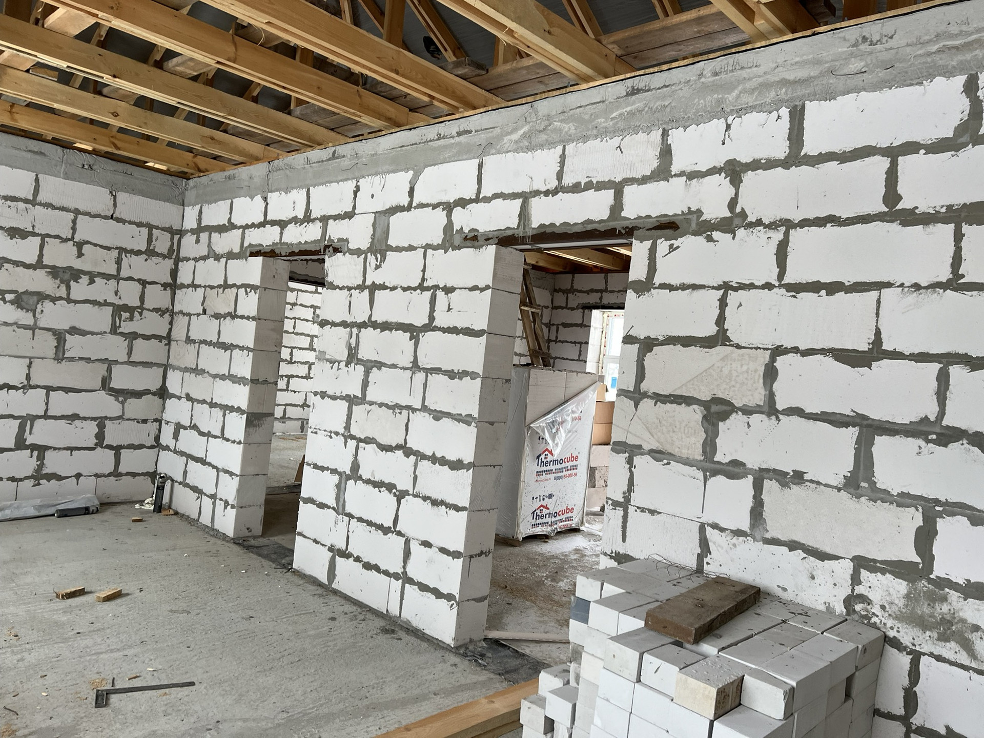 Фото и видео создания фундамента при встрече покажу. Стены из газосиликатного блока 375 ширины, наружняя отделка кирпичом. Армопояс по верху стен. Балки крыши двойные (видно на фото).