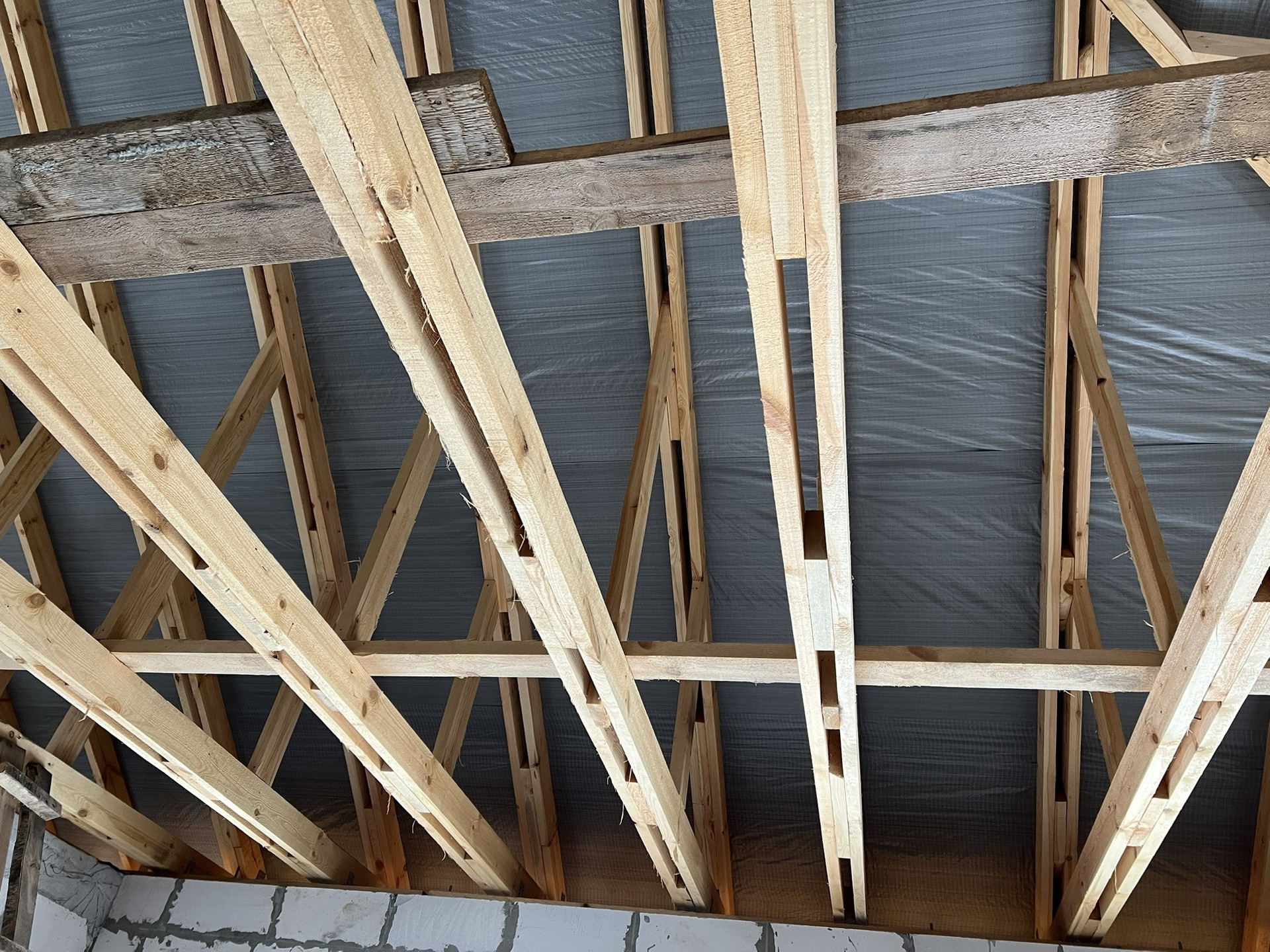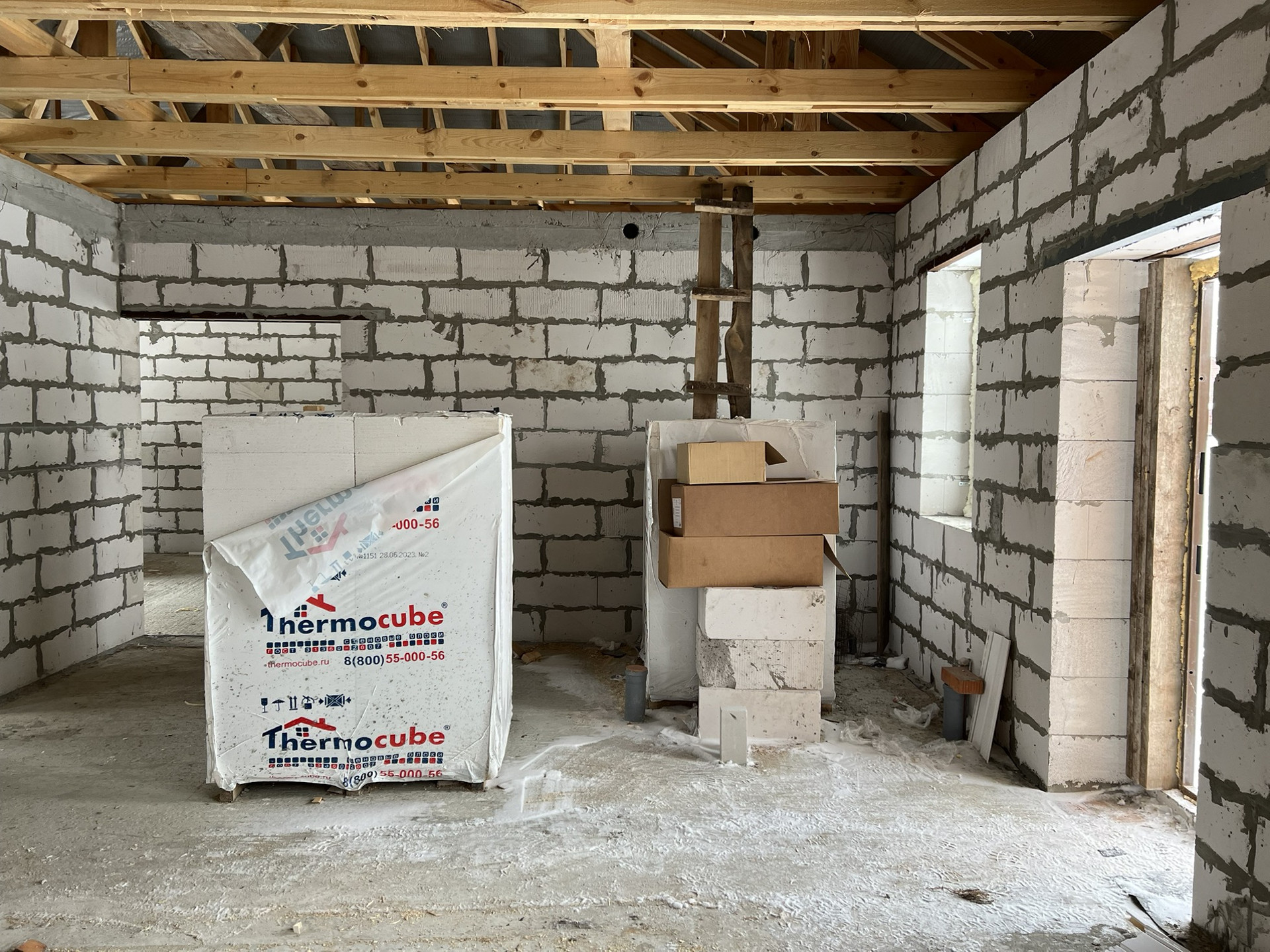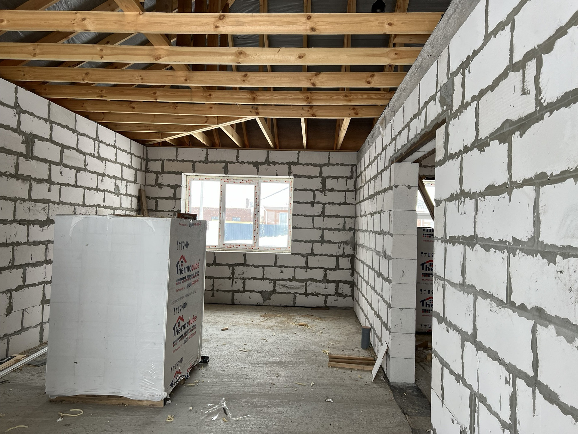 Фото и видео создания фундамента при встрече покажу. Стены из газосиликатного блока 375 ширины, наружняя отделка кирпичом. Армопояс по верху стен. Балки крыши двойные (видно на фото).