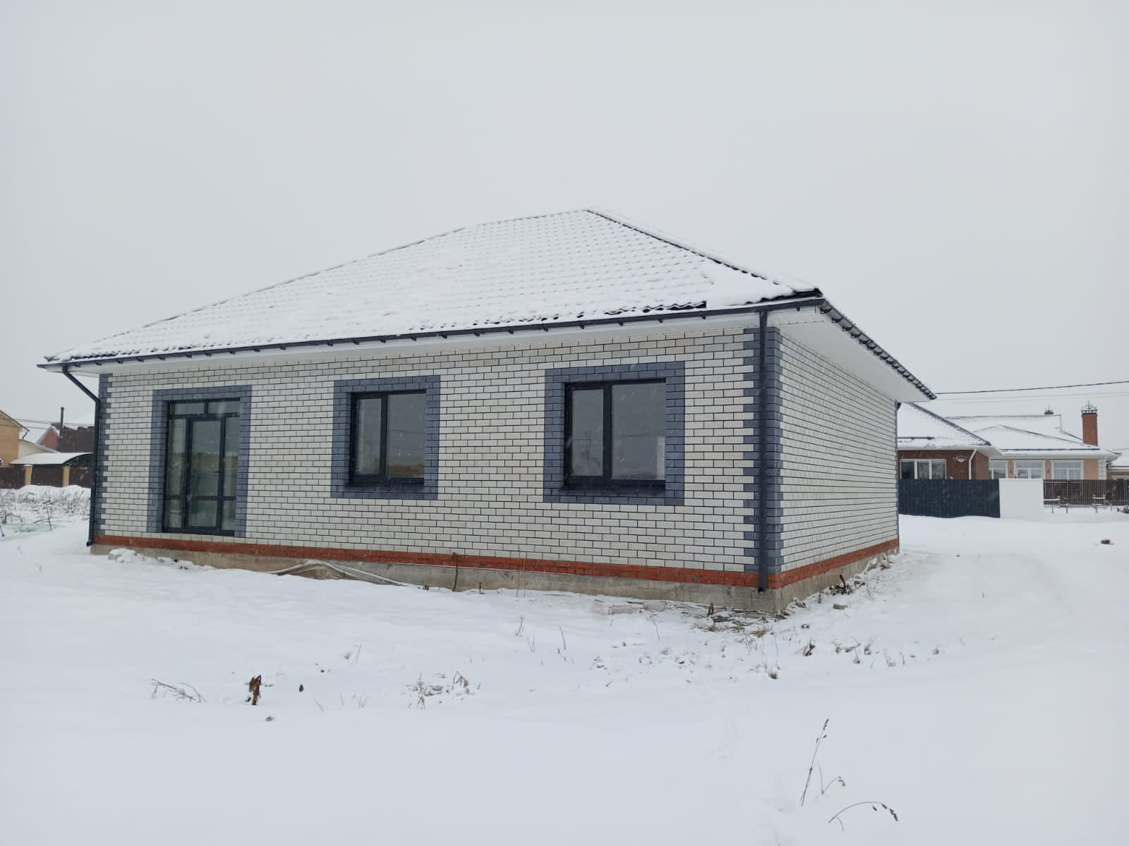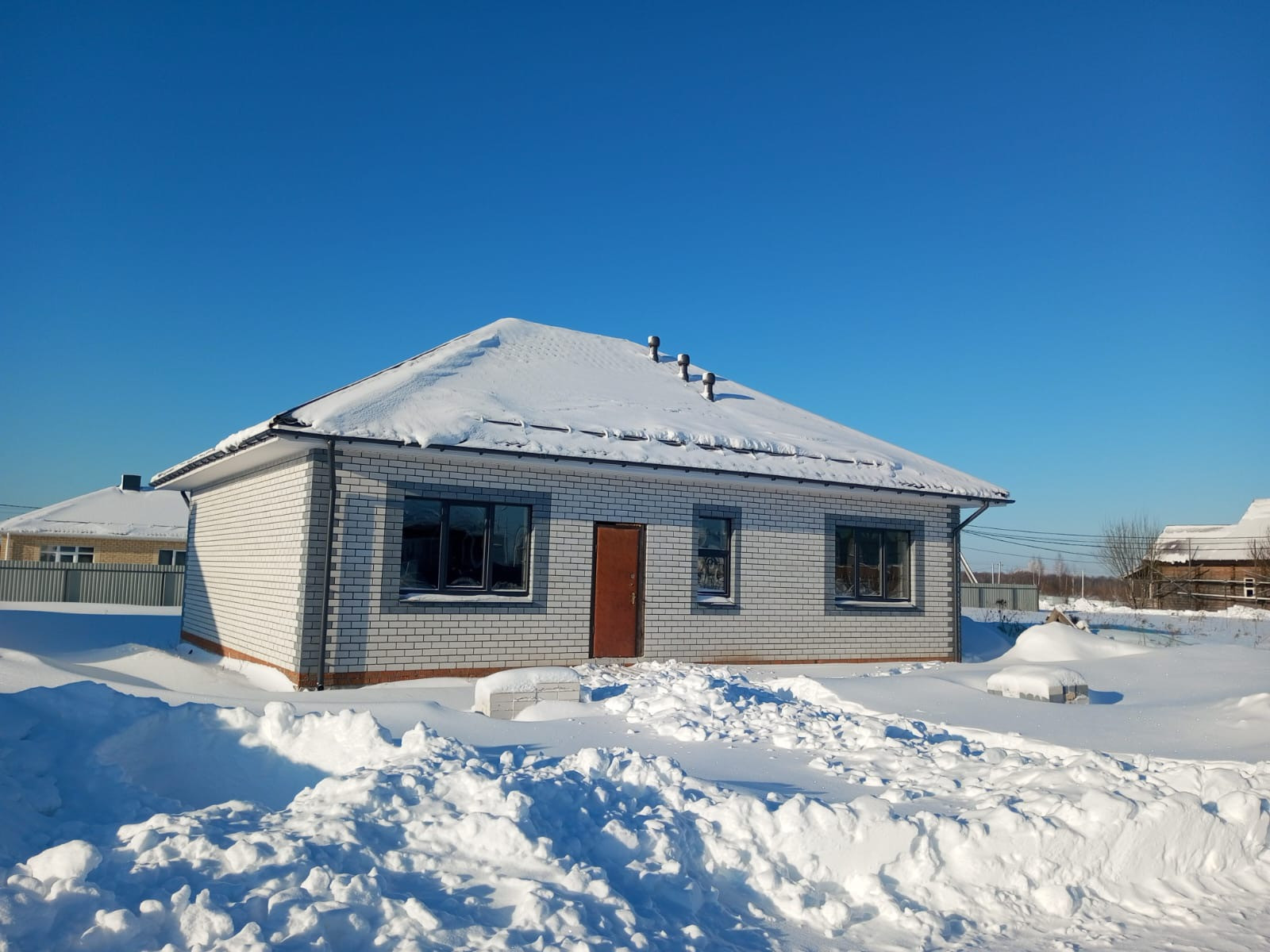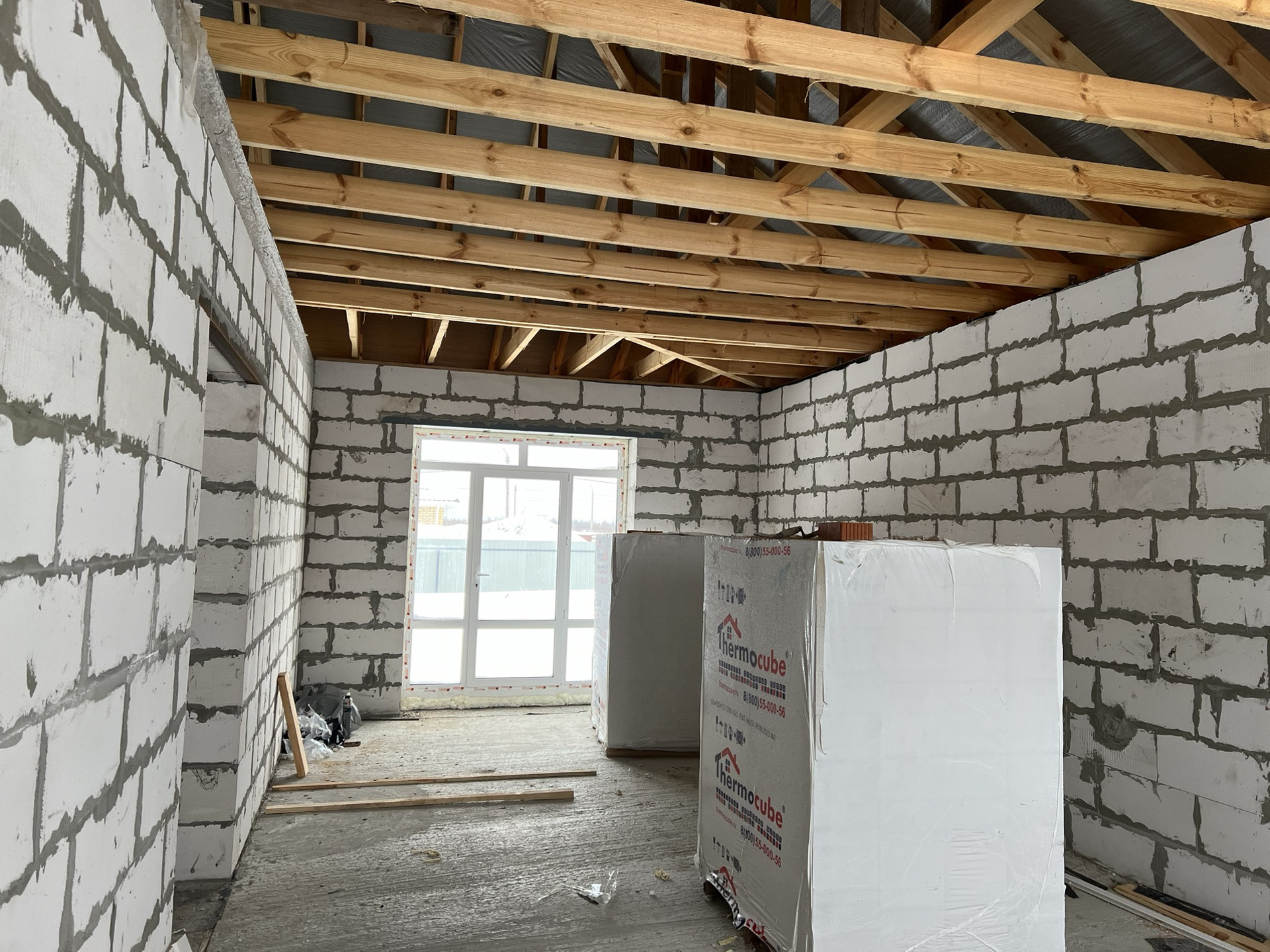 Перегородки будут сделаны весной по нашему проекту, либо можем сделать по вашему желанию за наш счет. Крыша покрыта металлочерепицей Grand Line 0,5 толщины. Установлены ламинированные стеклопакеты. Дверь временная.