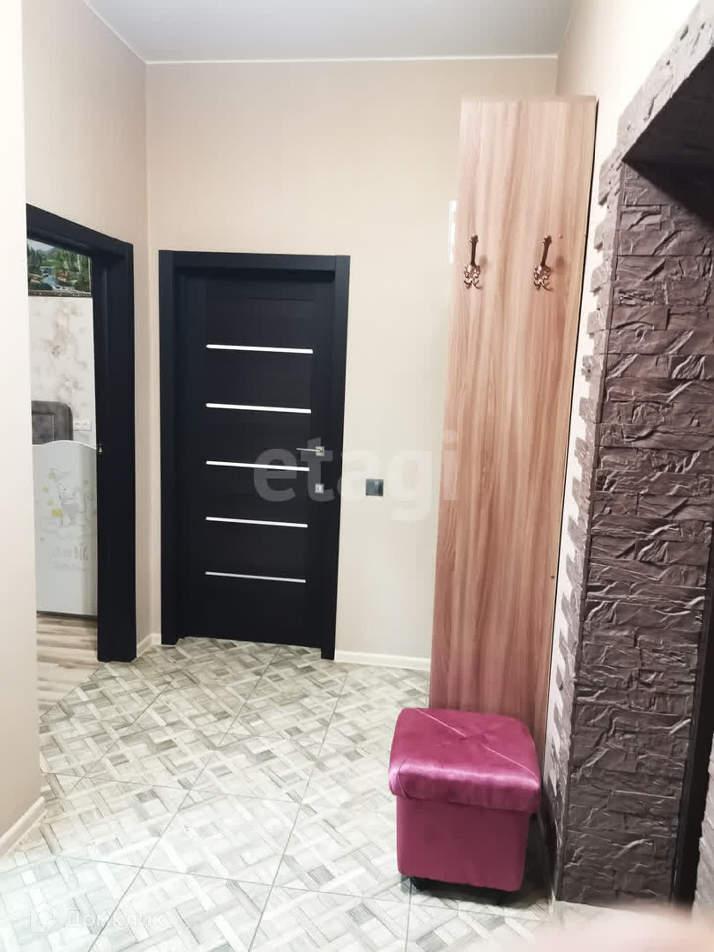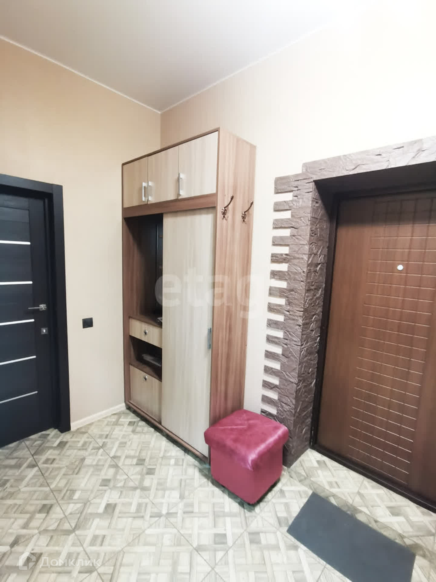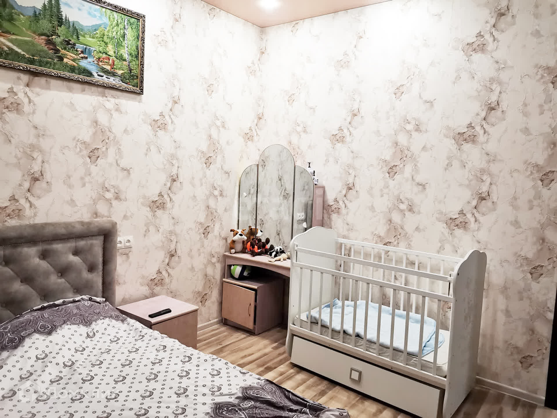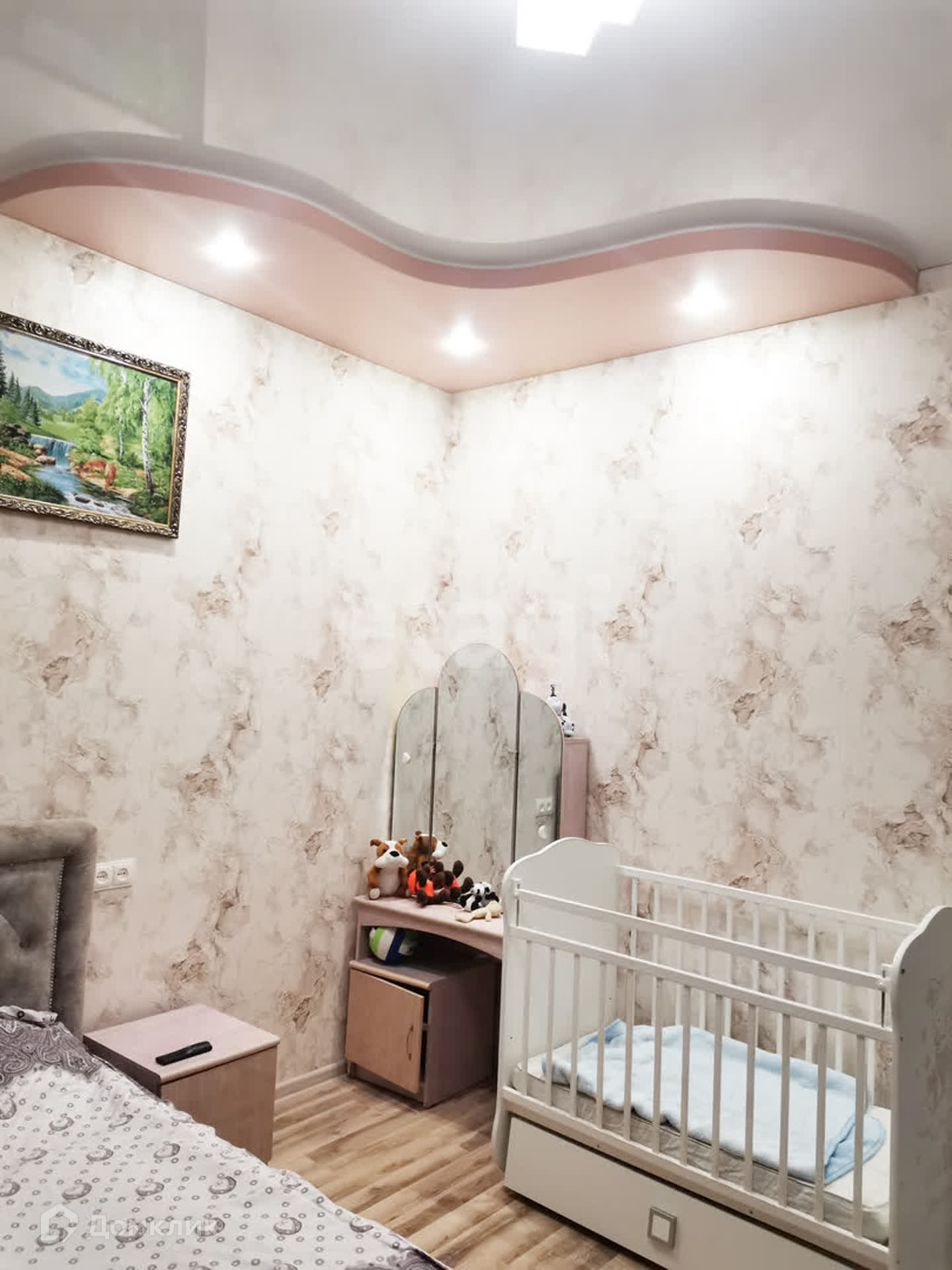 В квартире современный ремонт, все стены выровнены по маякам, натяжные потолки с встроенными светильниками.